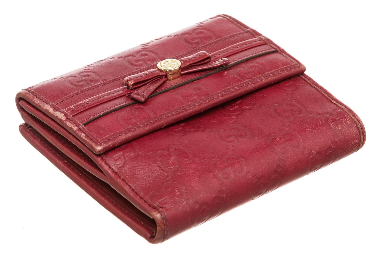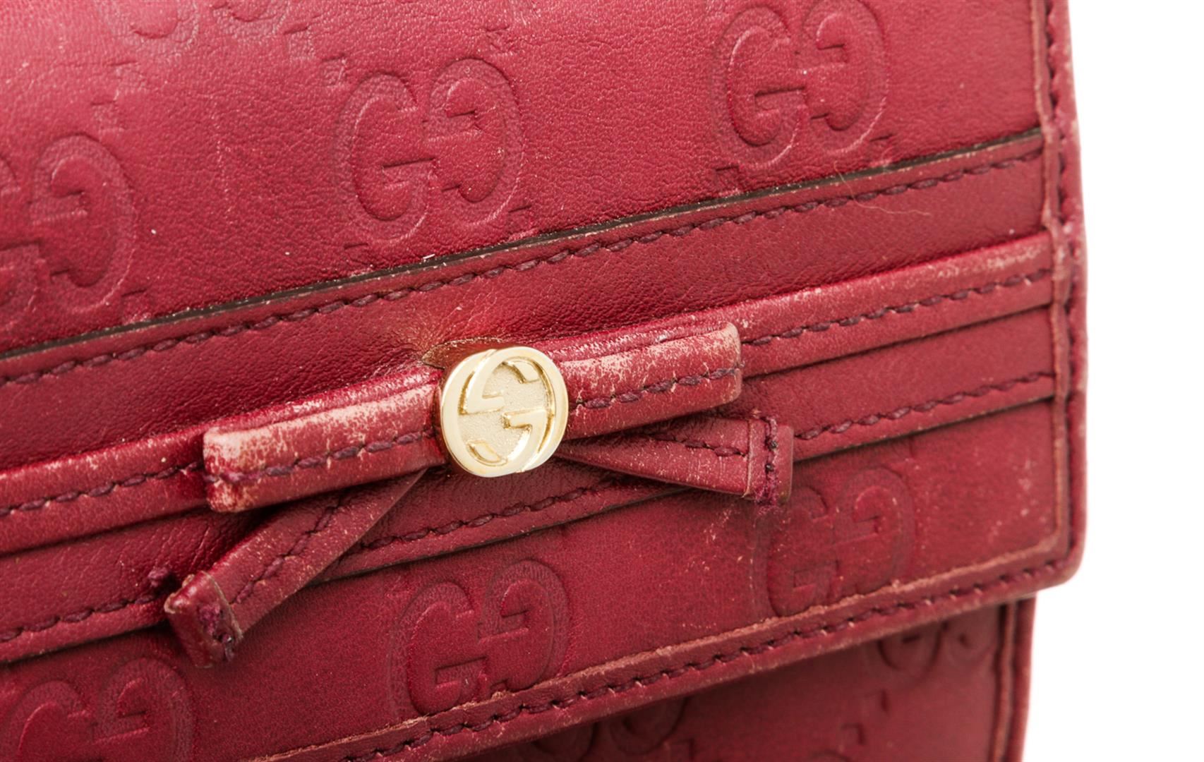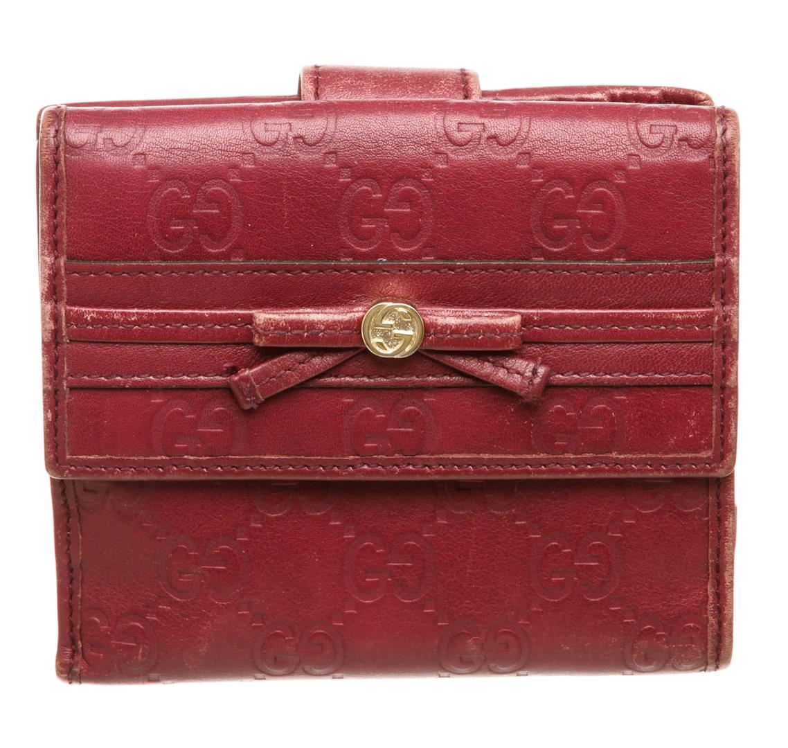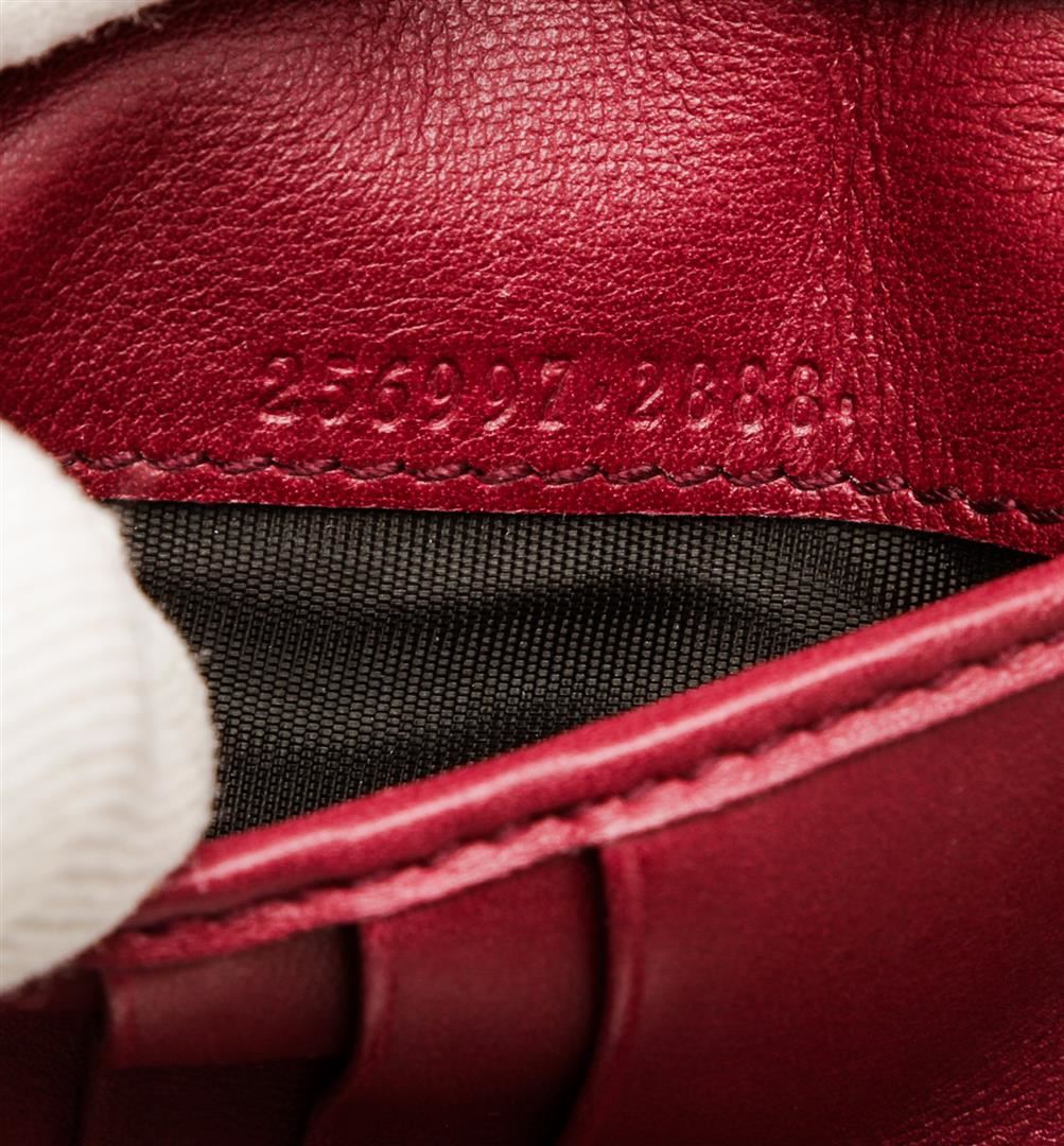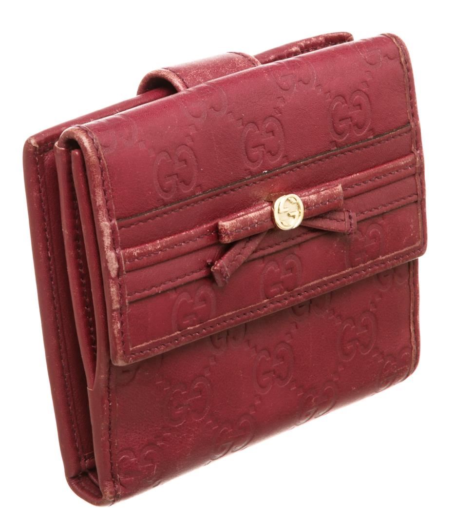 Dark Red Guccissima leather Gucci French purse with gold tone hardware, single exterior coin compartment with snap closure at flap, tonal leather lining, dual slip pockets at interior walls, dual bill compartments, ten card slots and snap closure at top strap.