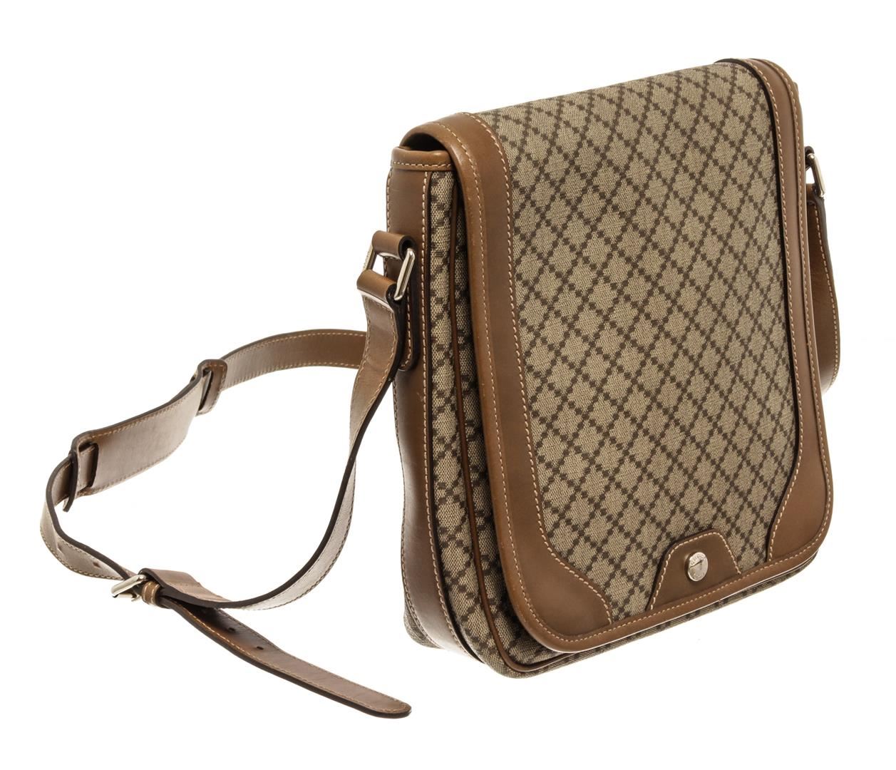 One Gucci Diamante Shoulder Bag. Item is sold AS-IS. All available information is listed in the description and shown in the photo. Gucci Diamante shoulder bag with diamond patterned canvas exterior, brown leather trim, adjustable strap, flap and snap button closure, beige fabric lining, two interior slip pockets, and one interior zip pocket.