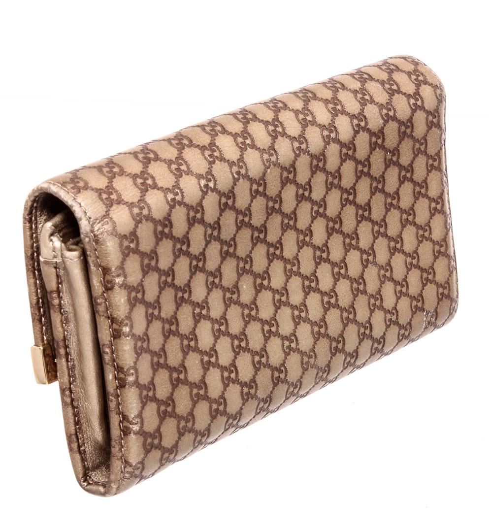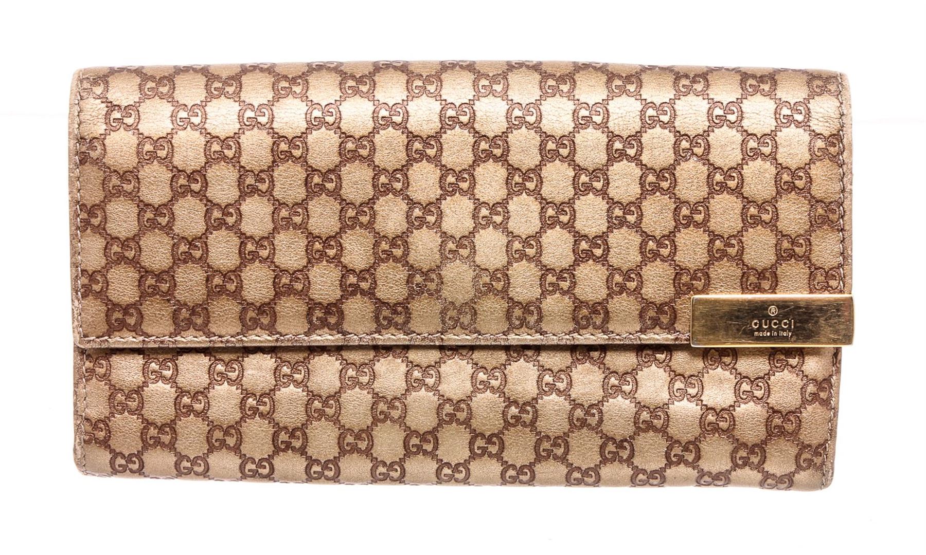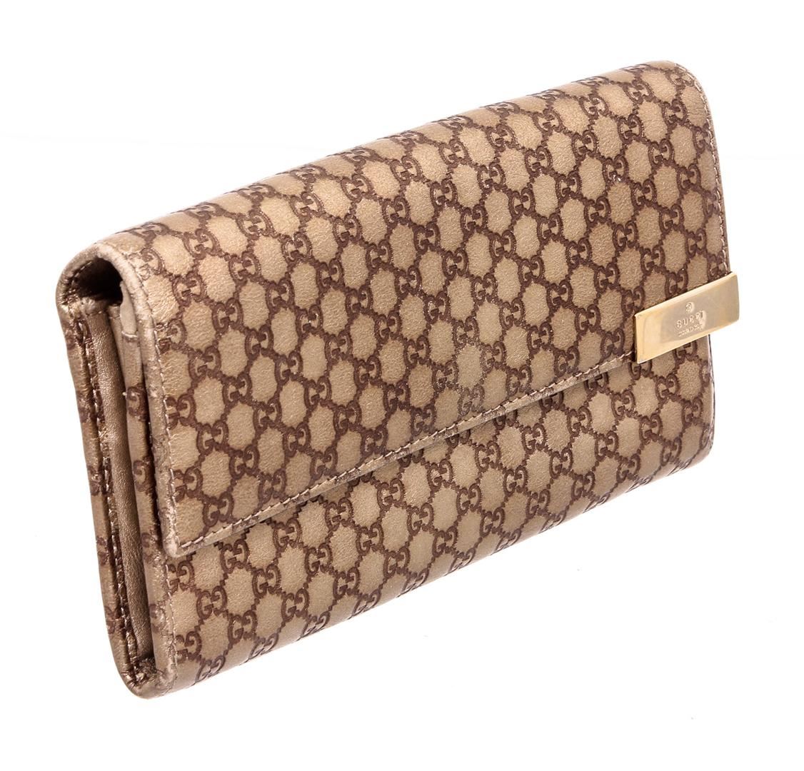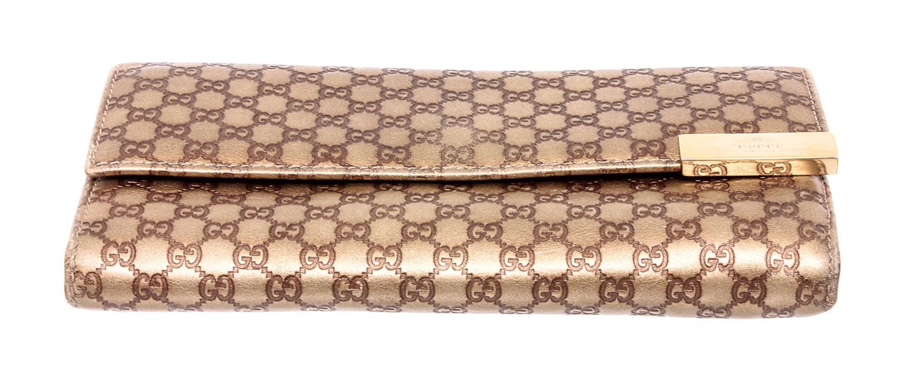 Gucci Gold Leather Mini Guccissima Flap Wallet with gold-tone hardware, logo placard at front face, brown interior canvas lining, three interior pockets; one with zip closure, twelve card slots and overall snap closure at top.