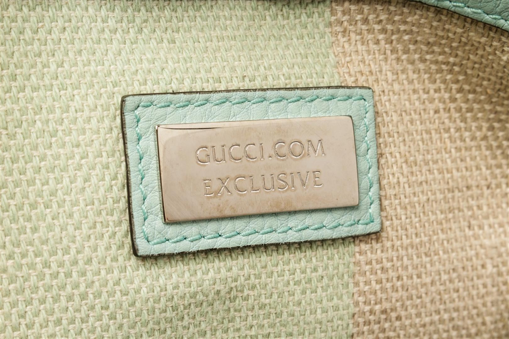 Gucci Green Leather Daily Bamboo 2Way Satchel Bag. All available information is listed in the description and shown in the photos. with hardware silver-tone, a dark brown bamboo turn-lock and is lined in pastel rose colored striped canvas with one zip pocket against the back and two small open pockets against the front. comes with a detachable shoulder-strap. Height: 9.8" Width: 15.6" Depth: 5.9", Handle Drop: 4.3" / 25 x 40 x 15 Cm
