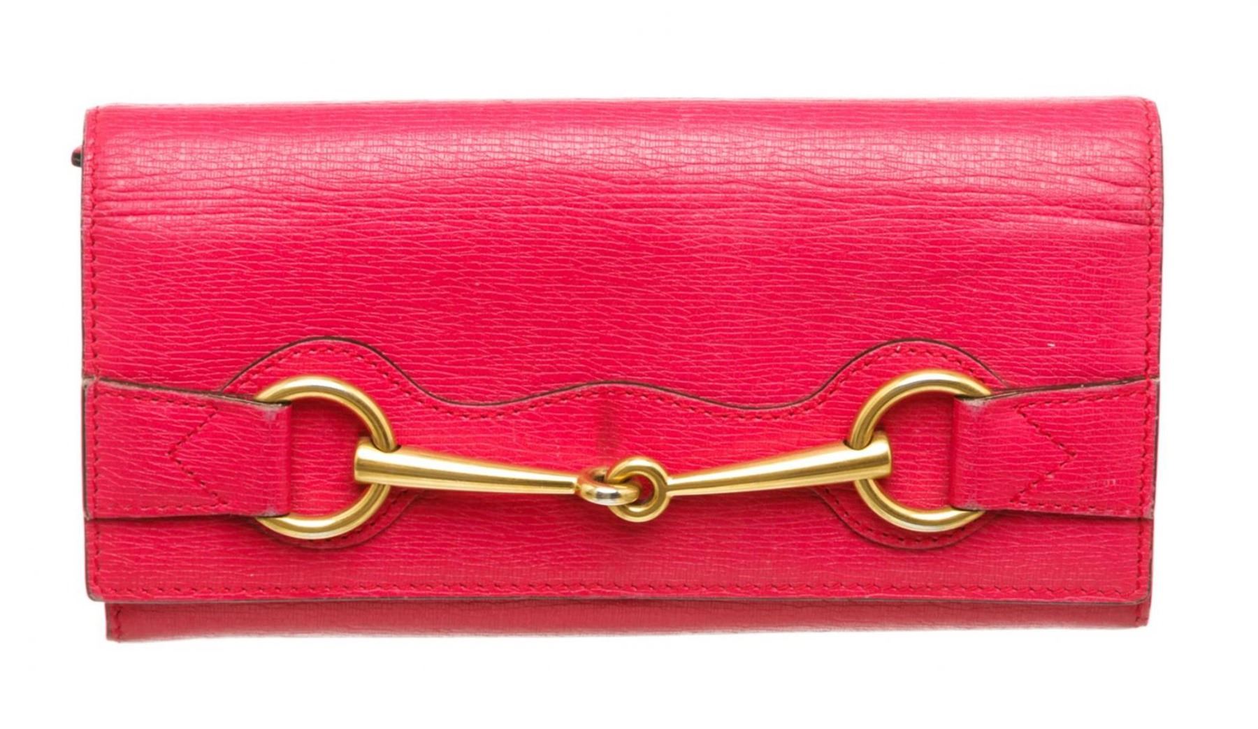 Hot Pink leather Gucci Bright Bit wallet with antiqued gold-tone hardware, Horsebit embellishment at front, single slit under front flap, tonal leather and woven lining, three compartments; one with zip closure, dual bill compartments, twelve card slots and snap closure at front flap. Authentic.