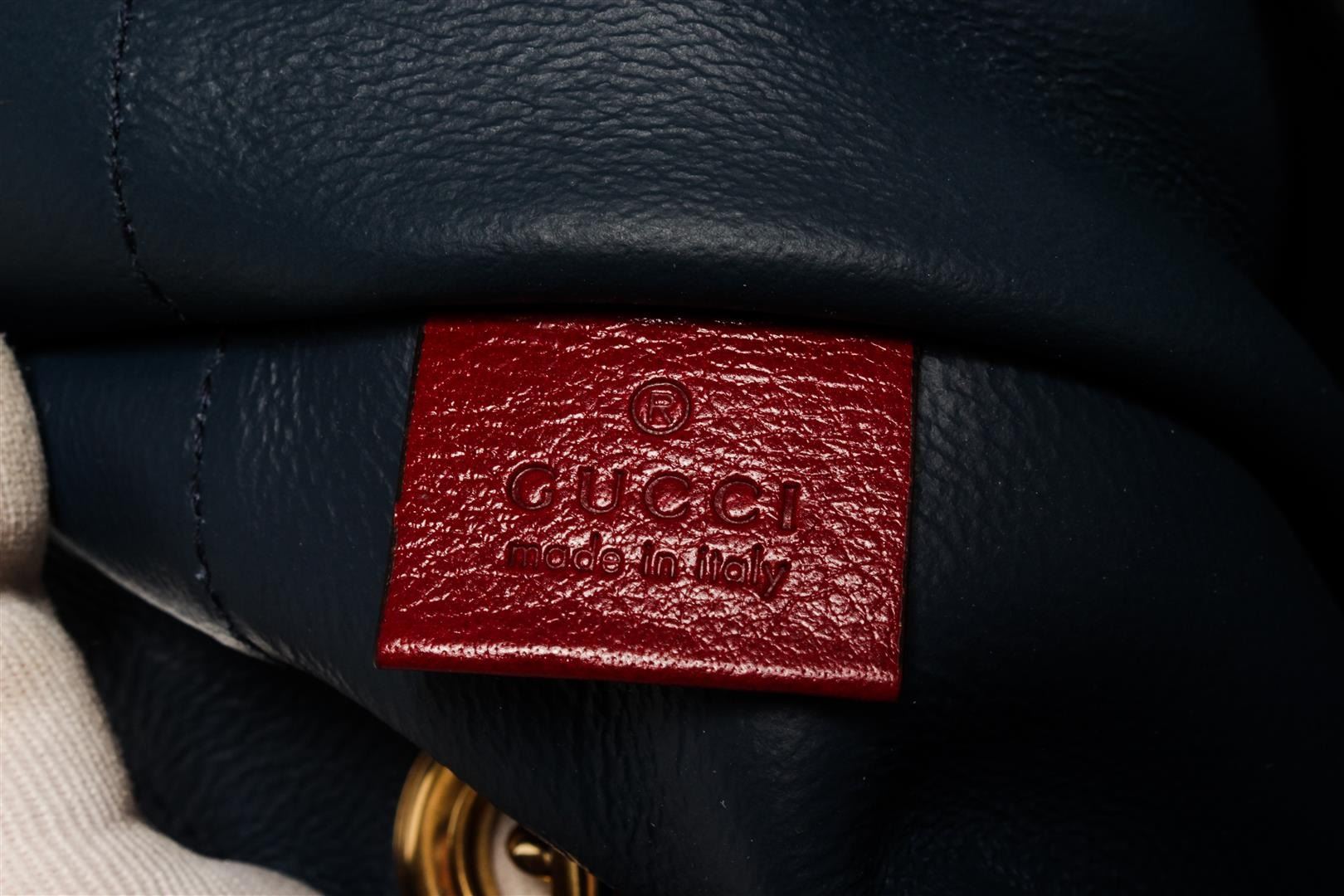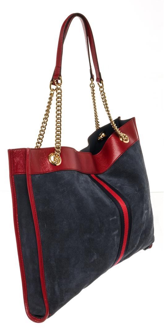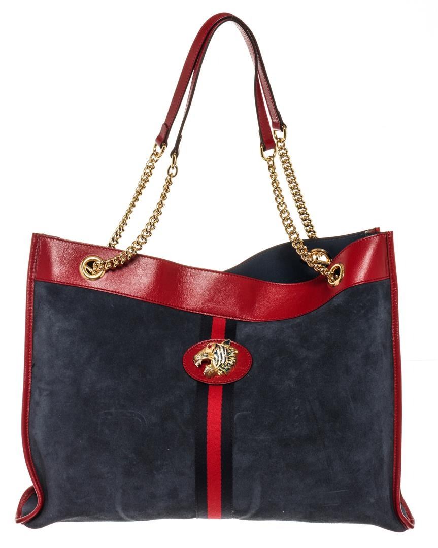 One Gucci Large Rajah Tote. Item is sold AS-IS. All available information is listed in the description and shown in the photo. Gucci Large Rajah Tote Navy Suede Red Leather. Features gold hardware, red leather straps, blue leather interior, and a gold zipper closure.