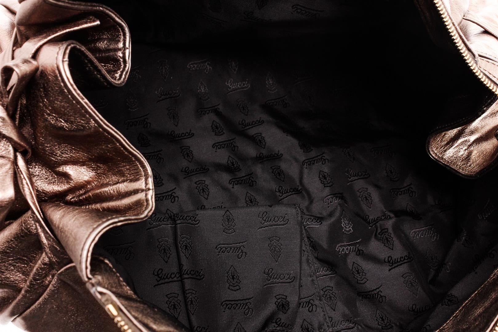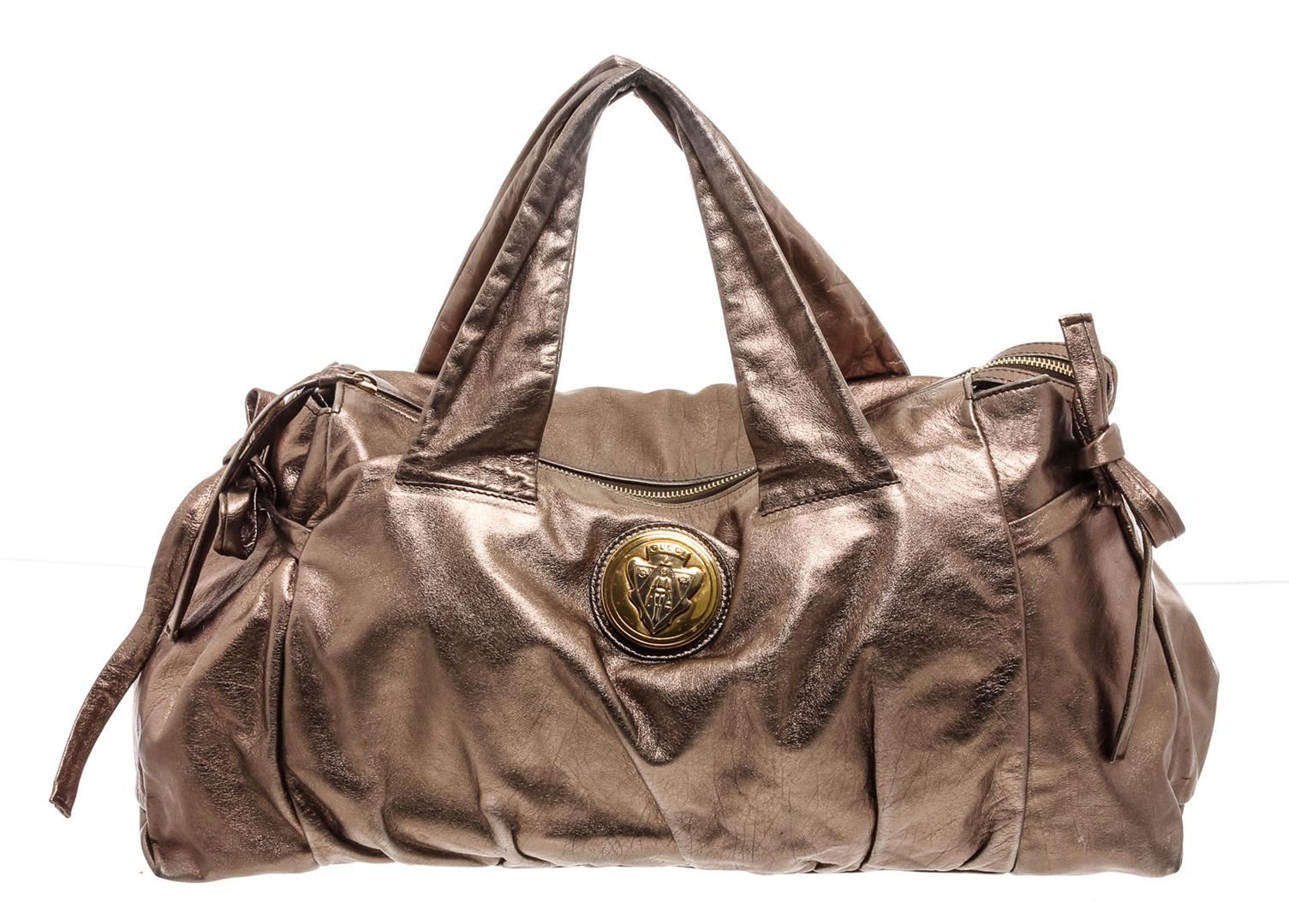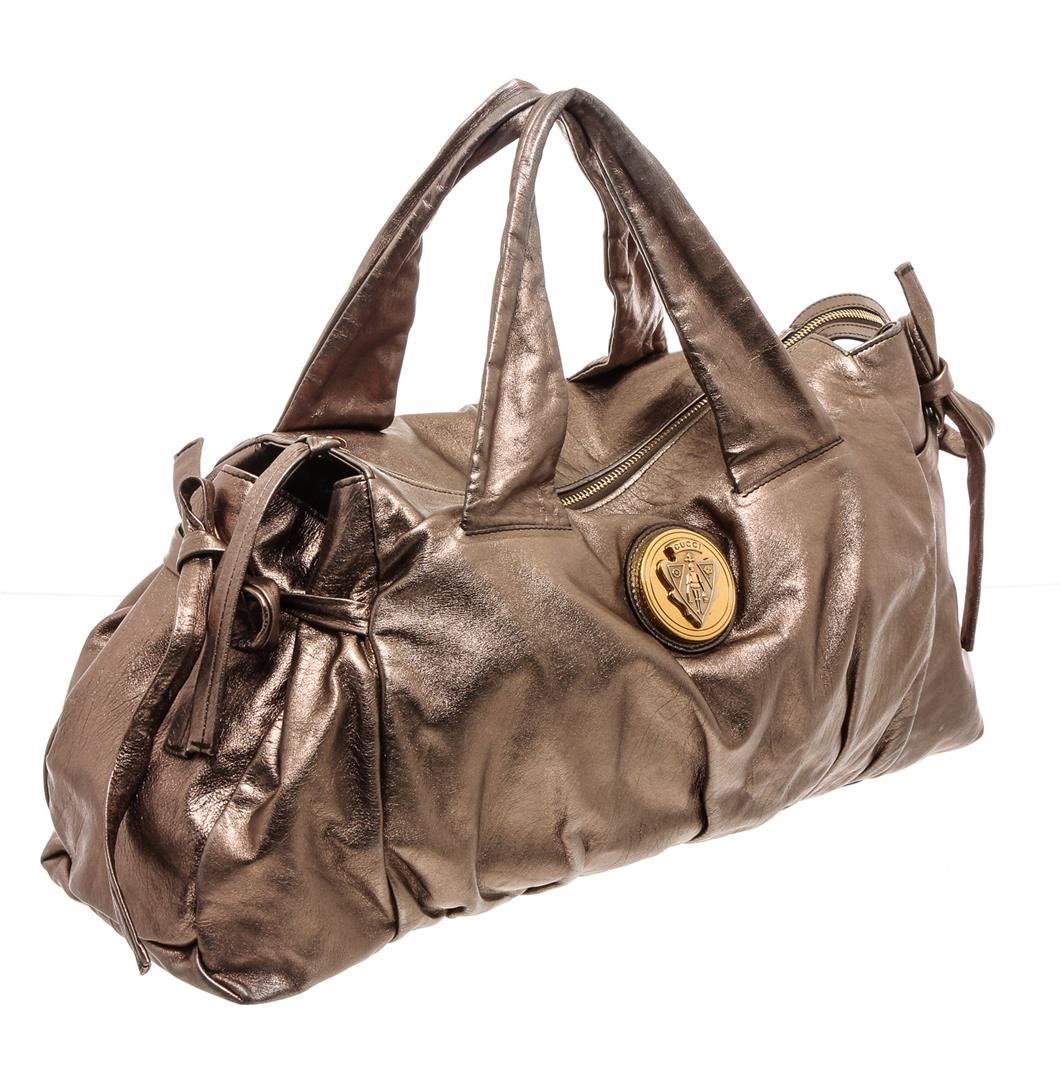 Metallic grey large leather Gucci Hysteria bag with gold-tone hardware, dual flat top handles, black nylon lining, three pockets at interior wall; one with zip closure and zip-closure at top.