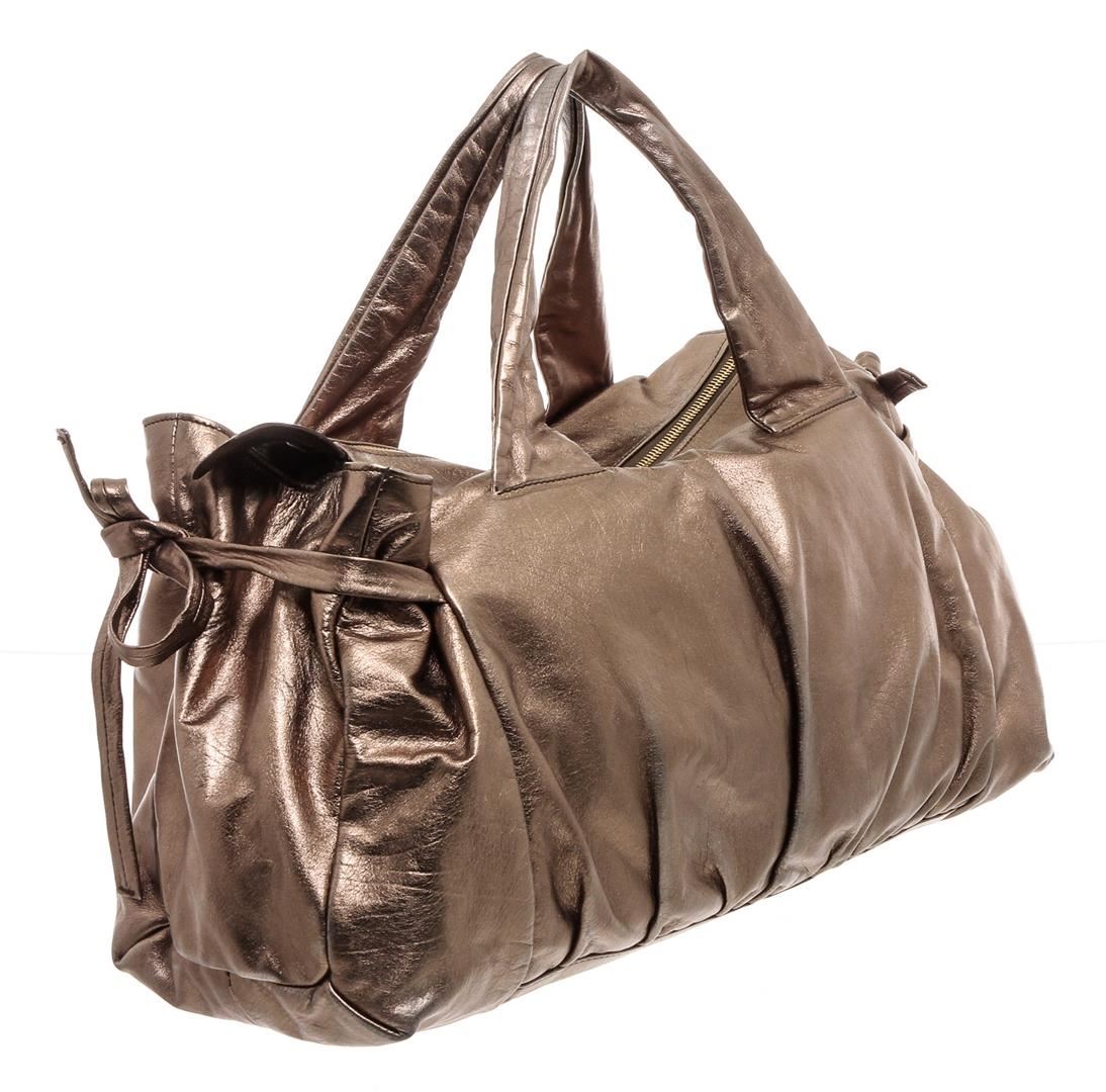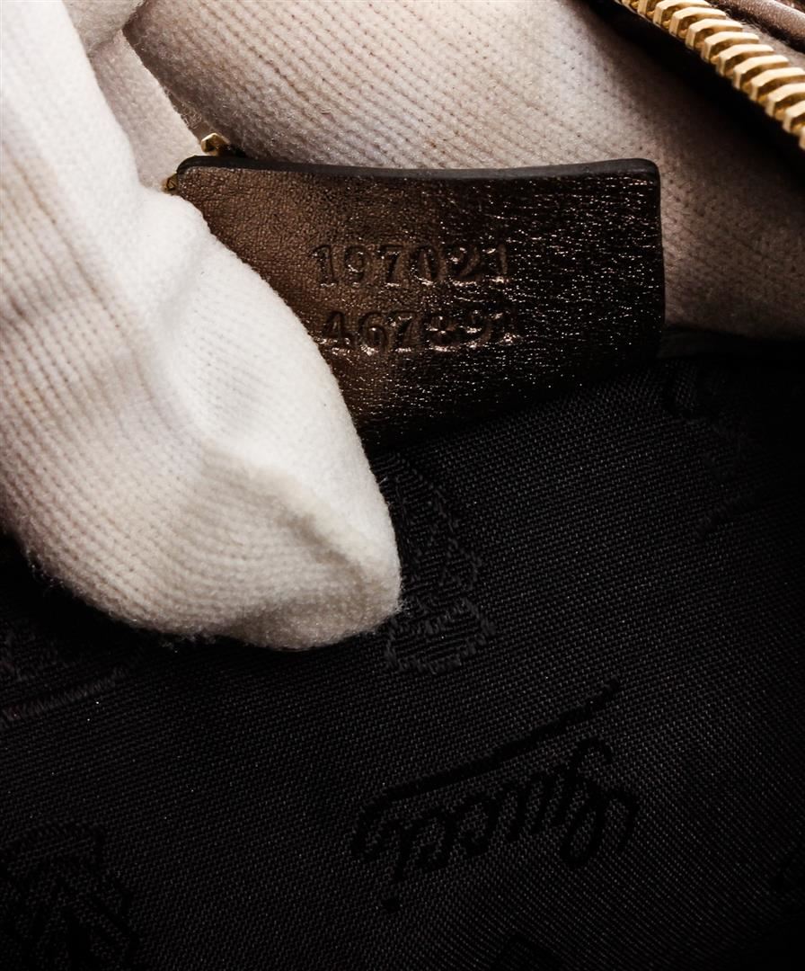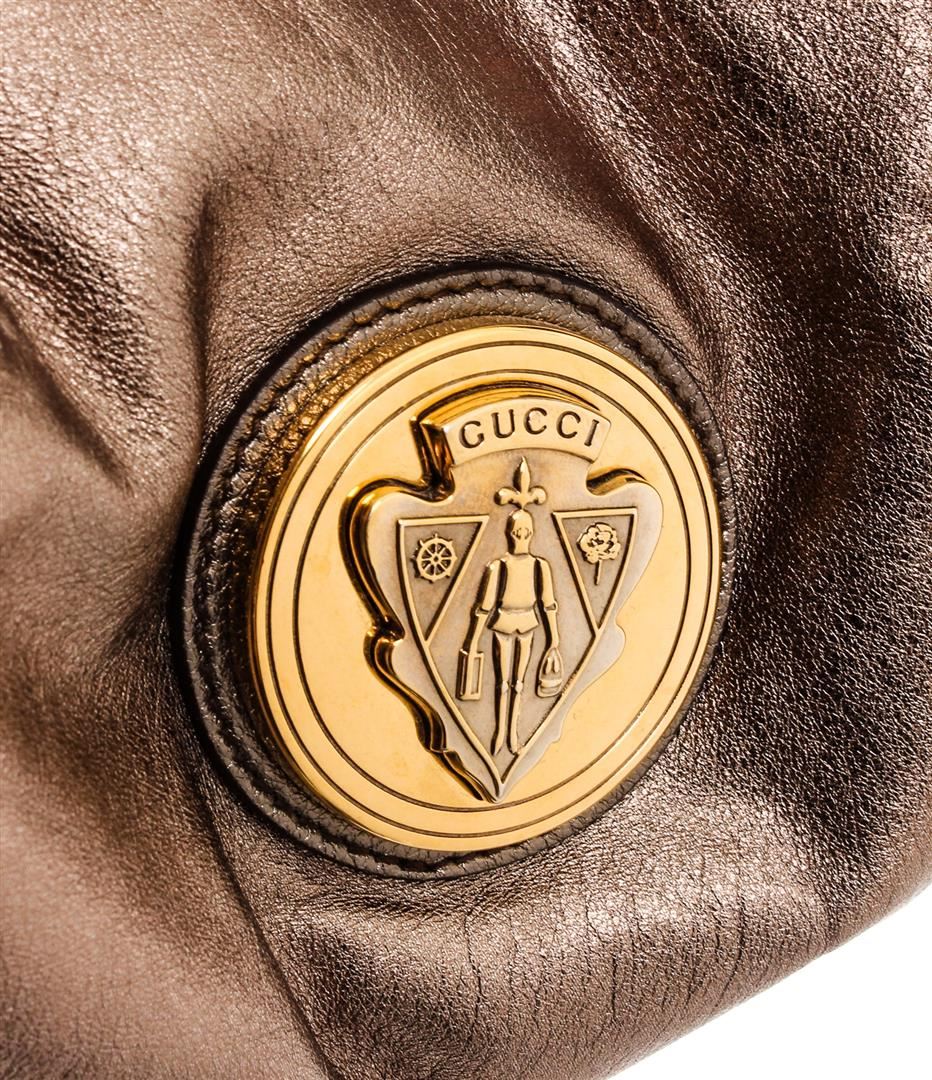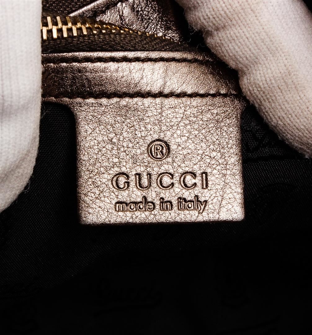Metallic grey large leather Gucci Hysteria bag with gold-tone hardware, dual flat top handles, black nylon lining, three pockets at interior wall; one with zip closure and zip-closure at top.