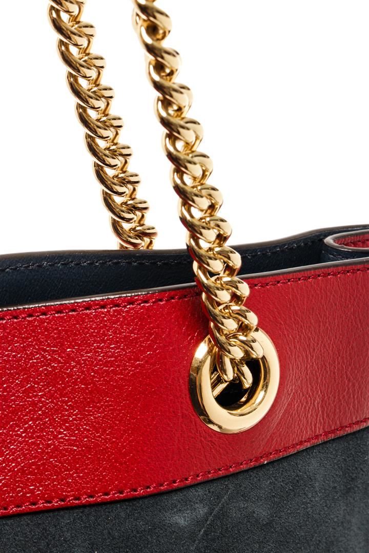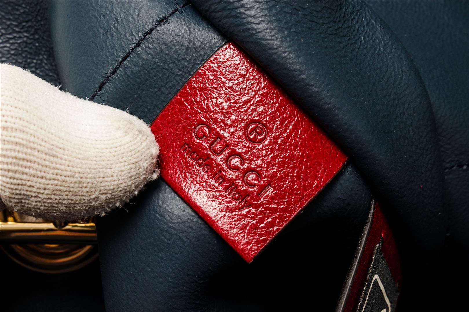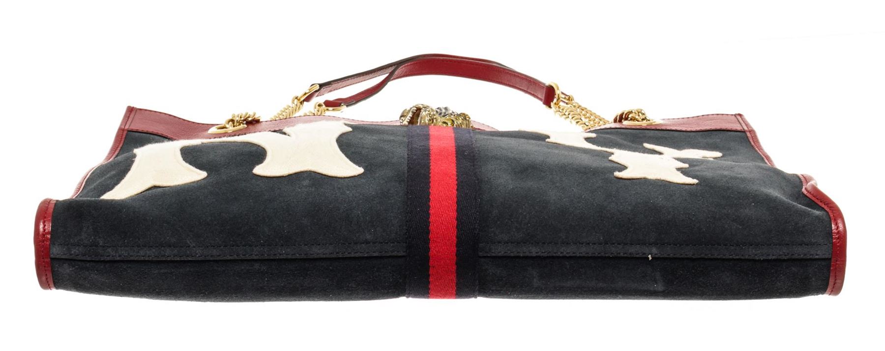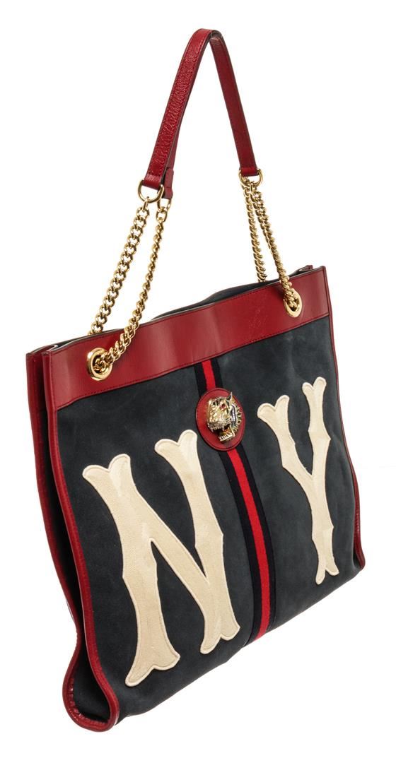 One Gucci NY Navy Suede Red Leather Yankees Rajah Bag. Item is sold AS-IS. All available information is listed in the description and shown in the photo. Gucci NY Navy Suede Red Leather Yankees Rajah Bag with "NY" in front, chain/leather shoulder strap, leather lining, gold tone hardware.