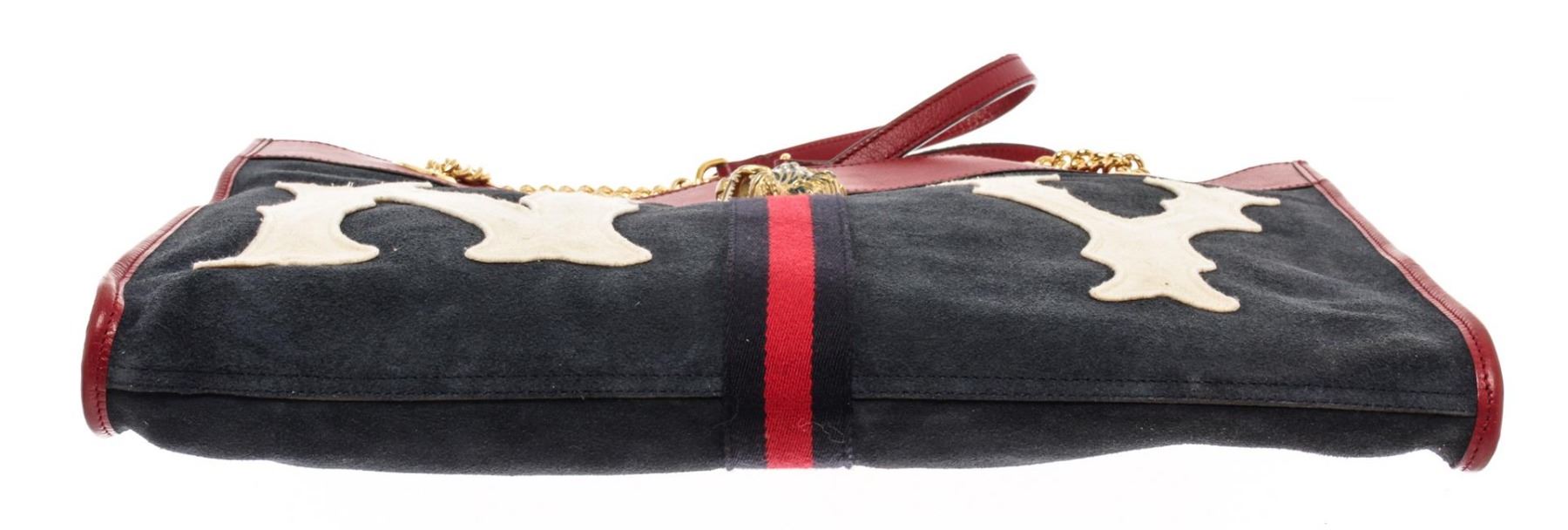 Gucci Navy Red Suede Leather Large NY Yankees Rajah Chain Tote Bag. All available information is listed in the description and shown in the photos. Gucci Navy Red Suede Leather Large NY Yankees Rajah Chain Tote Bag with blue canvas, gold-tone hardware, leather trim, dual shoulder straps, chain-link shoulder straps, leather, embroidered & crystal accents, leather lining, snap closure at top, includes dust bag & interior zip pouch. Height: 14.25" Width: 17.25" Depth: 1.75", Shoulder Strap Drop: 10.25" / 36.19 x 43.81 x 4.44 Cm