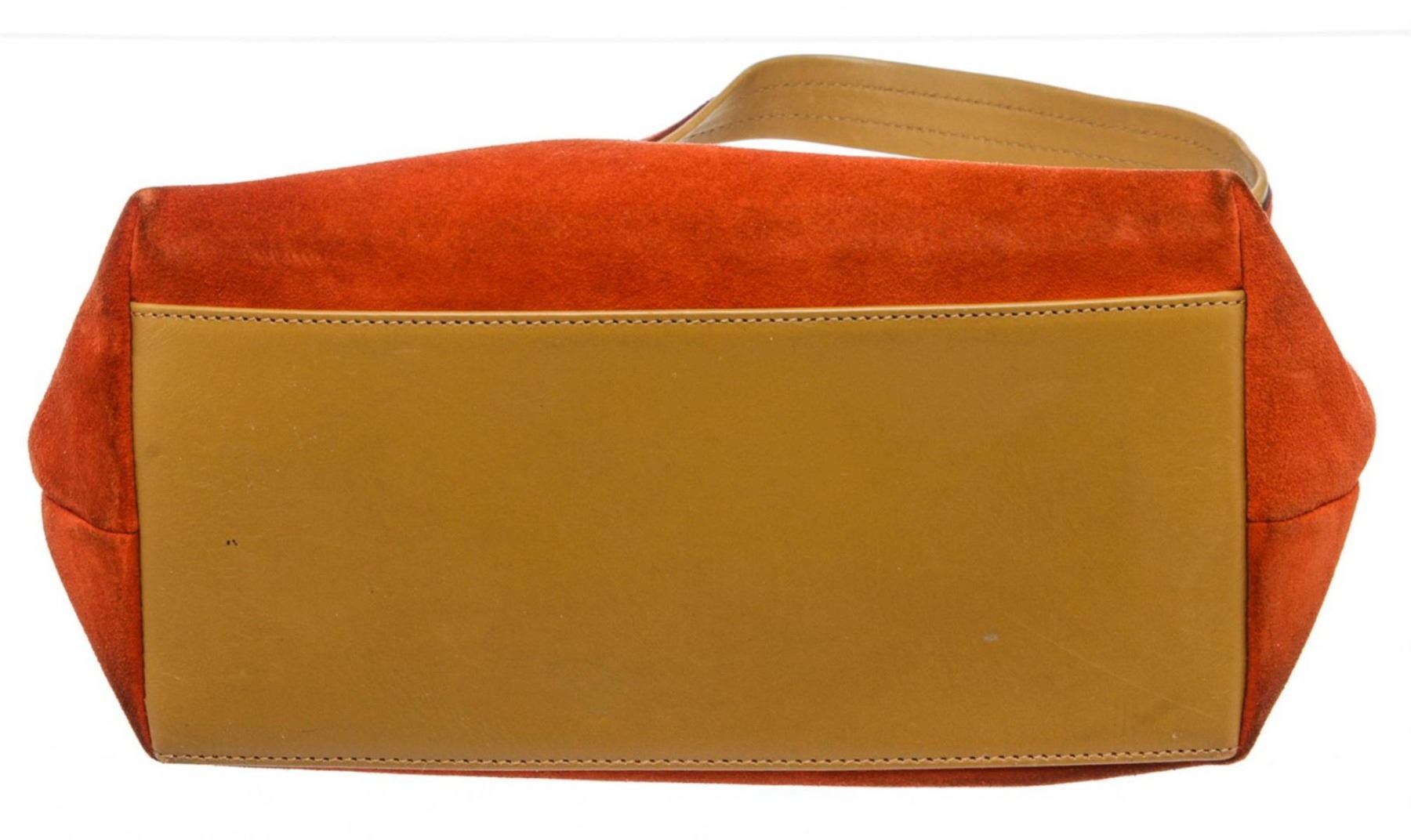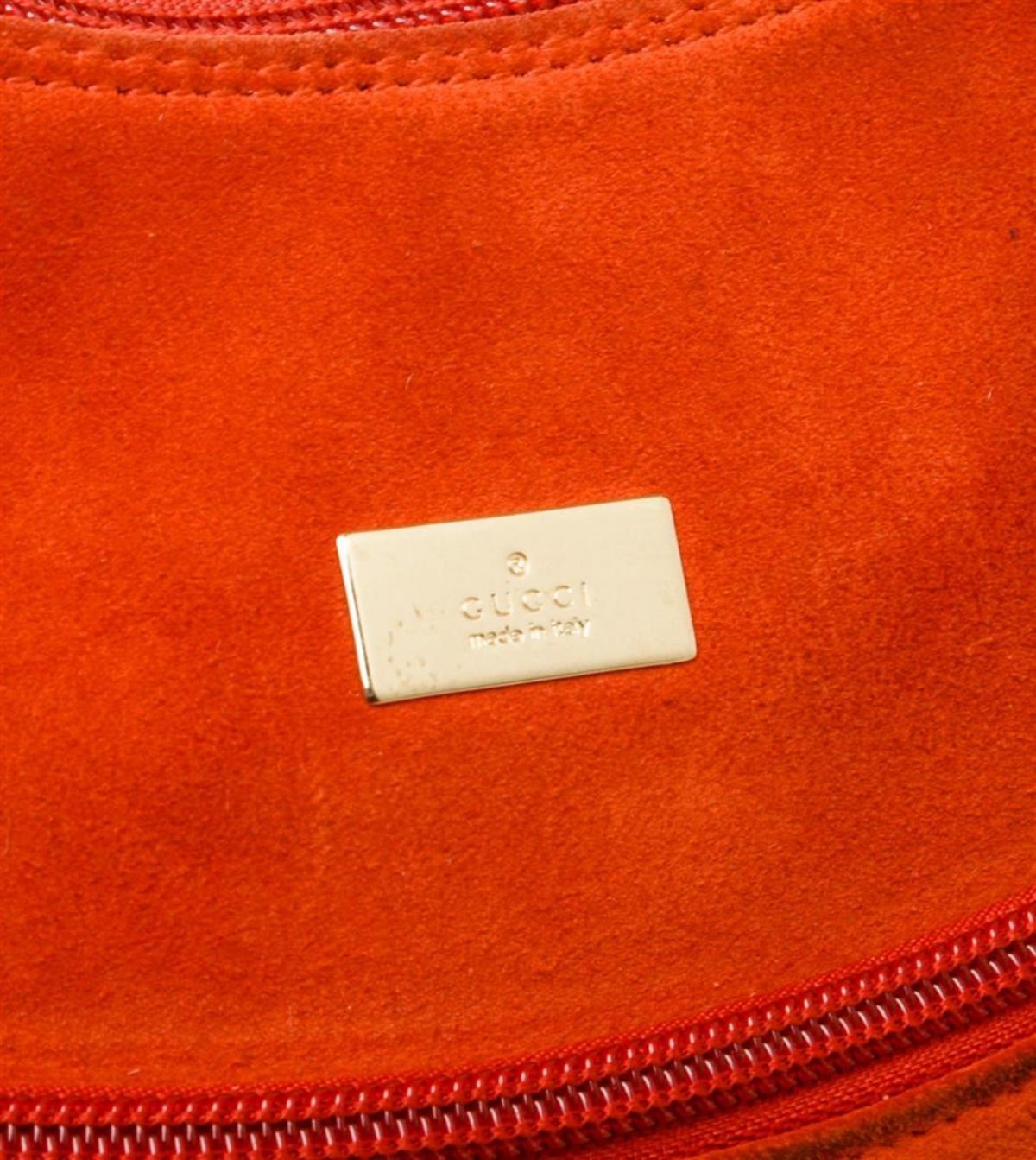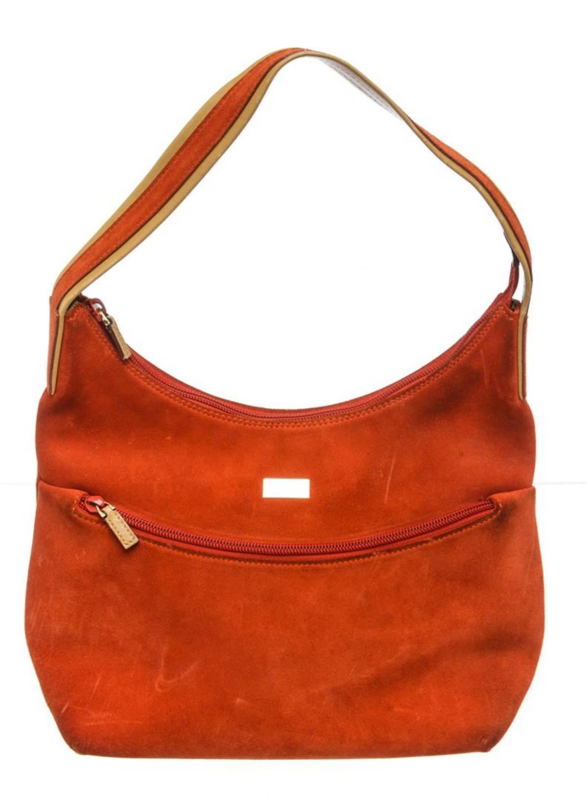 Gucci orange suede, tan leather trim, single flat handle, and zip top closure.