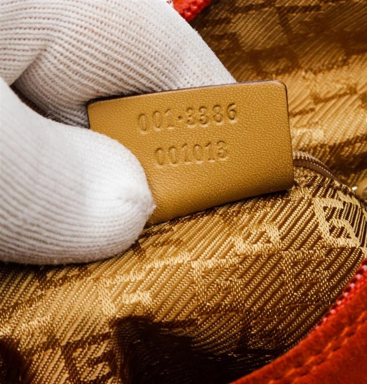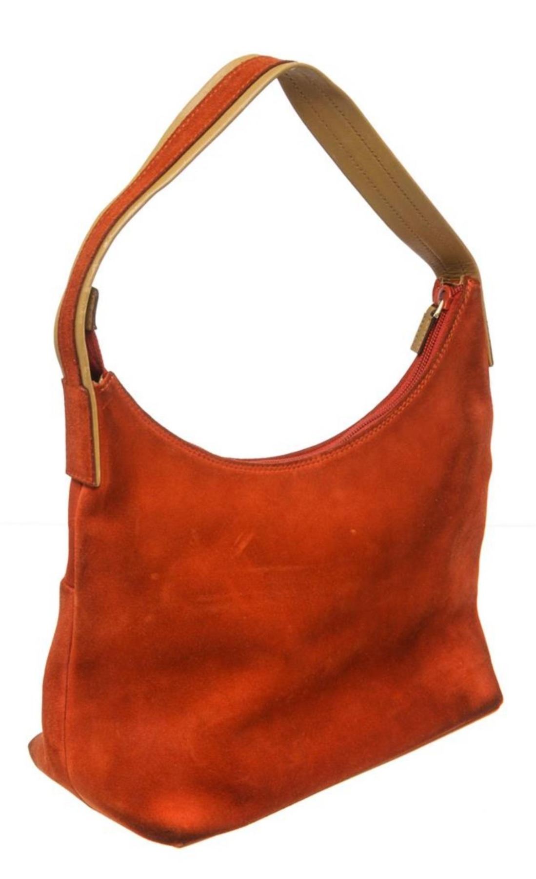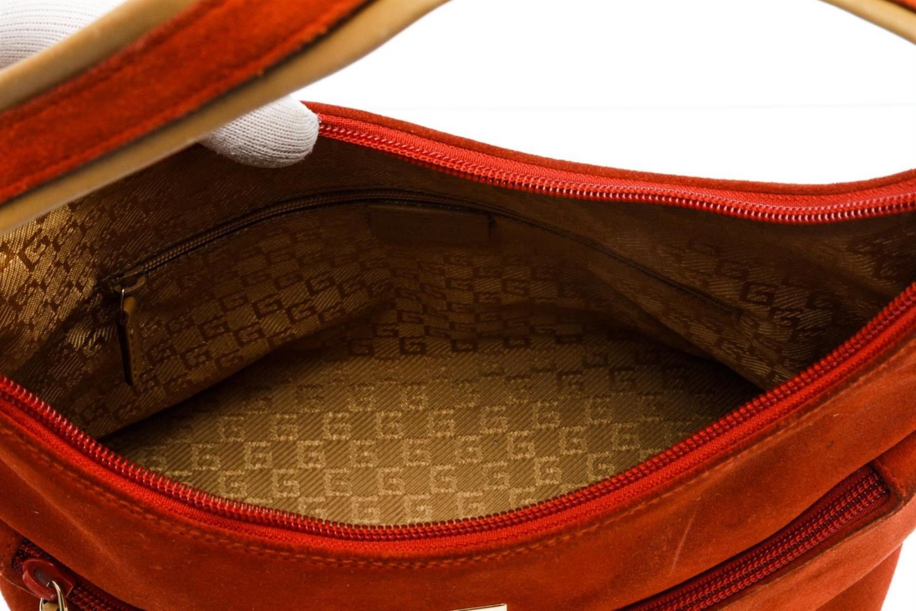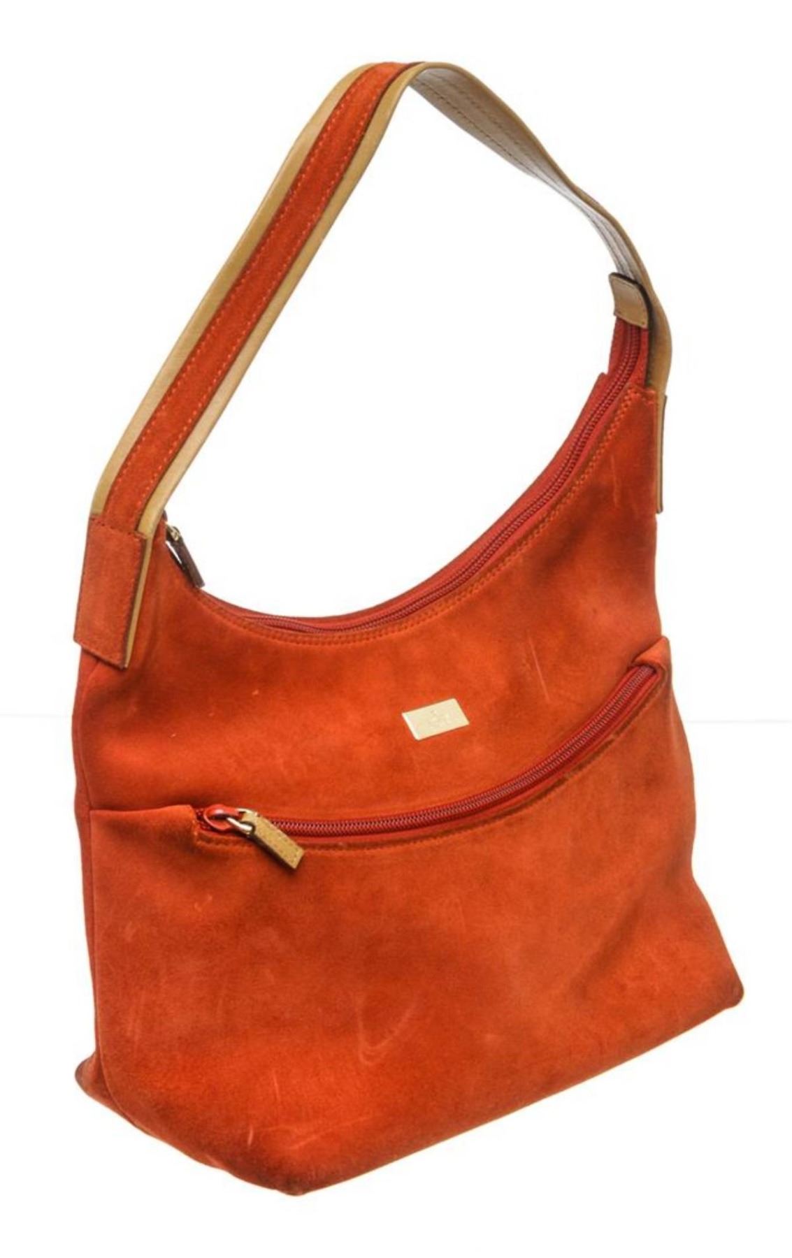 Gucci orange suede, tan leather trim, single flat handle, and zip top closure.