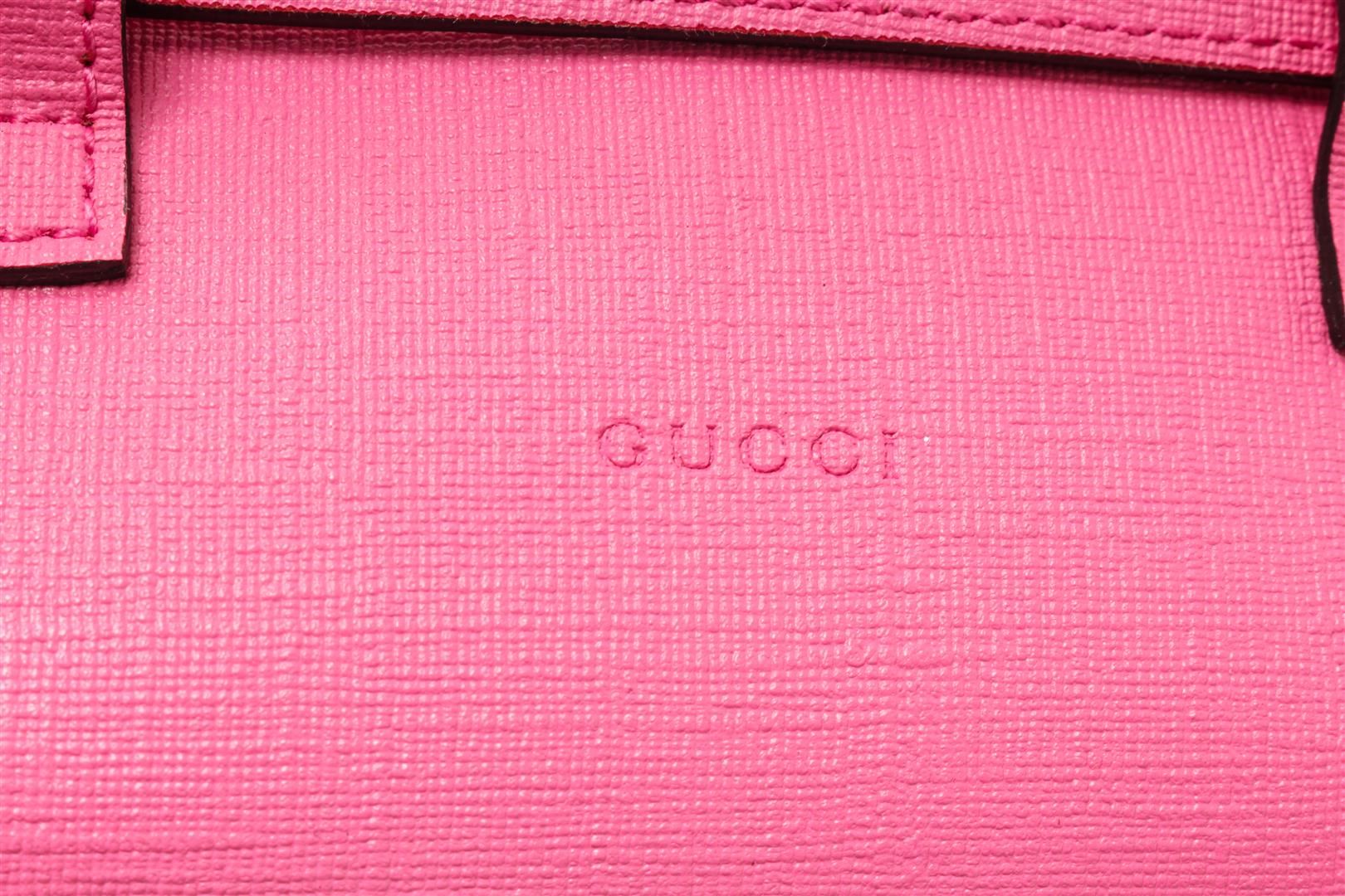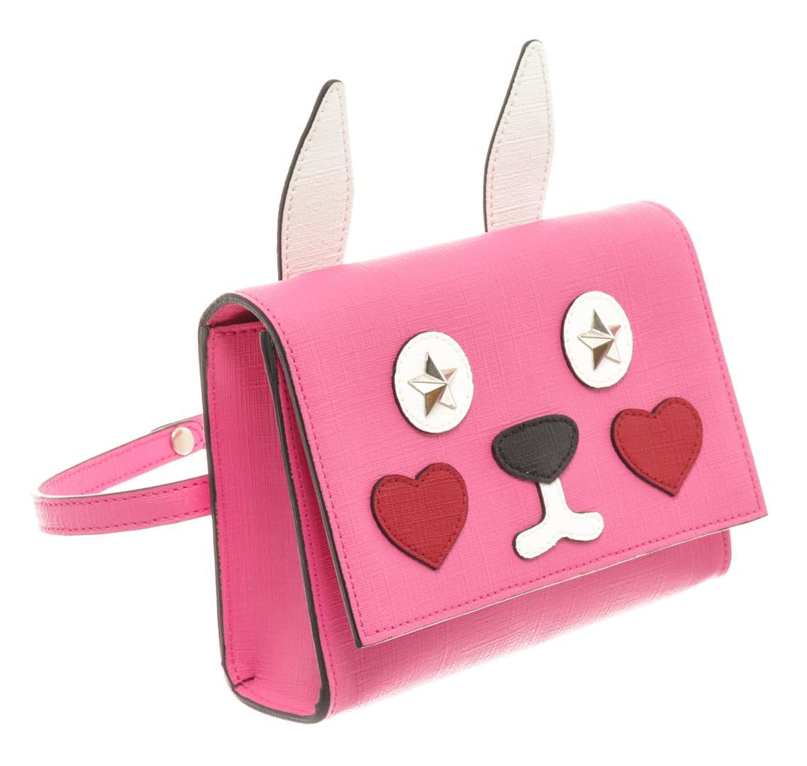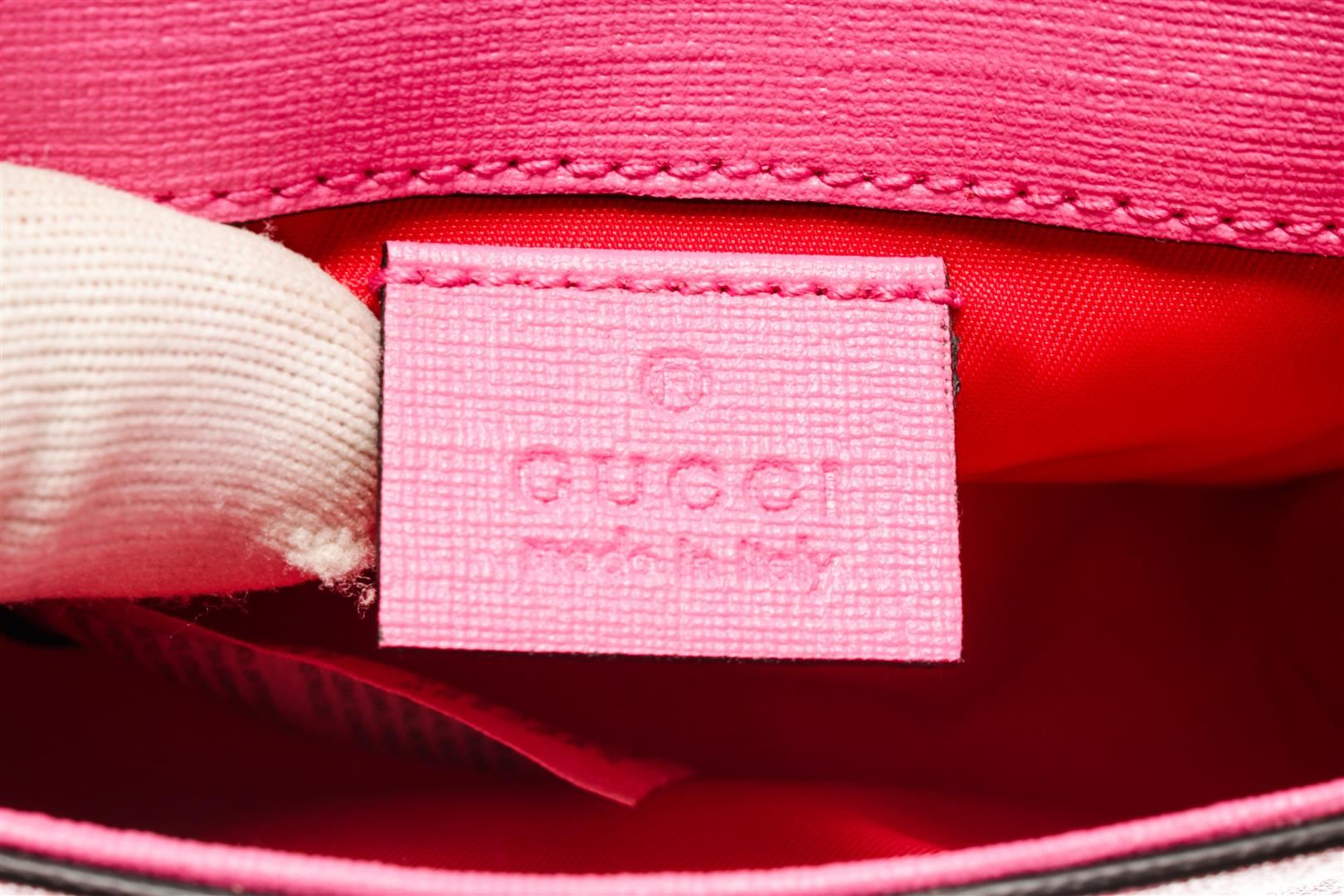 Gucci Pink Leather Children's Animal Waist Bag. All available information is listed in the description and shown in the photos. children's animal waist bag leather with applique exterior material leather exterior color pink interior material nylon, interior color red hardware color silver. Height 5", Width 6.5", Depth 2" / 12.7 x 16.51 x 5.08 cm