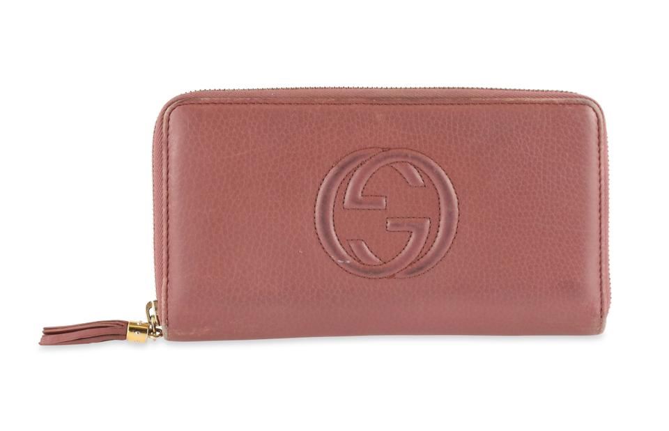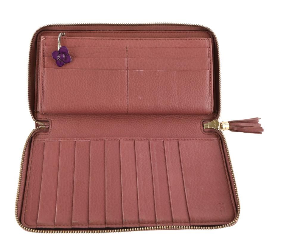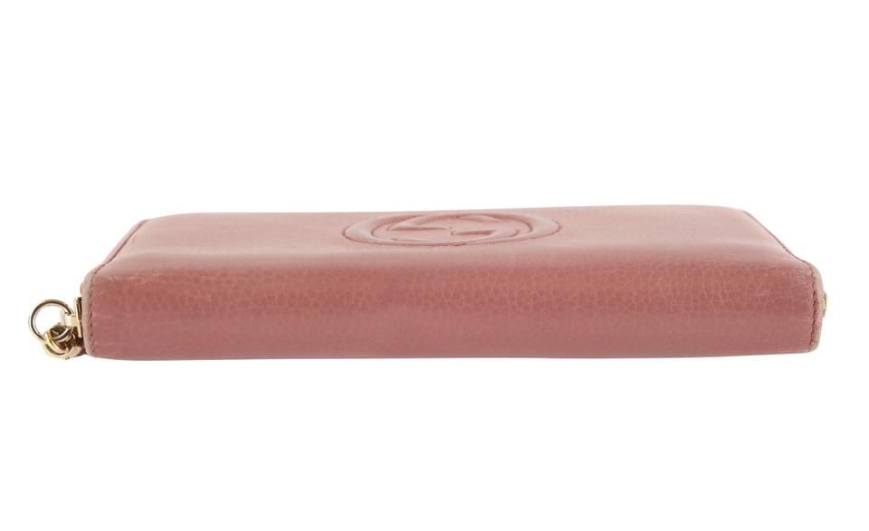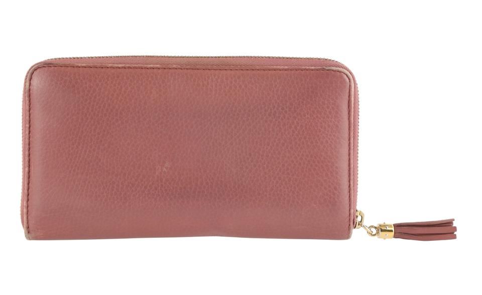 Gucci Soho Zip Around Continental Wallet Zip-around closure Pale gold-tone hardware Pink/Mauve grain leather Card count: 16 Large bill slots: 4 Interior coin zip pocket Made in Italy