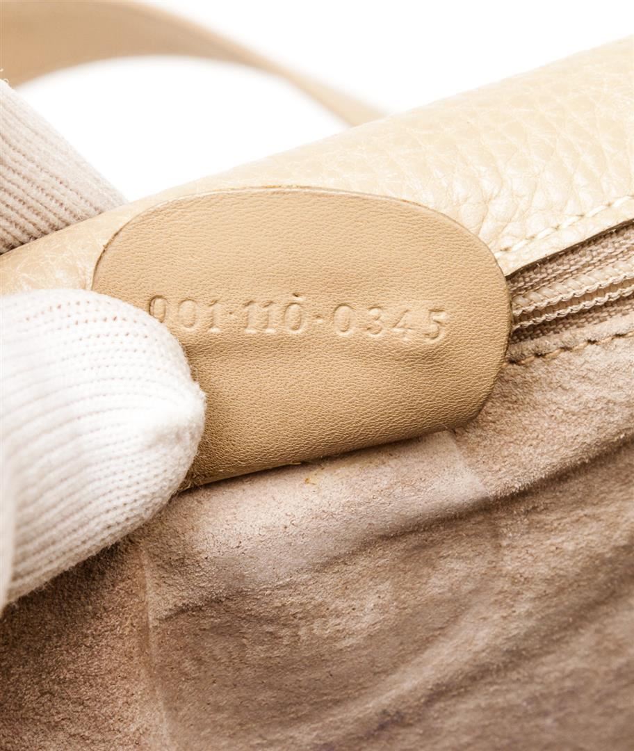 Beige leather Gucci Vintage shoulder bag with silver-tone hardware, adjustable flat leather shoulder strap, tonal suede interior lining, one zipper pocket at interior wall, one slip pocket under front flap and overall flap with magnetic button closure.