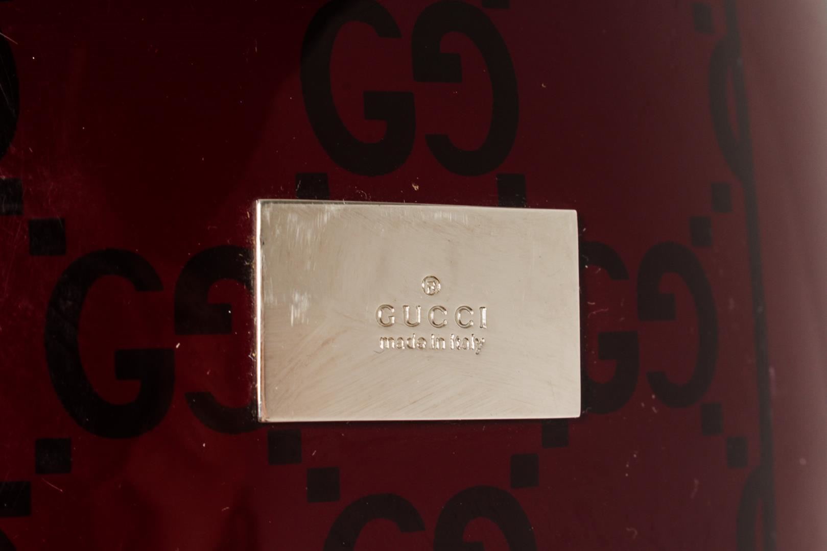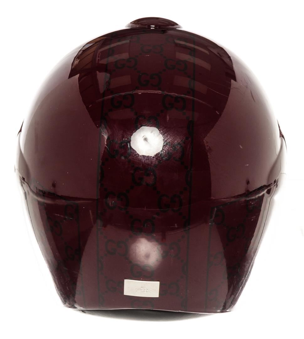 One Gucci Vintage Burgundy GG Supreme Print PVC Motorcycle Full-face XL Helmet. Item is sold AS-IS. All available information is listed in the description and shown in the photo. Burgundy GG Supreme print on PVC Gucci motorcycle helmet with clear PVC see-through face cover, silver-tone metal logo placard at the back, adjustable padded strap for safety and black canvas lining with mesh detail inside. 20"x20"x20"