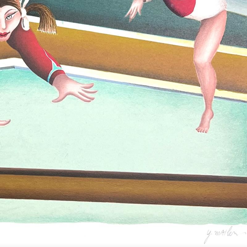 "Gymnast" is a limited edition serigraph on paper by Yuval Mahler. The piece comes hand signed by the artist, numbered, and with a letter of authenticity. Measures approximately 13" x 20".