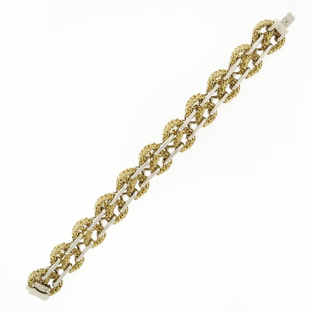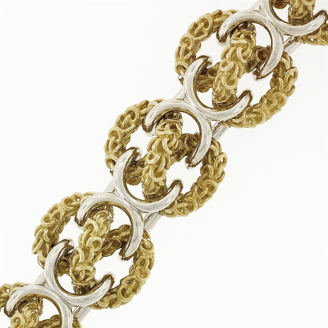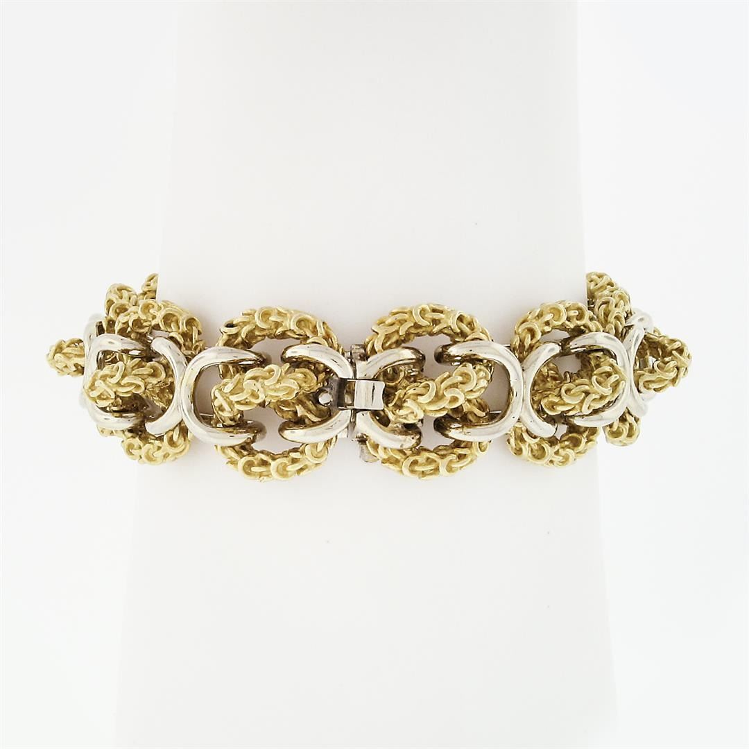 A solid 18k yellow & white gold wide infiity knot link bracelet. It weighs a total of 102.50 grams, measures 18.65mm wide, and measures 7 inches in length.