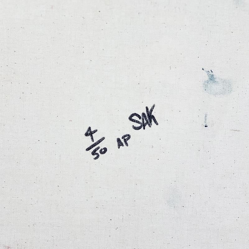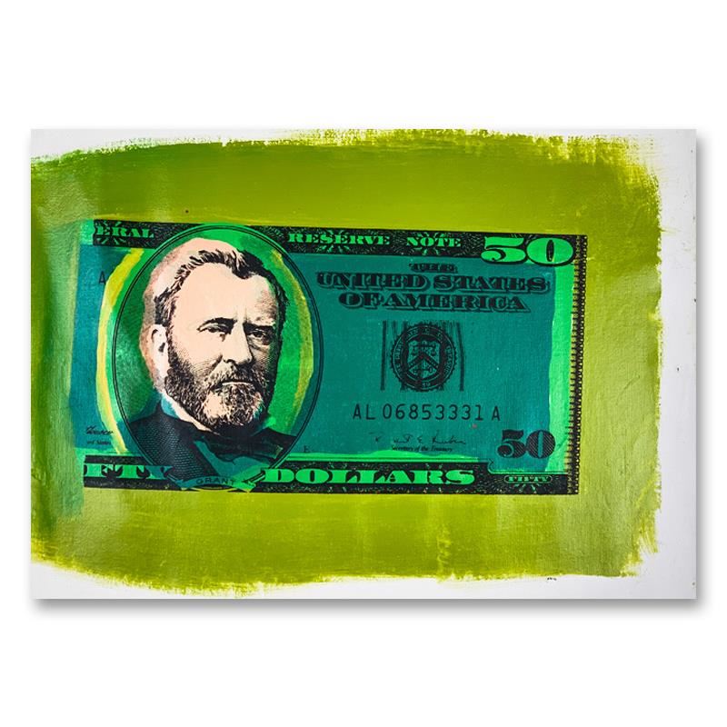 "Half Grant " is a limited edition hand pulled silkscreen mixed media on canvas by Andy Warhol protege Steve Kaufman (1960-2010). This piece is numbered and AP 4/50 and hand signed inverso. Includes letter of authenticity. As is common with Kaufman's works, this piece may have perceived minor flaws, but is in overall good condition. Measures approximately 16.5" x 24" (image).