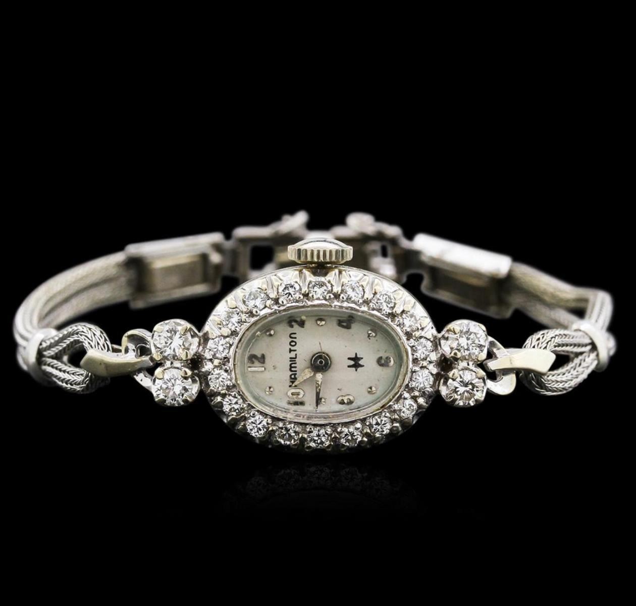 One ladies, vintage Hamilton wristwatch electronically tested, 14KT white gold Case: 19 x 14mm, Case Back: space available for engraving, Fixed Case Lug terminals: high polish white gold, Case Lugs: set with diamonds, Crown: scalloped edge, Bezel: diamond set, Crystal: acrylic. Hamilton USA Movement: Twenty Two jewel mechanical stem wind, Signed Dial: Hamilton, White color, pointed hands, indices and numerals, Double Cord Stainless Steel Wheat link Bracelet: Condition: G-5 Fine. Five and one half length, adjustable. Overlocking white gold filled clasp. Containing: Twenty Two, prong set round brilliant and single cut diamonds, approximate total weight of 22 Stones = 0.74 ct. Graded in the setting. Clarity: VS-1 to VS-2 Average. Color: G - I. Total Weight of Diamonds: 0.74ct. Total Weight of Watch: 11.18 grams. AIG Appraised.
