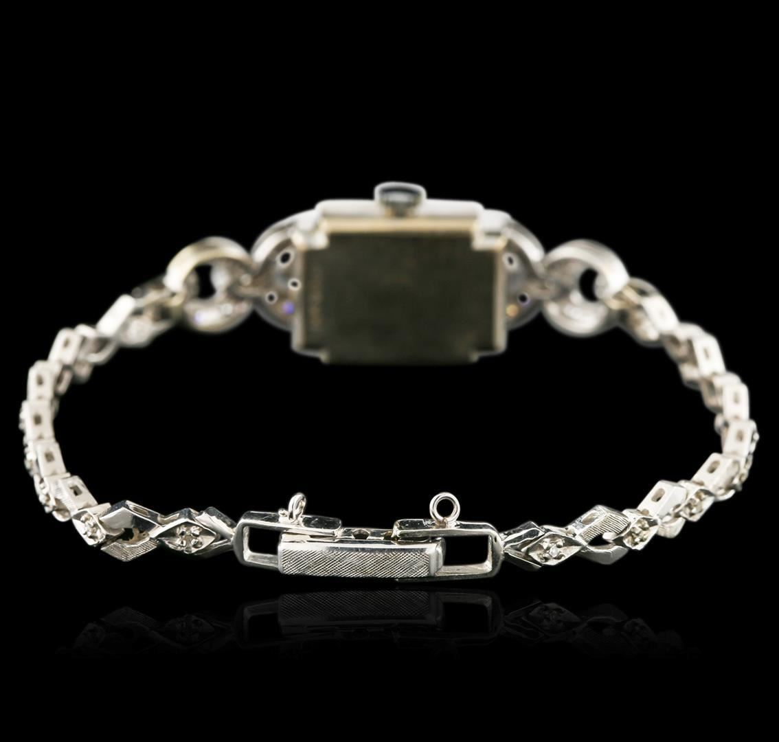 One ladies, vintage Hamilton wristwatch electronically tested 14KT White gold, Case: 19 x 14.50mm, Case Back: space available for engraving, Flexible Case Lug terminals: set with diamonds, Fixed Case Lugs: set with diamonds, Crown: scalloped edge, Bezel: diamond set, Crystal: acrylic. Custom Movement: quartz, Battery: SR527SW, Hamilton Signed Dial: pointed hands & indices, 14KT White gold Bracelet: set throughout with diamonds, Condition: G- 4 Average. Six and one half inch length, adjustable. Containing: Fifty Two, prong set single cut diamonds, approximate total weight of 52 Stones = 0.90ct. Graded in the setting. Clarity: VS-1 to VS-2 Average. Color: G - I. Total Weight of Diamonds 0.90ct. Total Weight of Watch 16.11 grams. AIG Appraised.