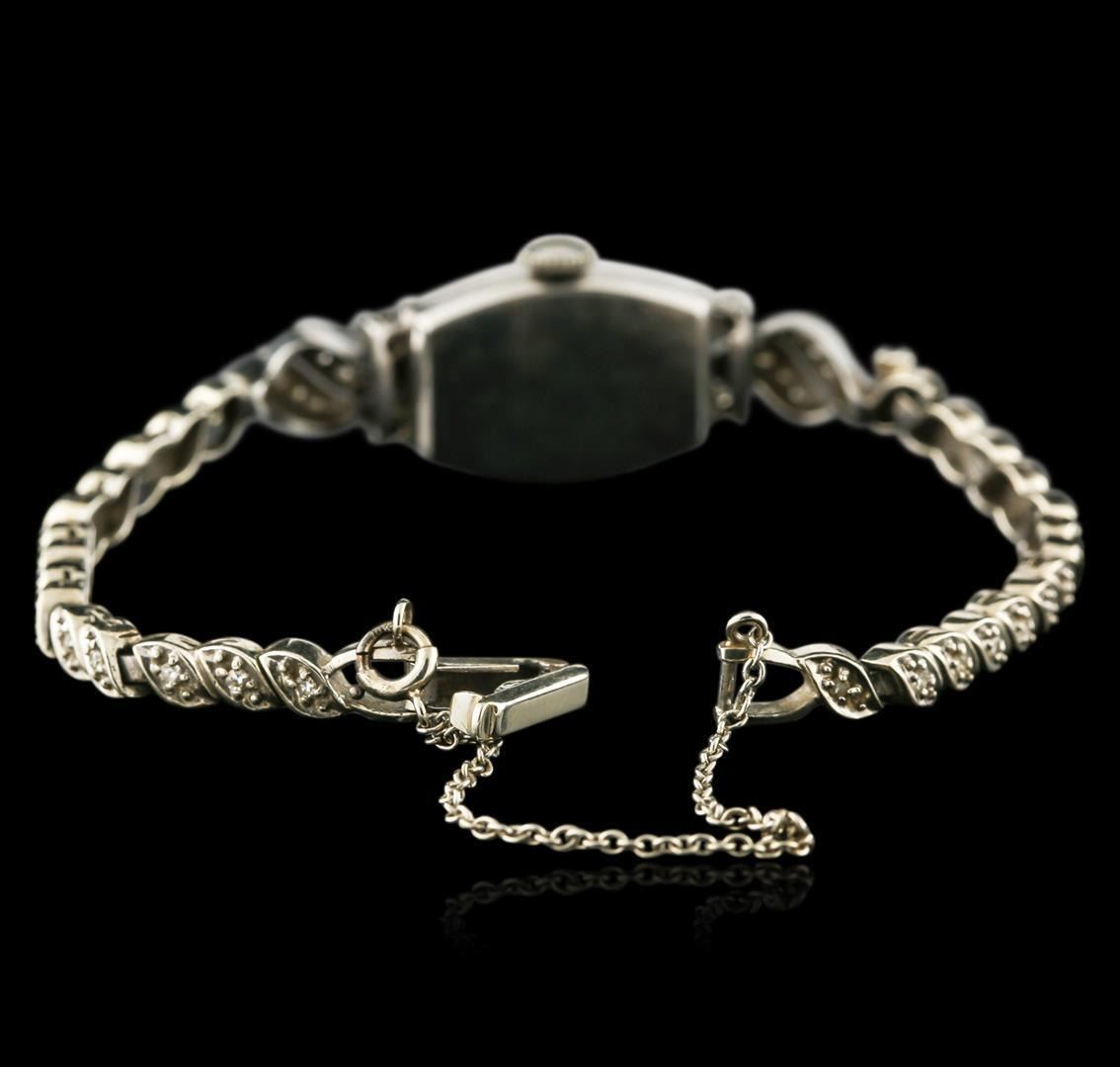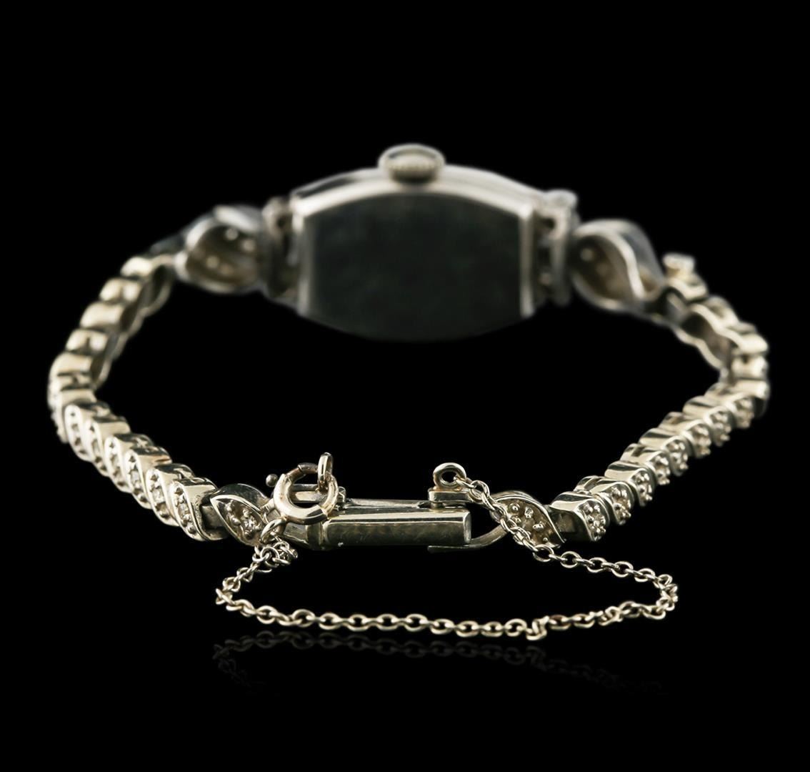 One ladies, vintage Hamilton wristwatch electronically tested Platinum, Case: 19 x 14mm, Case Back: space available for engraving, Rigid Case Lug terminals, Fixed Case Lugs: set with diamonds, Crown: scalloped edge, Bezel: diamond set, Crystal: acrylic. Hamilton USA Movement: 17 jewel mechanical stem wind, Hamilton Signed Dial: pointed hands, indices and numerals, 14KT White gold Bracelet: set throughout with diamonds, Condition: G- 4 Average. Six inch length, adjustable. Containing: Seventy, prong set single & round brilliant, and baguette cut diamonds, approximate total weight of 70 Stones = 1.15ct. Graded in the setting. Clarity: VS-1 to SI-1 Average. Color: H - I. Total Weight of Diamonds 1.15ct. Total Weight of Watch 21.86 grams. AIG Appraised.
