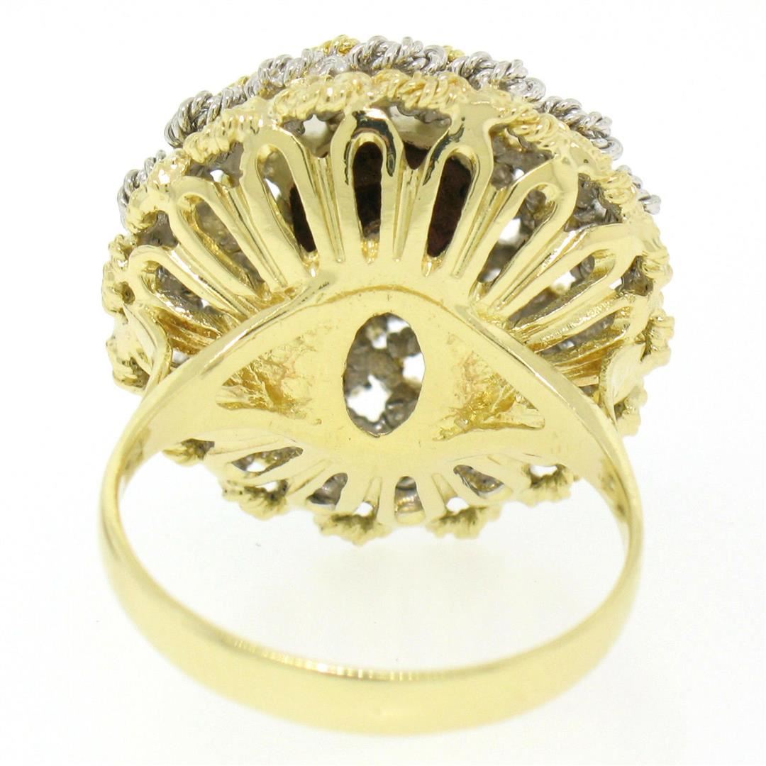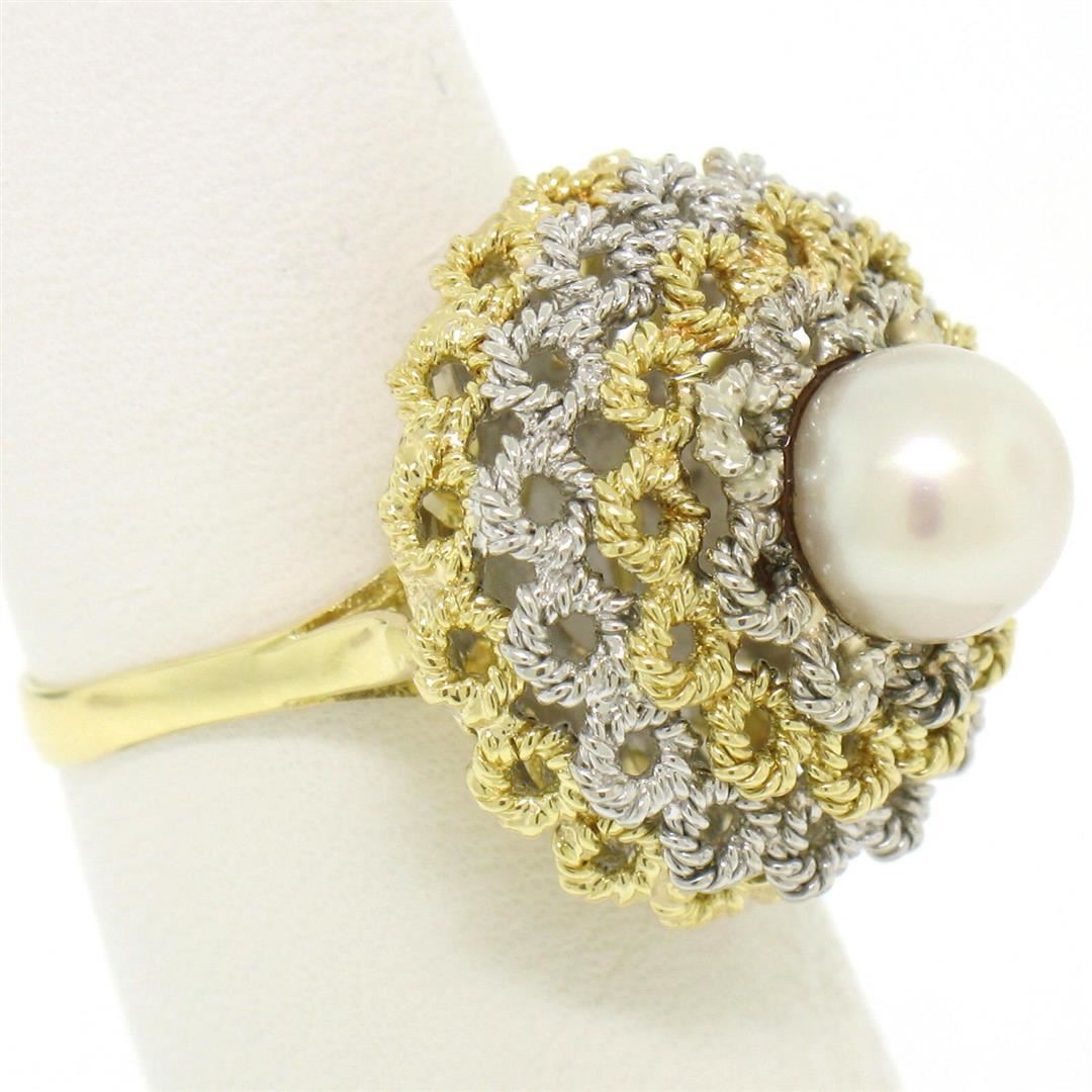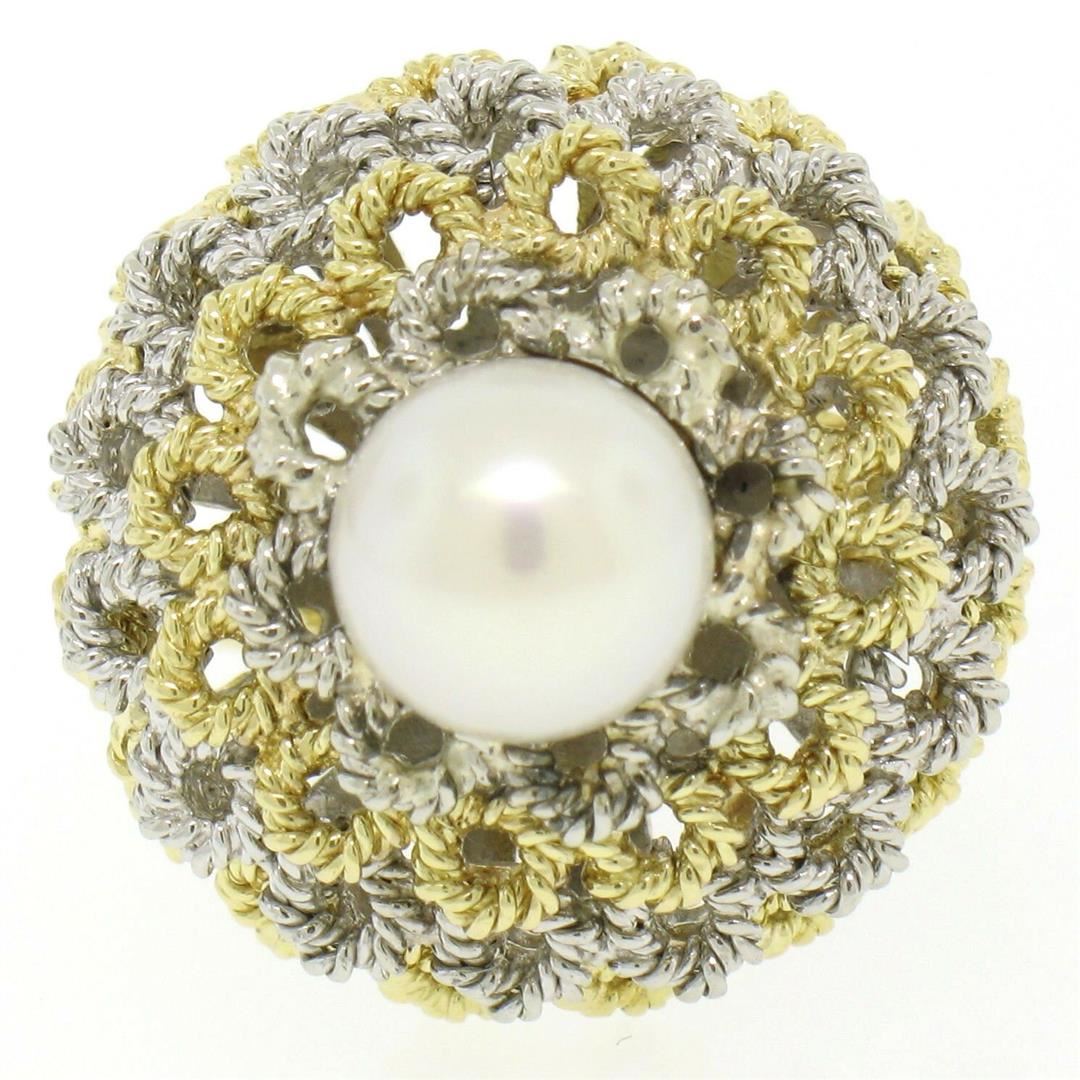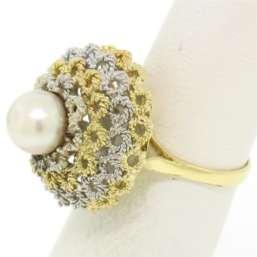 A like new handmade 18kt yellow and white gold ring set with a 7.5mm round pearl. The ring is size 6.5, weighs a total of 8.4 grams, and measures 19.75mm wide.