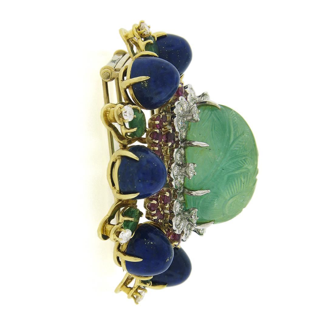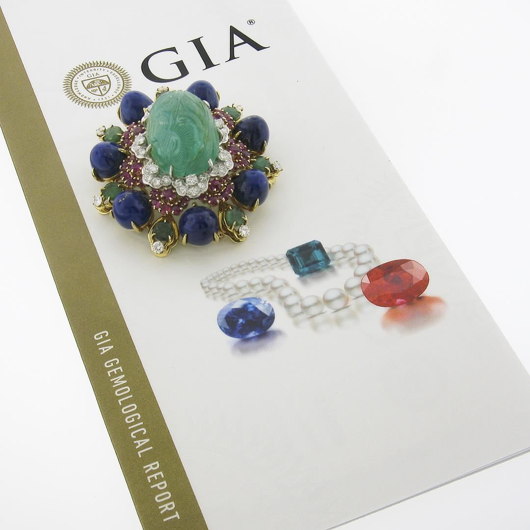 A solid 16k yellow & white fold handmade brooch, featuring 1 GIA graded carved oval natural emerald (40-50ct ), 7 round bead natural lapis lazuli (10mm), 35 round cut natural ruby (3ctw), 7 round cut natural emeralds (3.36ctw), and 49 round cut natural diamonds (G-I - VS2-SI2 ; 1.86ctw). Measures 53.8x49.6mm and weighs a total of 44.9 grams. Comes with all original relevant certifications.
