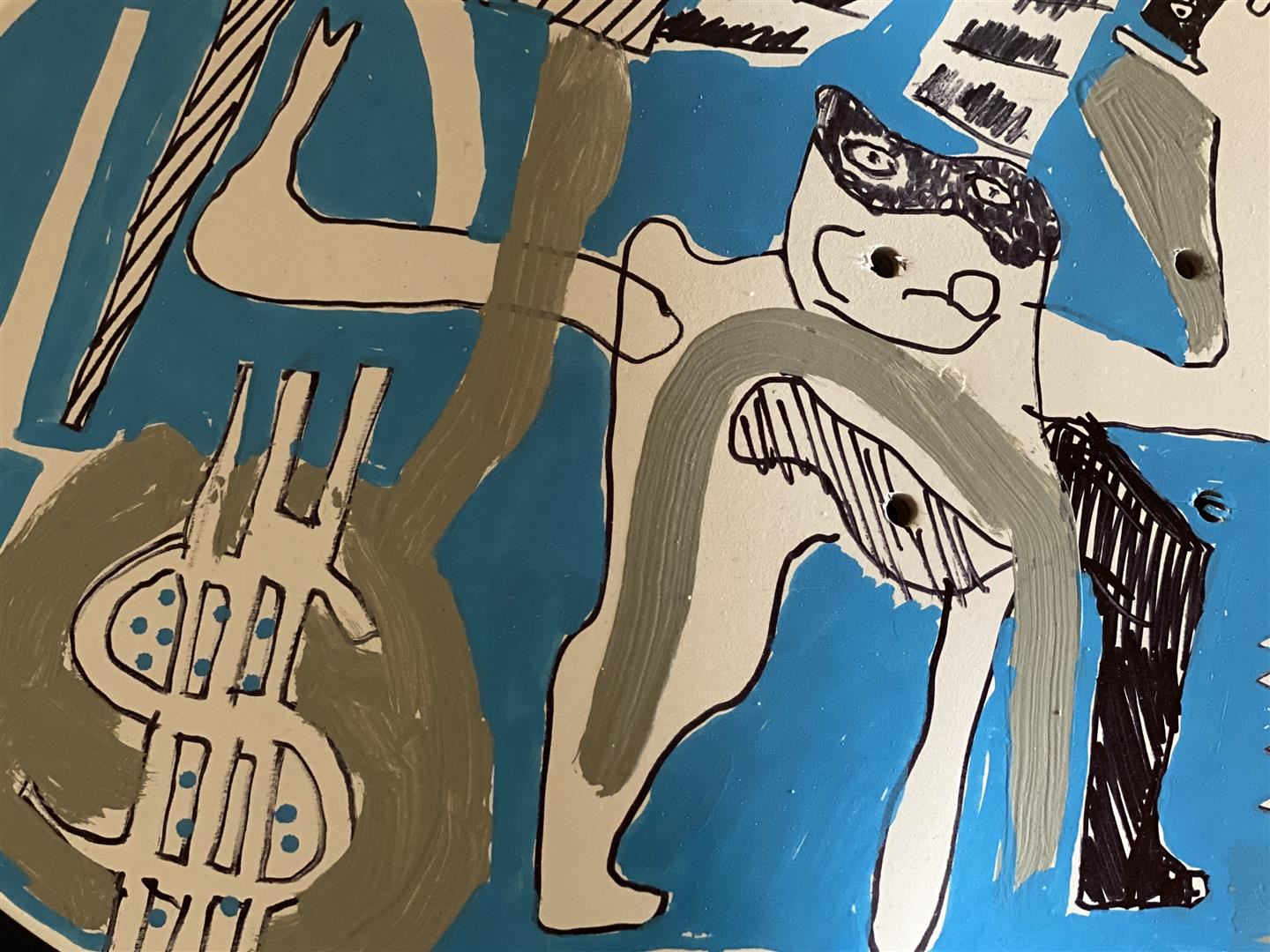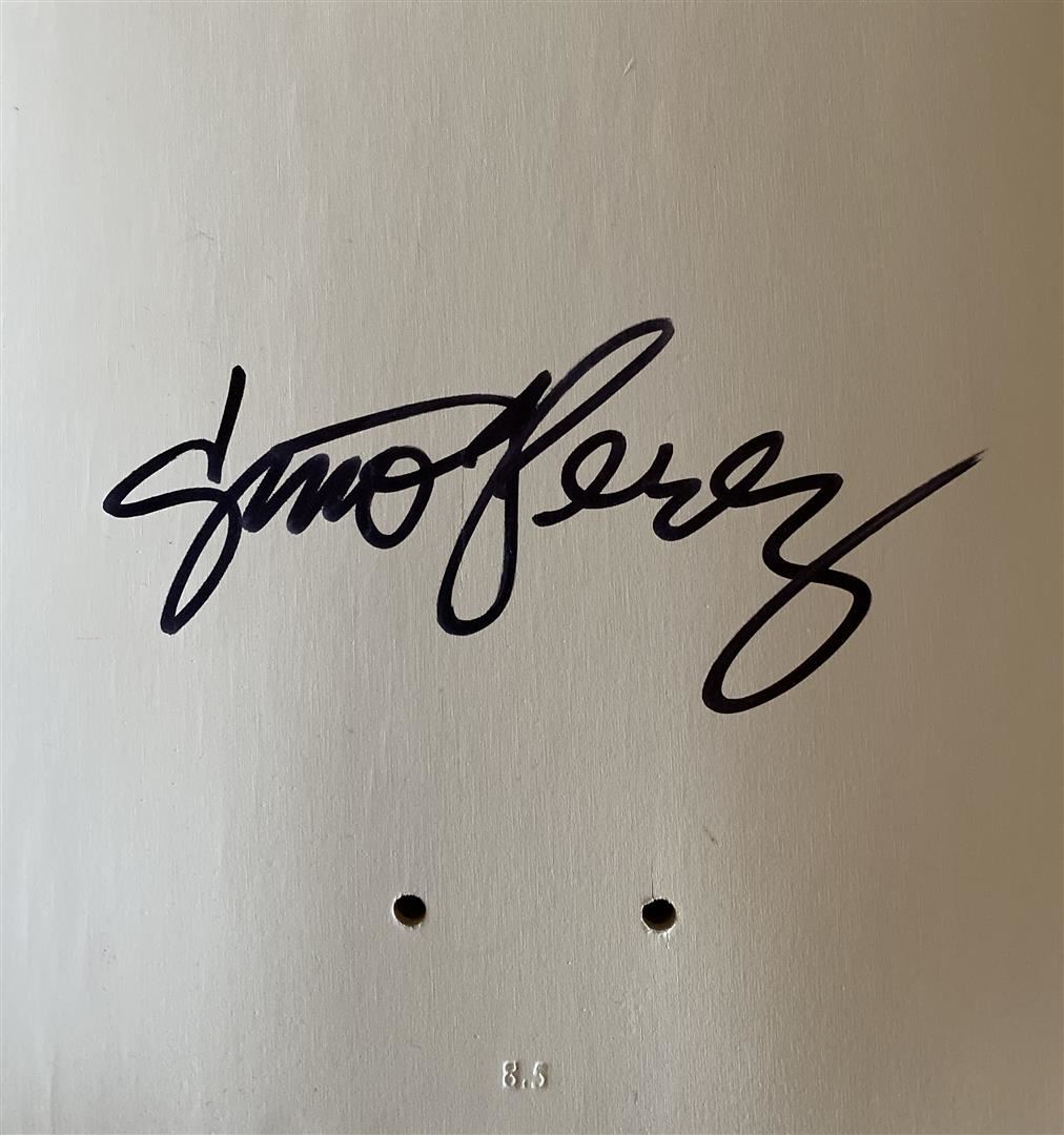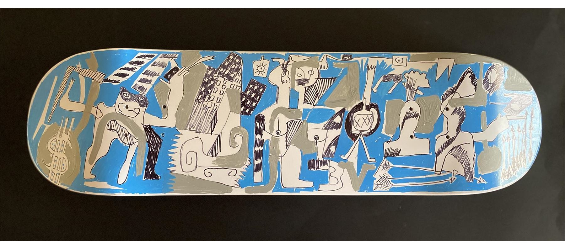 Grey Compliments Blue Period by Gino Perez. "Grey Compliments Blue Period" is a wood Sugar Skate Co deck, with hand painted original artwork by Gino Perez, and hand signed. Measures approximately 32" x 8.5". Year: 2019. Never mounted or displayed.
