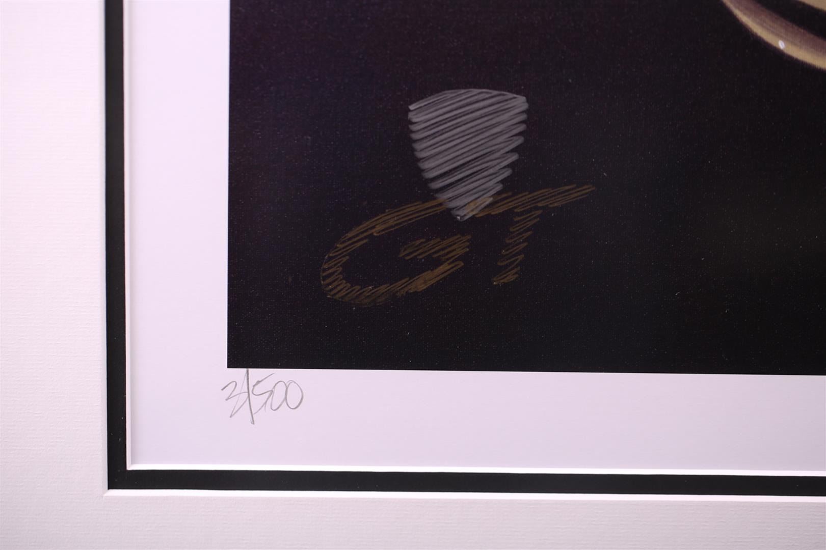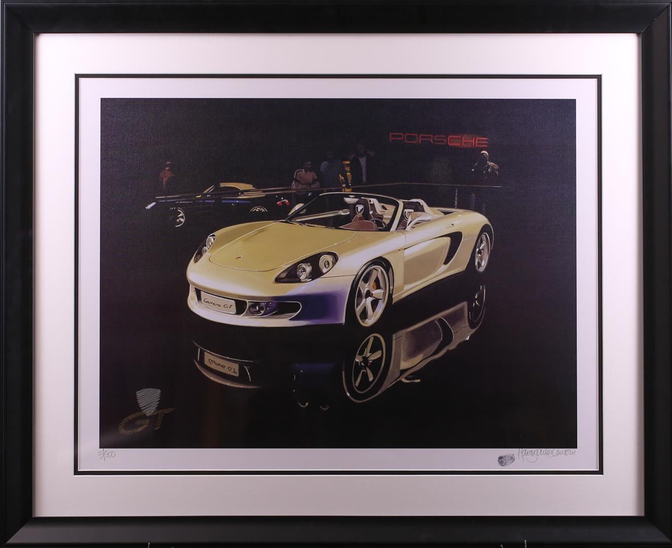 Limited Edition Lithograph #3 of 500 with Harold James Cleworth Original Signature and vintage enhanced artist's actual thumbprint. Original hand sketched re-marking with the GT logo. Original Harold James Cleworth paintings have sold for over $100,000!! Harold James Cleworth was born in the industrial North of England during WWII. After graduating Manchester College of Art in 1967, he moved to London to work for Decca Records illustrating the first album covers for the Rolling Stones, The Who and other new groups. In 1972, he moved to California choosing automobiles as the new subject. The Chase Manhattan Bank of Zurich bought his first original and private collectors began to commission him to paint portraits of their Bugattis, Duesenbergs and Ferraris. Galleries invited him to exhibit in San Francisco, Santa Monica, Beverly Hills and Carmel. The dimensions are 34 inches by 41 inches. Comes with Certificate of Authenticity.