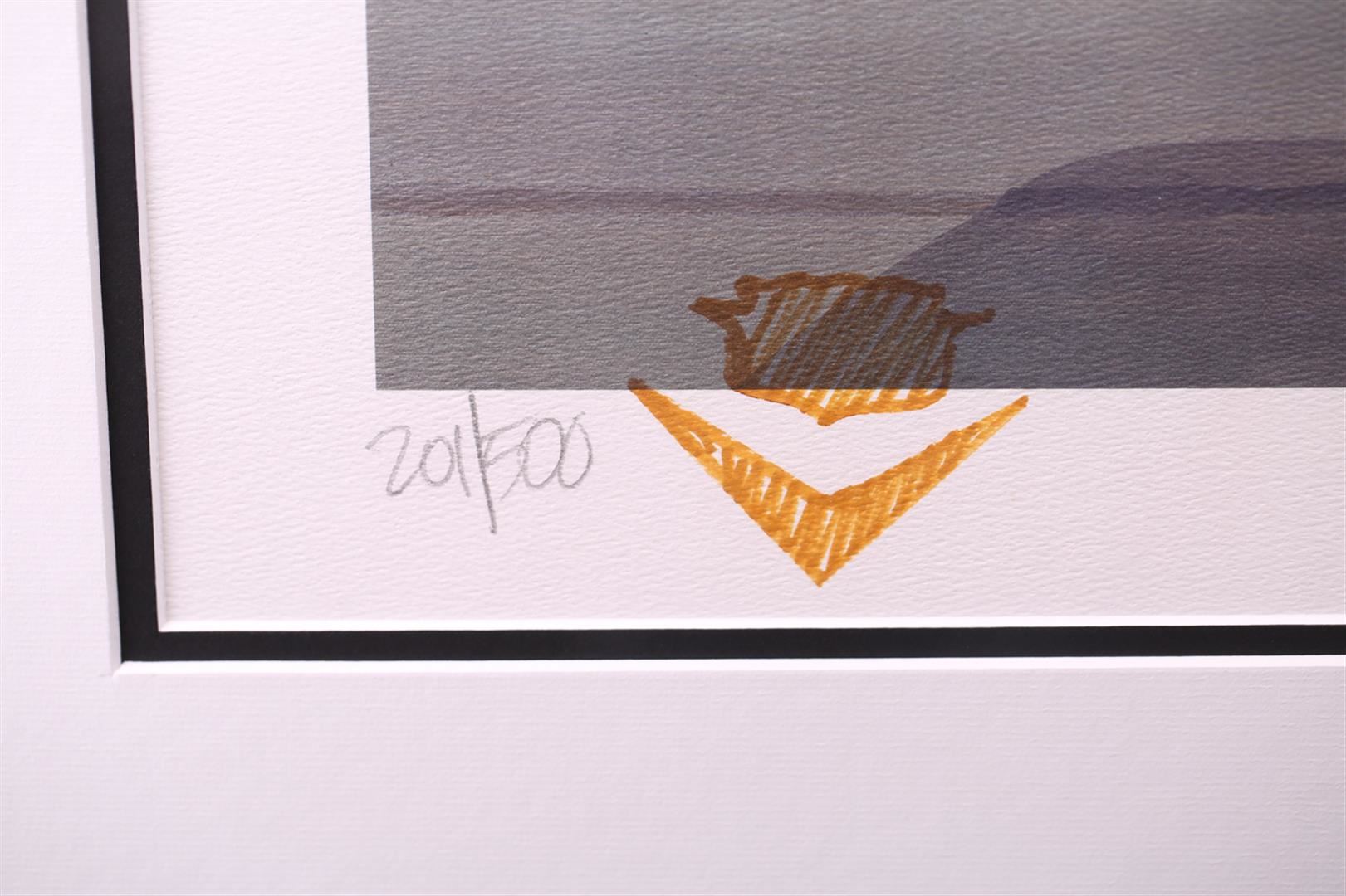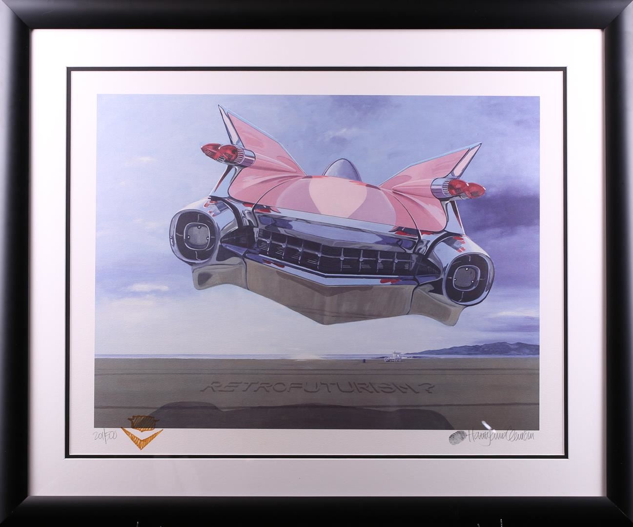 Limited Edition Lithograph #201 of 500 with Harold James Cleworth Original Signature with vintage enhanced artist's actual thumbprint and original hand sketched re-marking with a Cadillac Logo. Original Harold James Cleworth paintings have sold for over $100,000!! Harold James Cleworth was born in the industrial North of England during WWII. After graduating Manchester College of Art in 1967, he moved to London to work for Decca Records illustrating the first album covers for the Rolling Stones, The Who and other new groups. In 1972, he moved to California choosing automobiles as the new subject. The Chase Manhattan Bank of Zurich bought his first original and private collectors began to commission him to paint portraits of their Bugattis, Duesenbergs and Ferraris. Galleries invited him to exhibit in San Francisco, Santa Monica, Beverly Hills and Carmel. The dimensions are 34 inches by 41 inches. Comes with Certificate of Authenticity.
