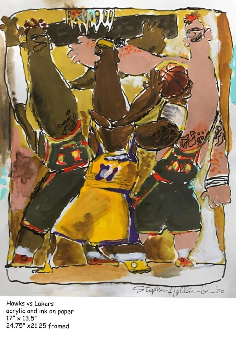 The Longneck Lakers take on the Hawks in this Stephen Holland sports dream. A 24.75x21.25" framed original acrylic & ink on paper; w/COA