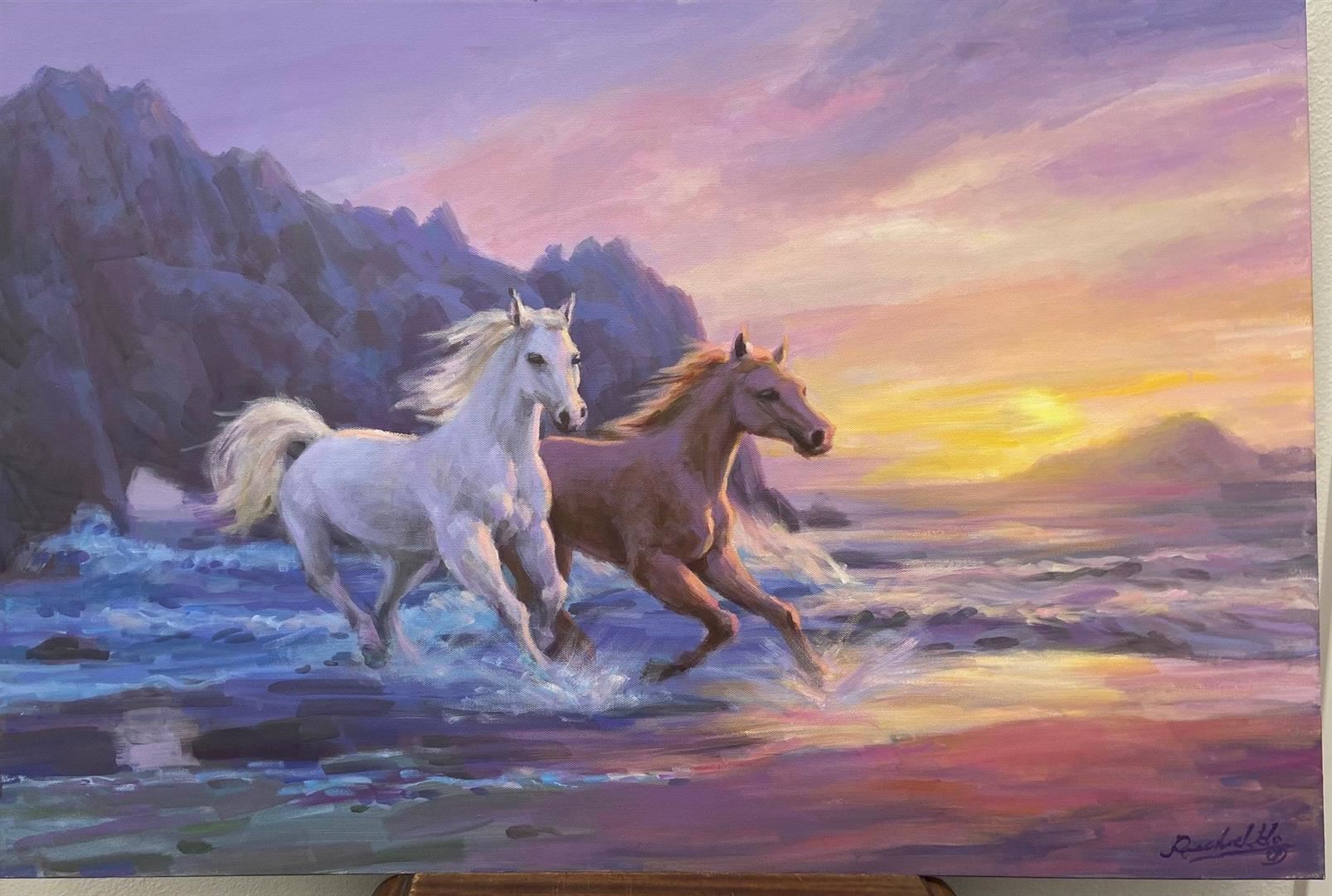 A 36x24" original acrylic on canvas by Richard Ho , beautifully depicts two strong young horses heading home across the beach at sunset.