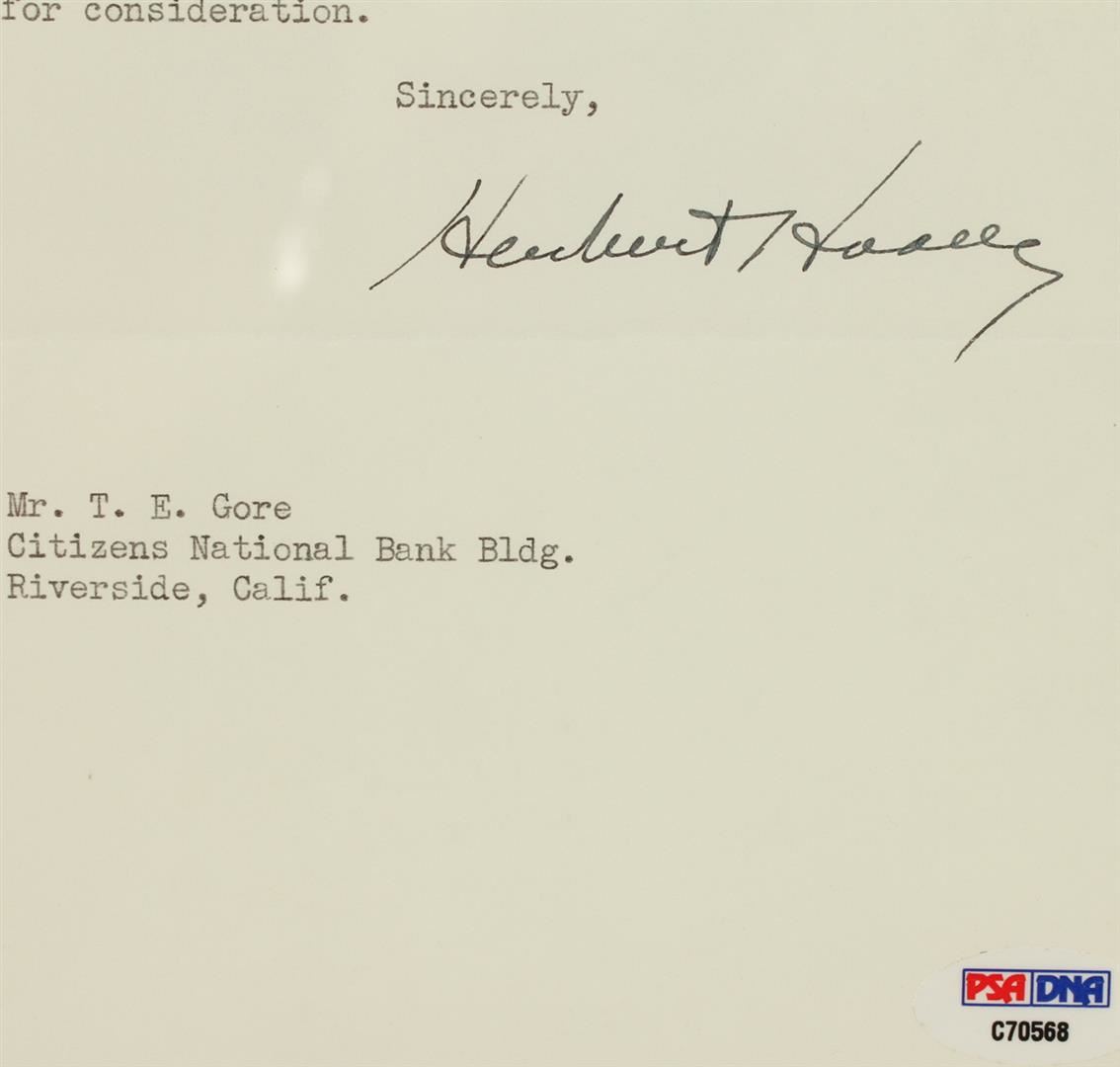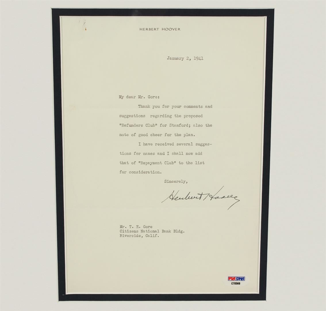 A one of a kind display featuring a letter signed by President Herbert Hoover showcased in a beautiful custom matted display that features a photo of Herbert Hoover. The signature is authenticated by PSA. Herbert Clark Hoover (August 10, 1874 - October 20, 1964) was the 31st President of the United States (1929 - 1933). This piece comes framed and ready to hang! Dimensions: 25" x 24". PSA Certified.