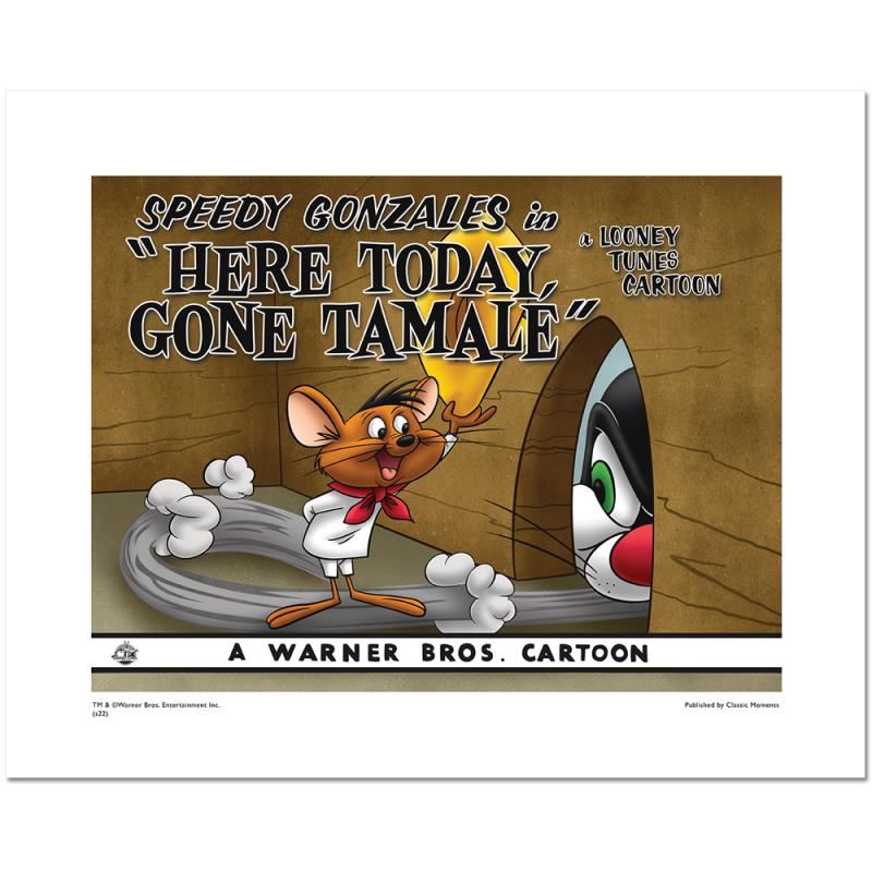 Here Today, Gone Tamale is a limited edition giclee on paper from Warner Bros., numbered with hologram seal of Authenticity. This image was originally used as a lobby card displayed in theater lobbies to publicize animated shorts. Also, includes Certificate of Authenticity! Measures approx. 20 x 16 (with border), 16 x 12 (image).