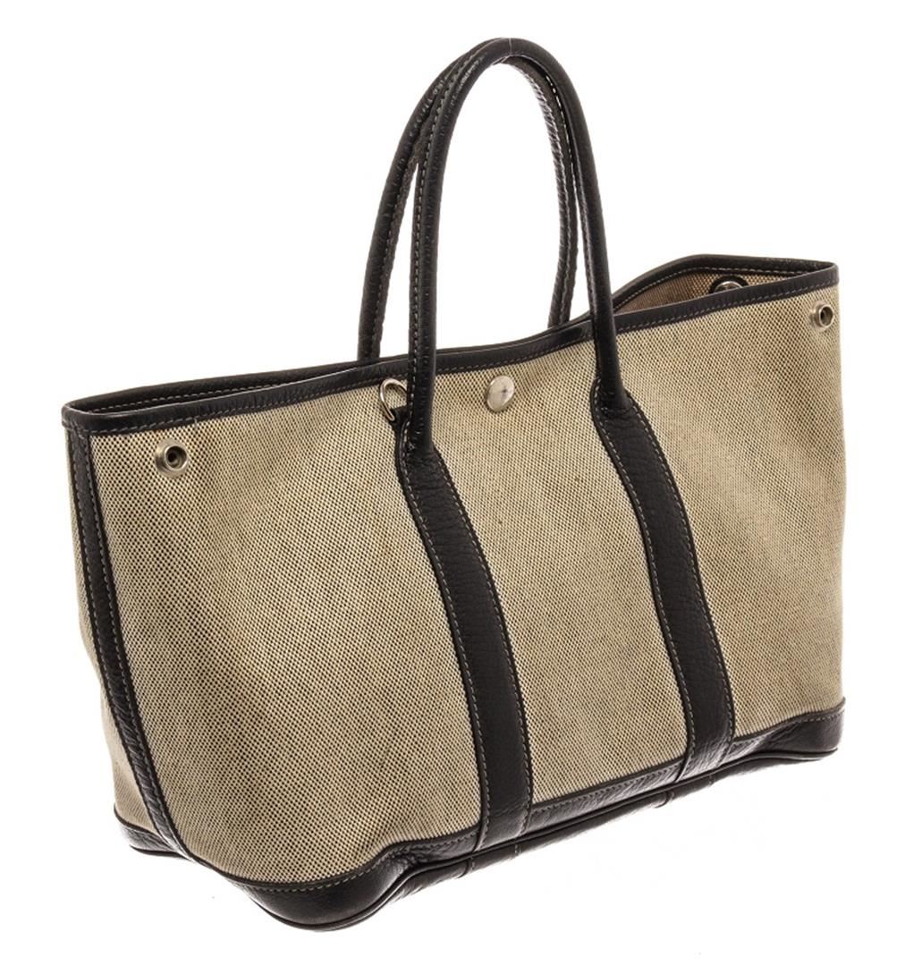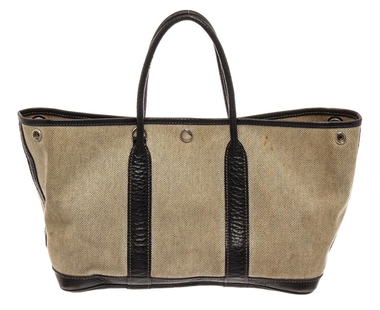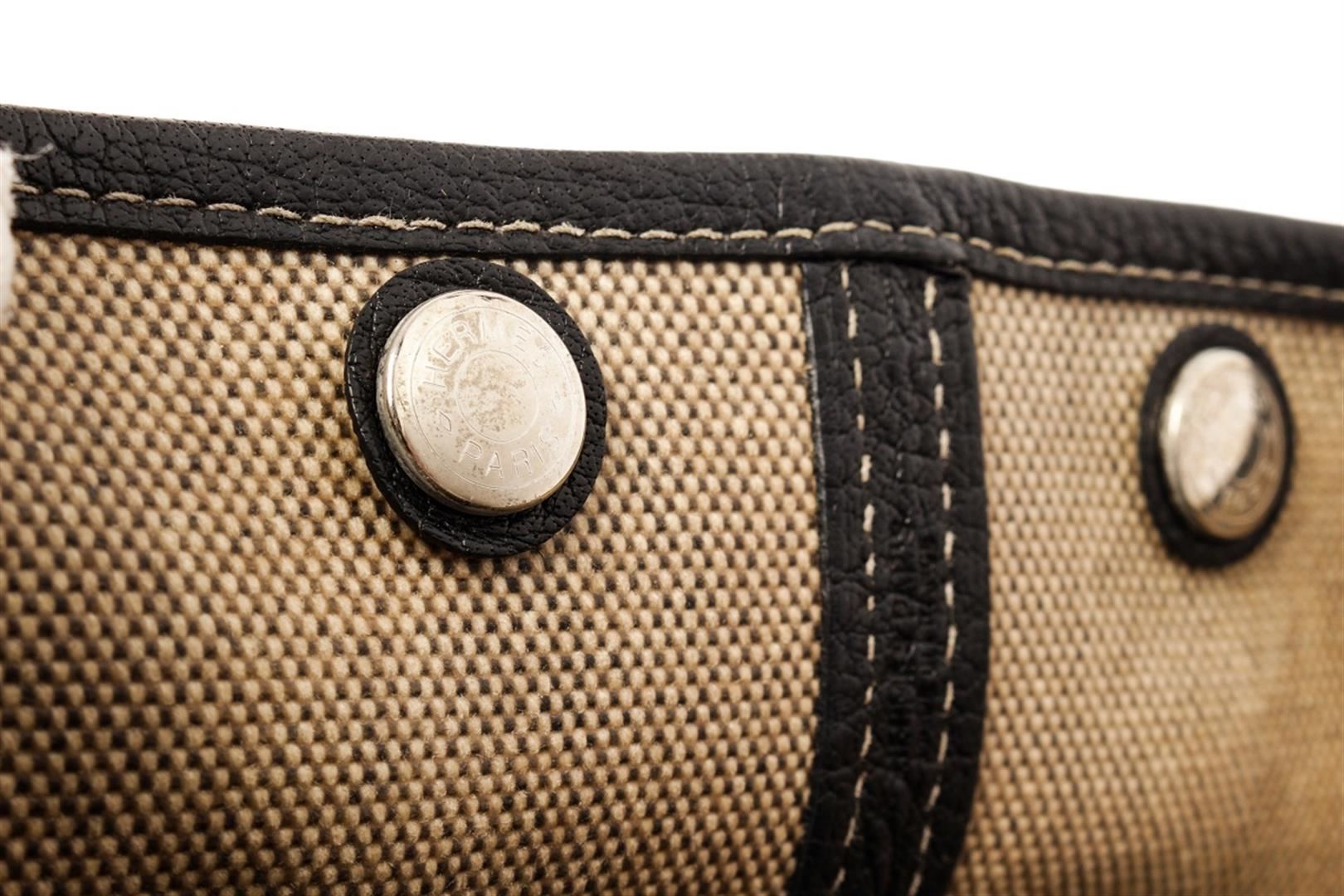 Hermes Beige Canvas Garden Party Tote Bag. All available information is listed in the description and shown in the photos. Hermes Beige Canvas Garden Party Tote Bag with ébène toile h canvas, palladium-plated hardware, negonda leather trim, dual rolled handles, canvas lining, snap closure at front, includes dust bag. Height: 9.5" Width: 14" Depth: 6", Handle Drop: 5" / 24.13 x 35.56 x 15.24 Cm