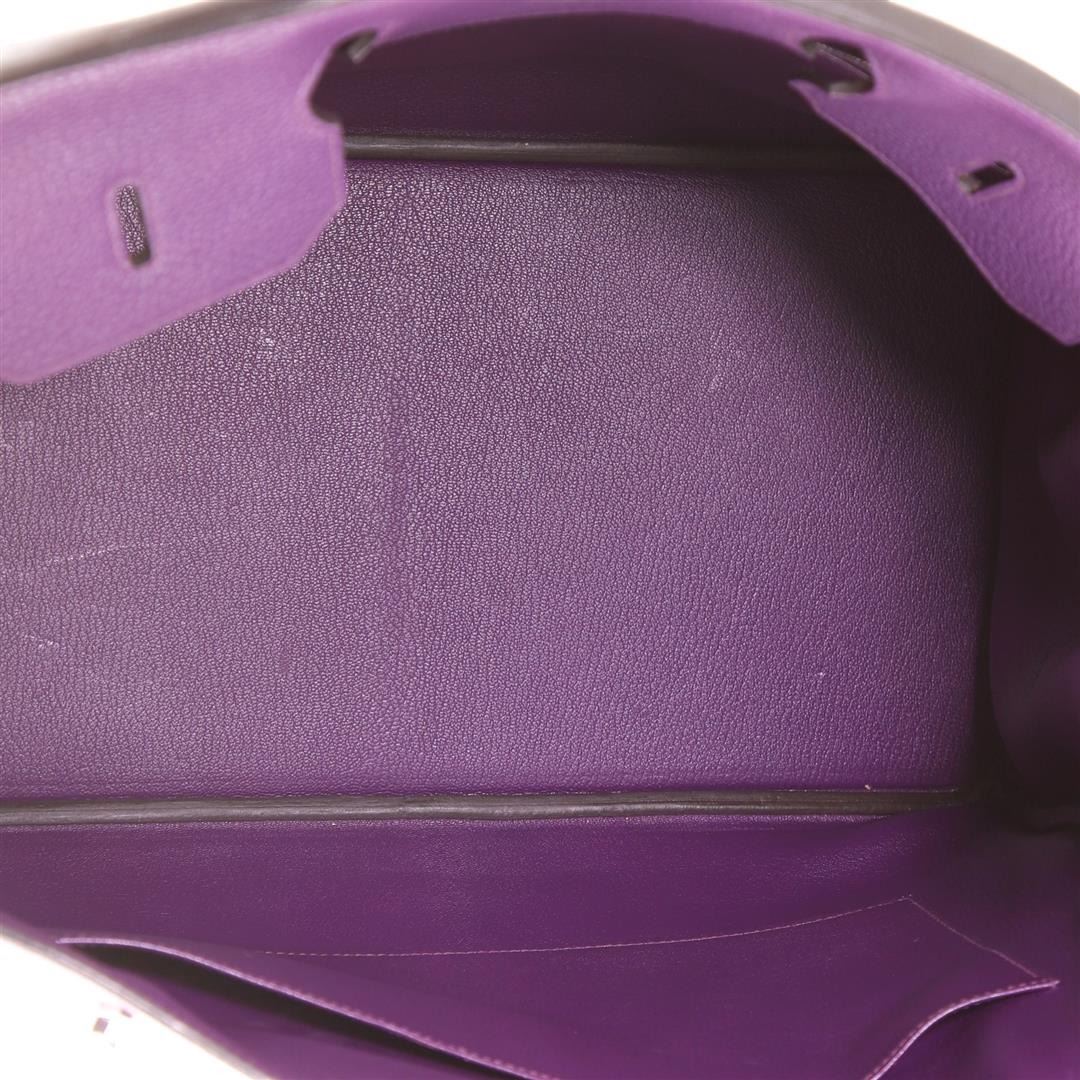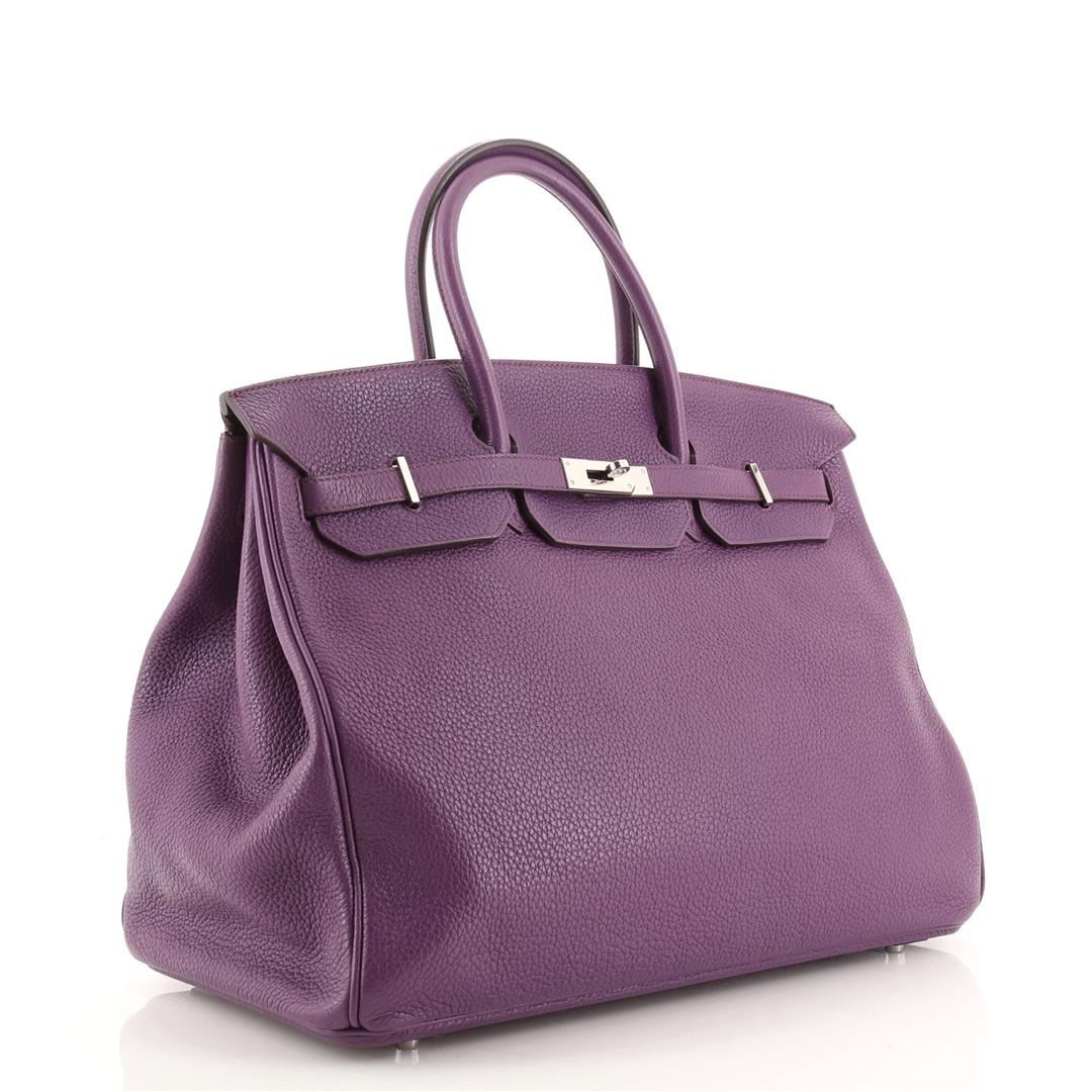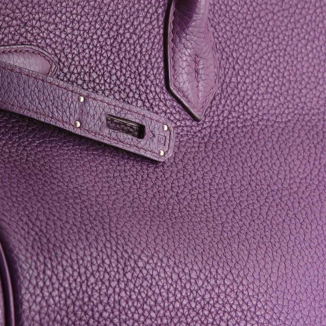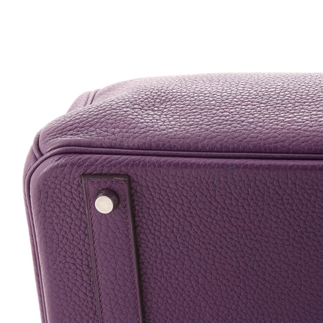 One Hermes Birkin Handbag Purple Clemence with Palladium Hardware 40. Item is sold AS-IS. All available information is listed in the description and shown in the photo. Hermes Birkin Handbag Purple Clemence with Palladium Hardware 40. Loss of shape on exterior and handles. Minor scuffs and indentations on base, splitting on opening wax edge corners, creasing and slight indentions in interior and scuffs on interior base, scratches on hardware. 78848