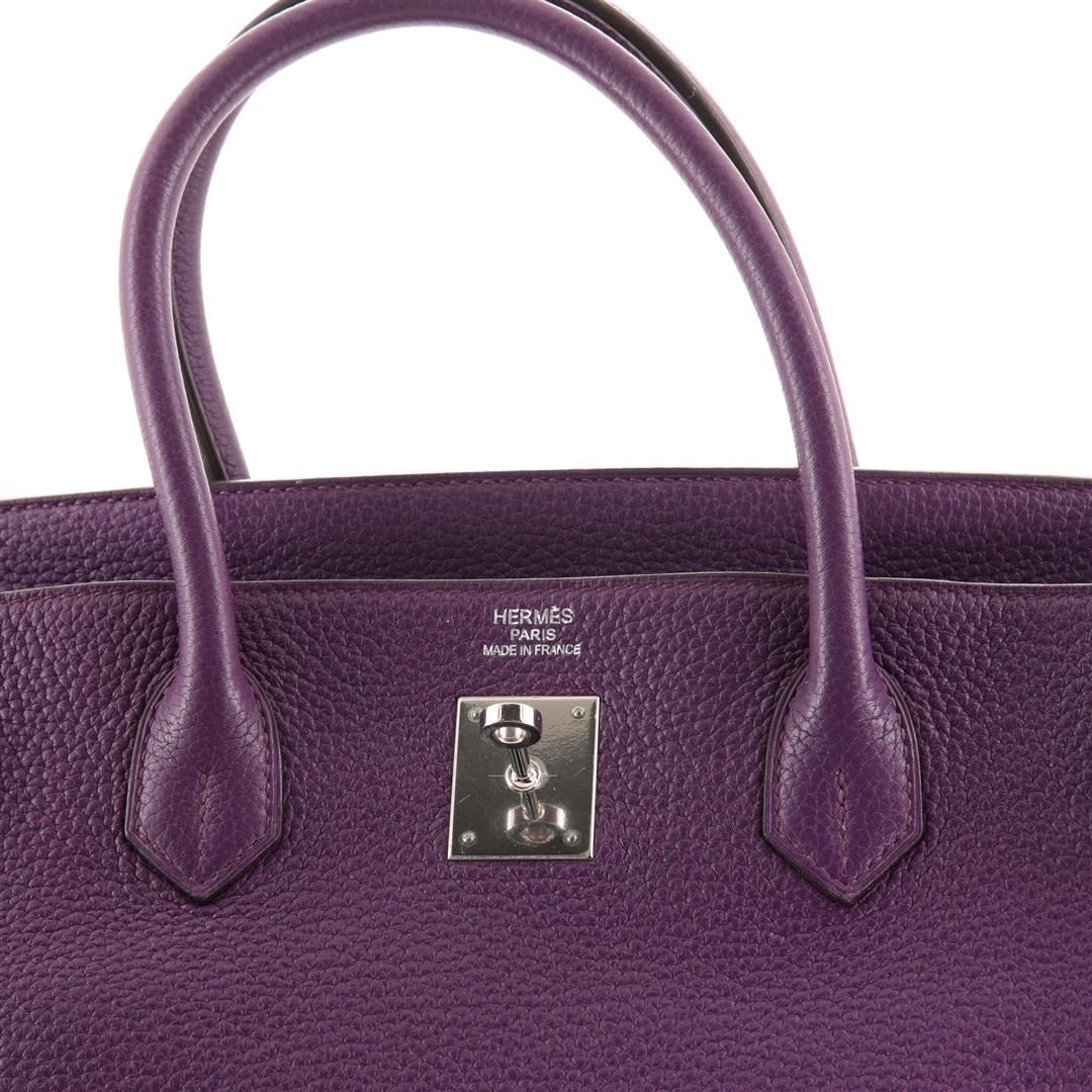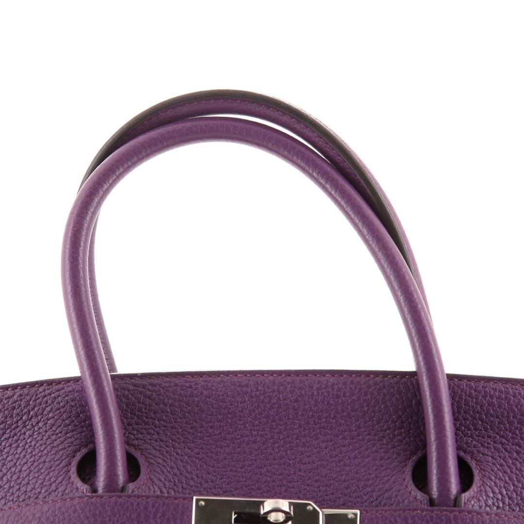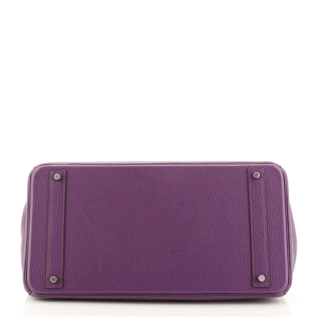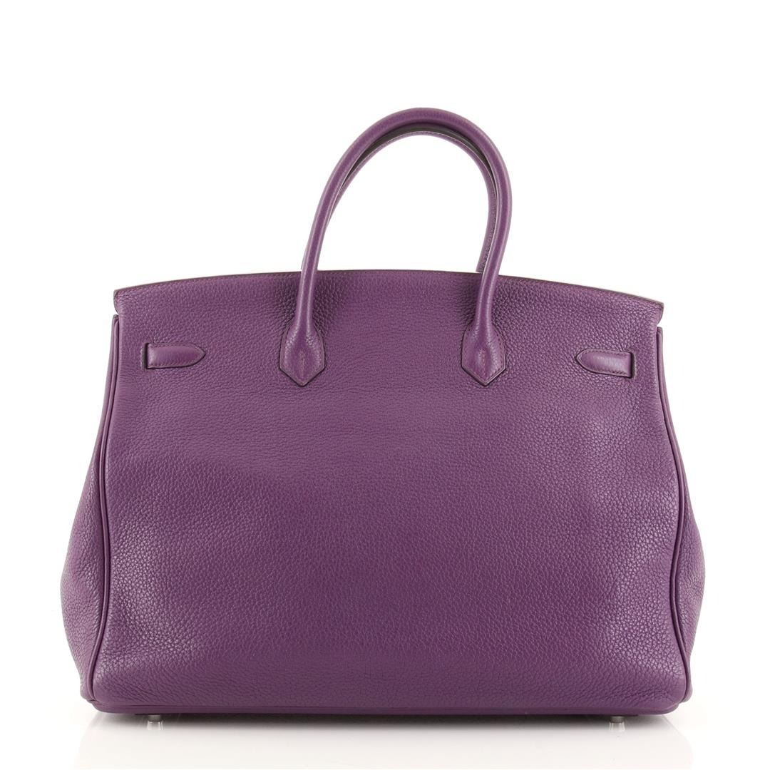 One Hermes Birkin Handbag Purple Clemence with Palladium Hardware 40. Item is sold AS-IS. All available information is listed in the description and shown in the photo. Hermes Birkin Handbag Purple Clemence with Palladium Hardware 40. Loss of shape on exterior and handles. Minor scuffs and indentations on base, splitting on opening wax edge corners, creasing and slight indentions in interior and scuffs on interior base, scratches on hardware. 78848