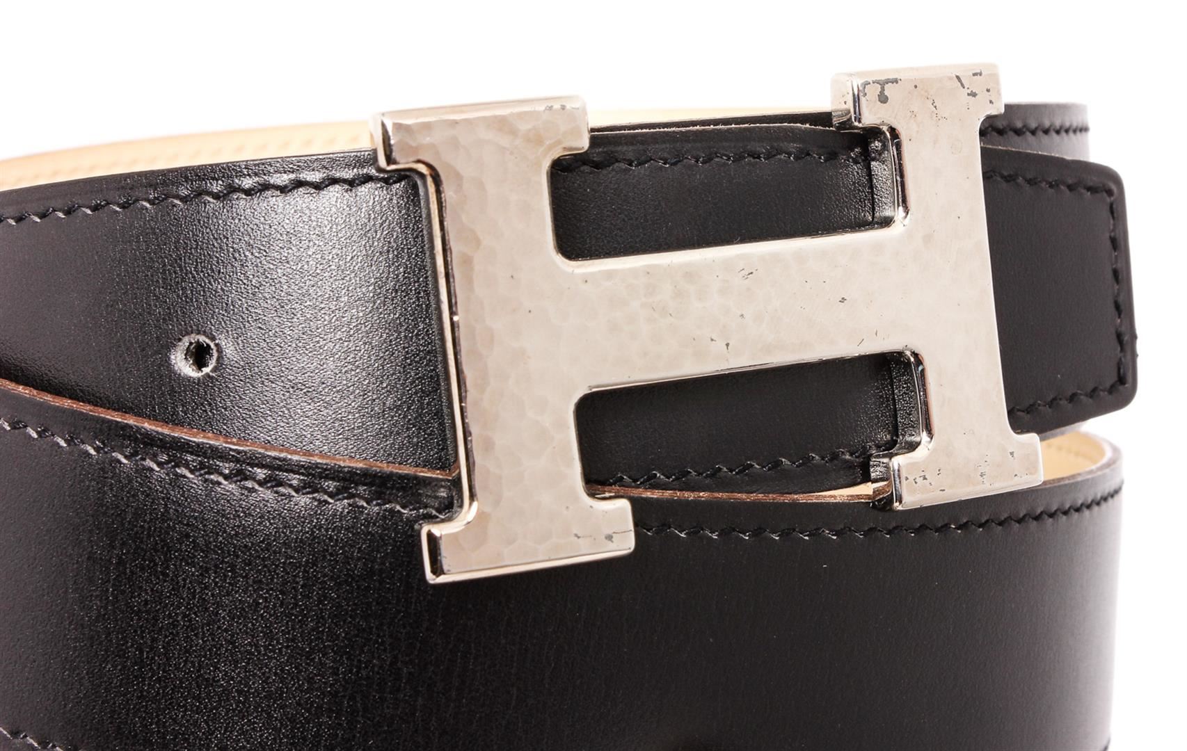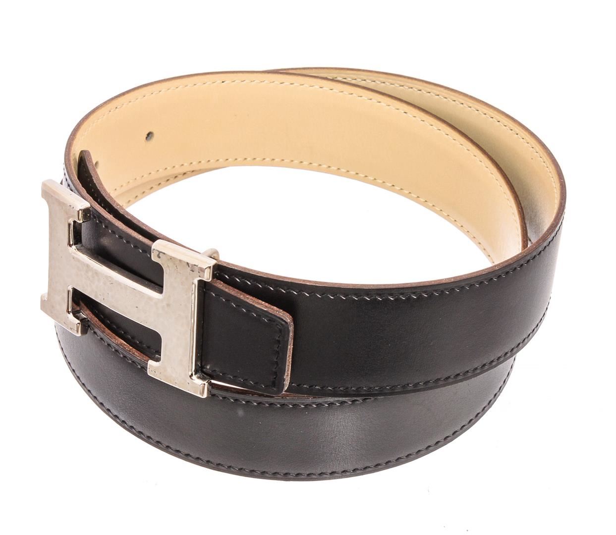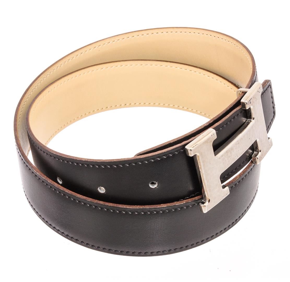 Black and Beige leather Hermes Reversible Constance belt with palladium-plated hammered H buckle featuring peg-in-hole closures. Designer size 75