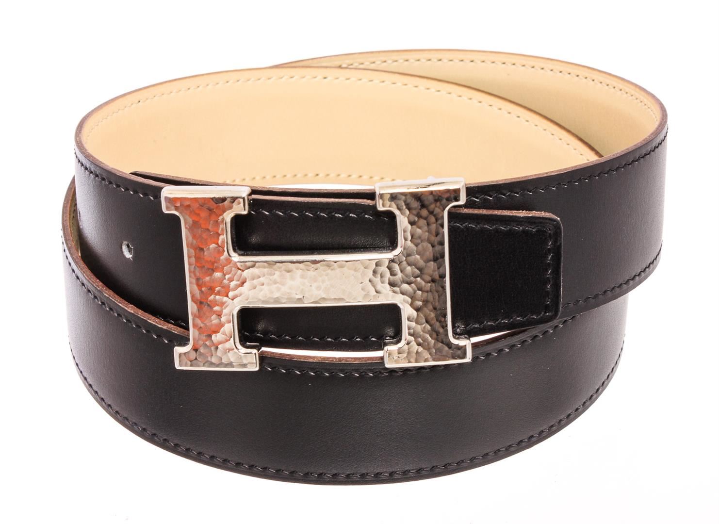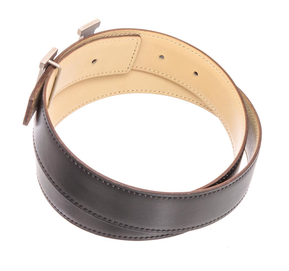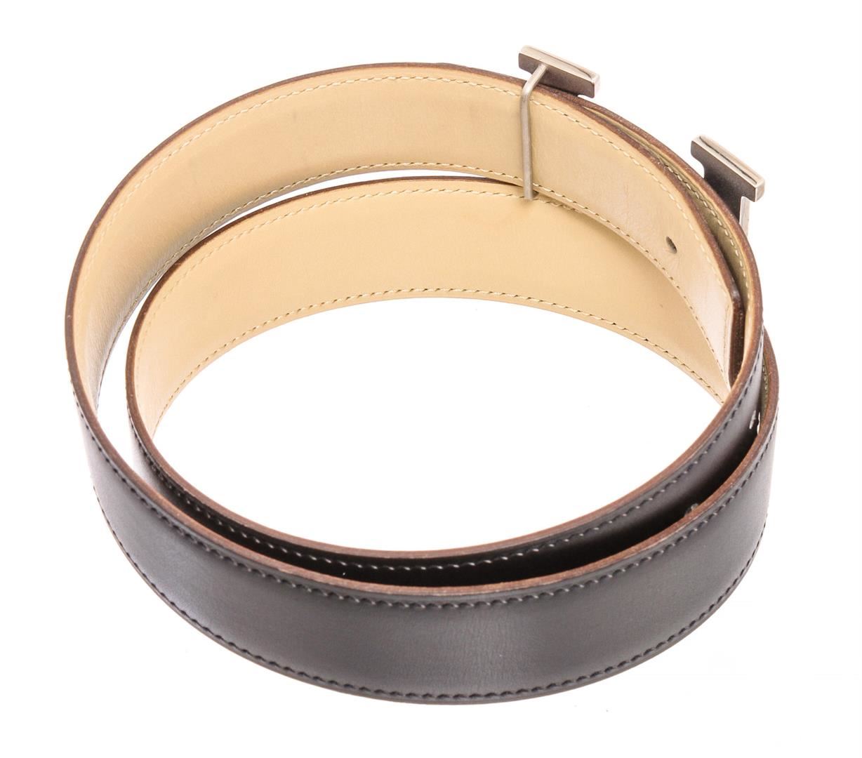 Black and Beige leather Hermes Reversible Constance belt with palladium-plated hammered H buckle featuring peg-in-hole closures. Designer size 75