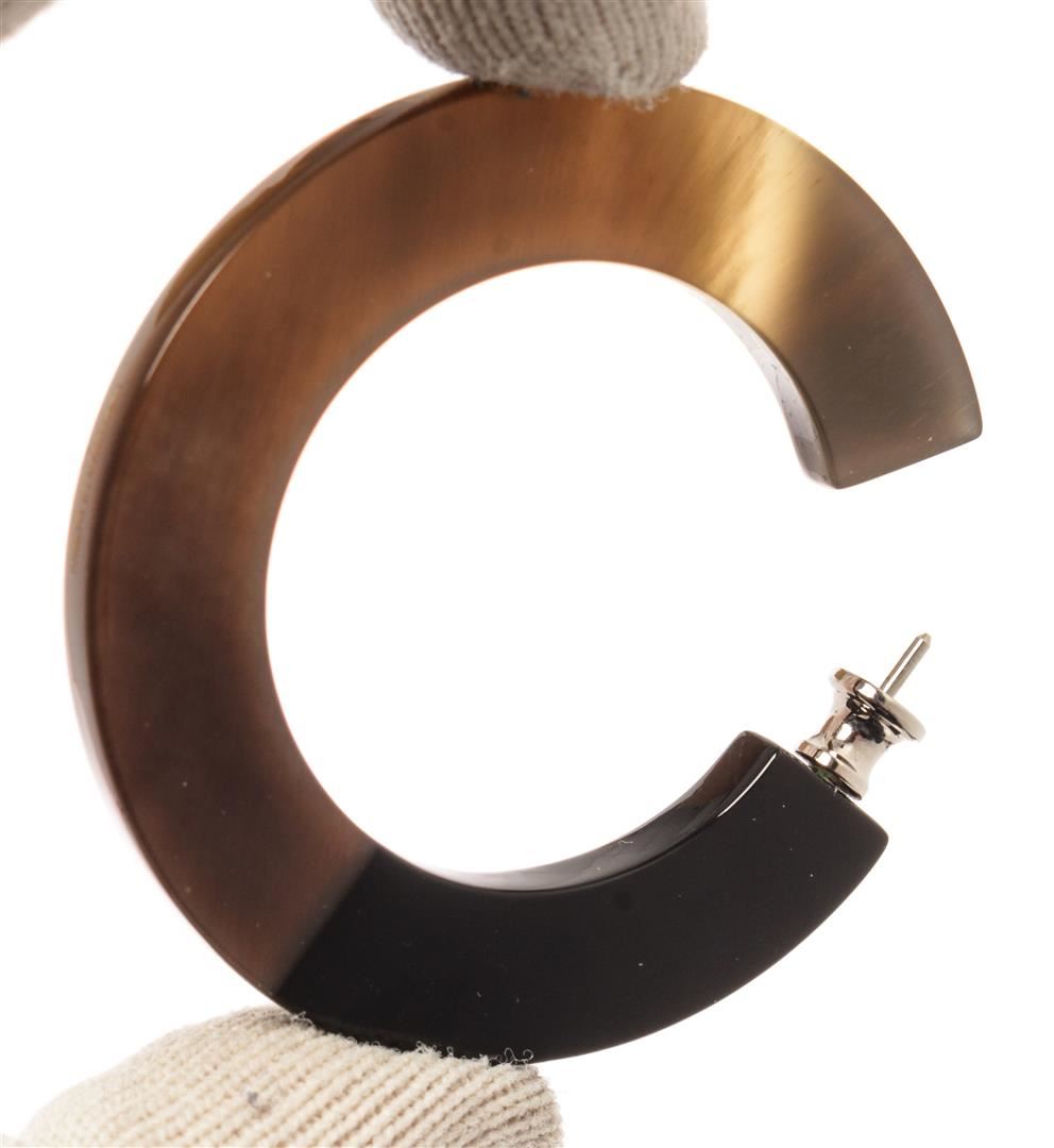 Hermes Black Brown Issum Hoop Earrings. All available information is listed in the description and shown in the photos. Hermes Black Brown Issum Hoop Earrings with hoop shape, silver-tone hardware, elegant polished finish, secure stud closure on back.