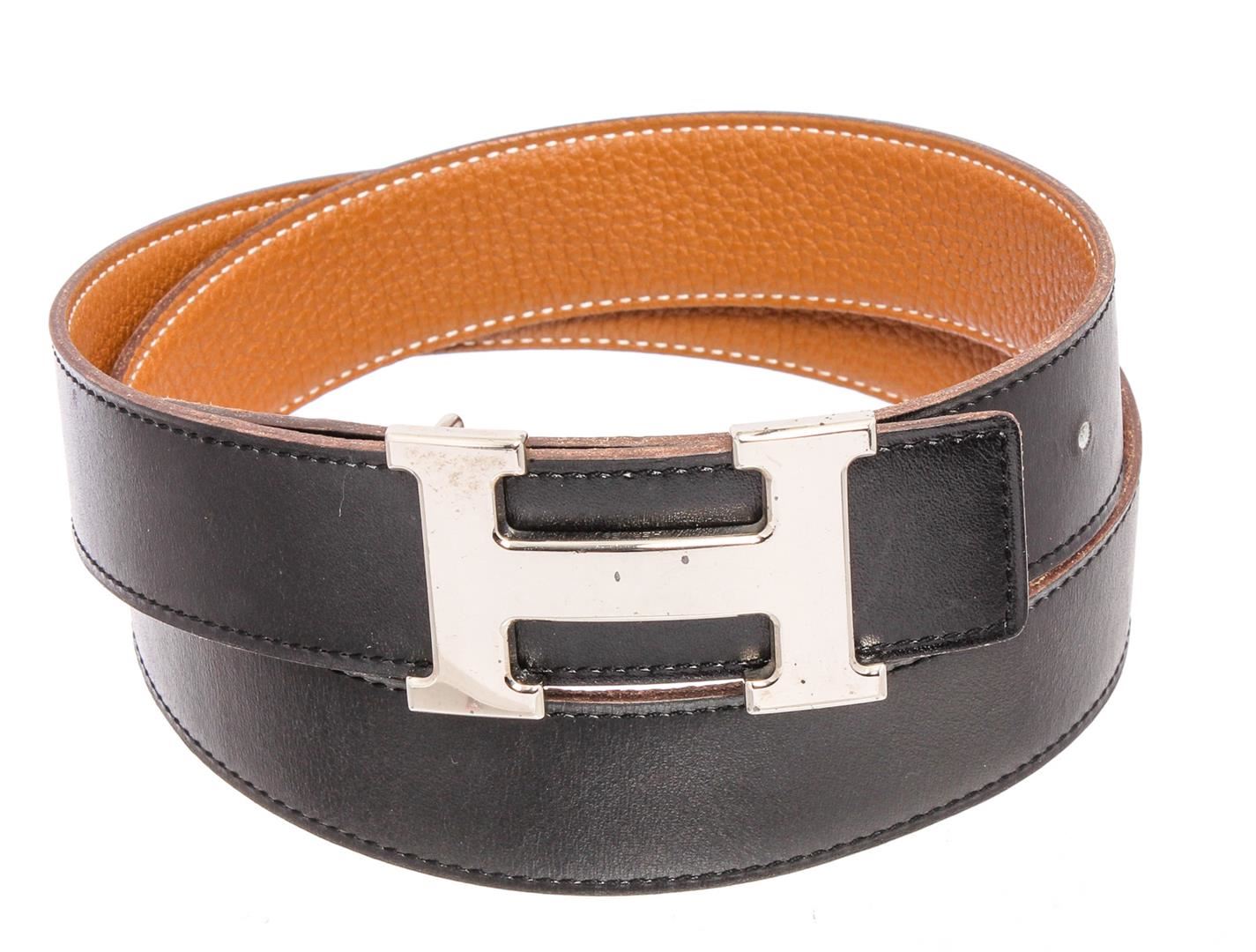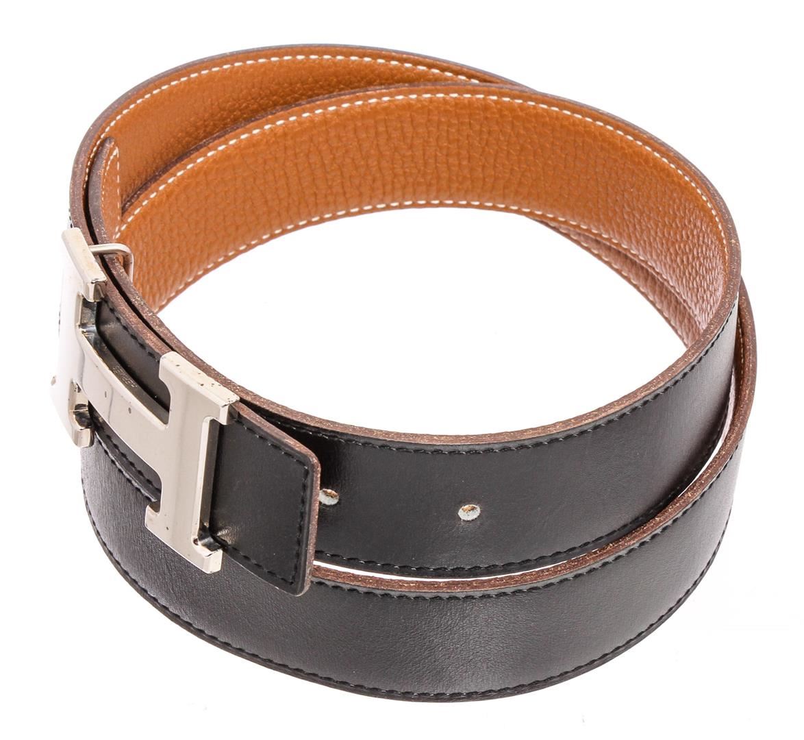 Black and Brown leather Hermes Reversible Constance belt with palladium-plated H buckle featuring peg-in-hole closures. Designer size 70.