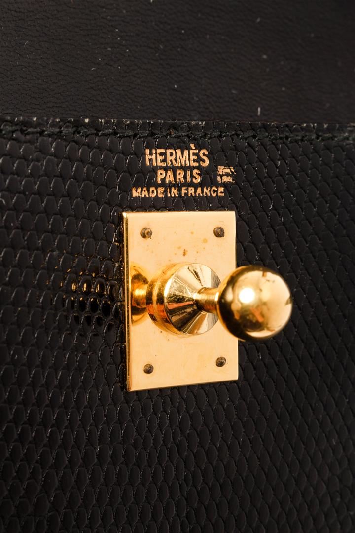 Hermes Black Leather Lizard Kelly Danse Pochette Shoulder Bag. All available information is listed in the description and shown in the photos. Hermes Black Leather Lizard Kelly Danse Pochette Shoulder Bag with black leather, gold-plated hardware, single adjustable shoulder strap, leather lining, turn-lock closure at front. Height 6.5", Width 8.5", Depth 1" / 16.51 x 21.59 x 2.54 cm