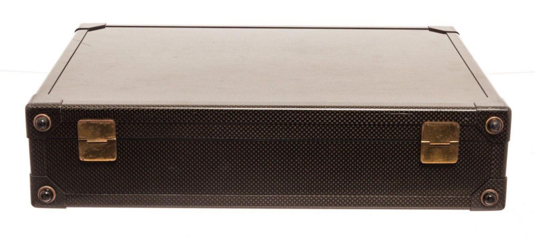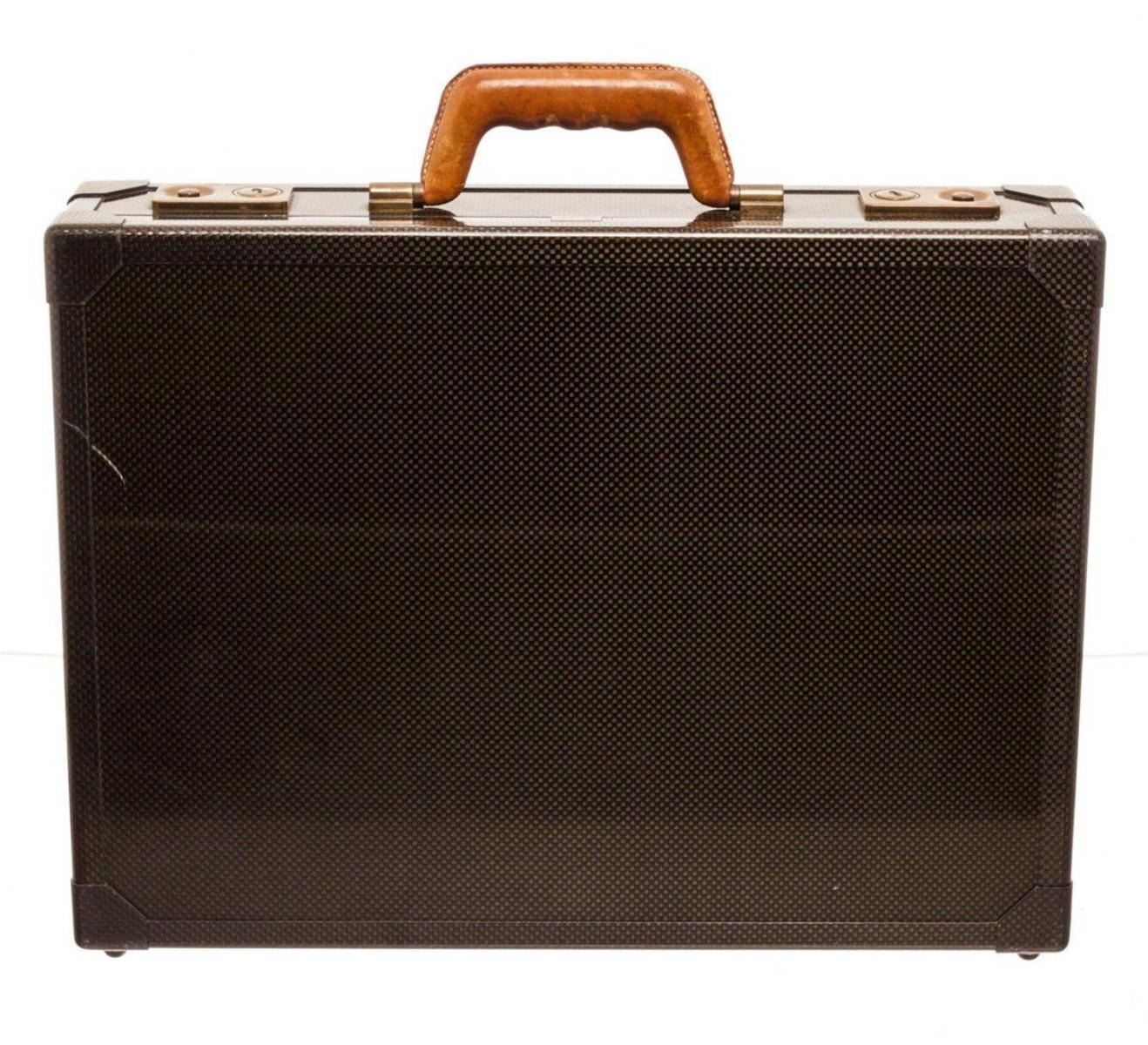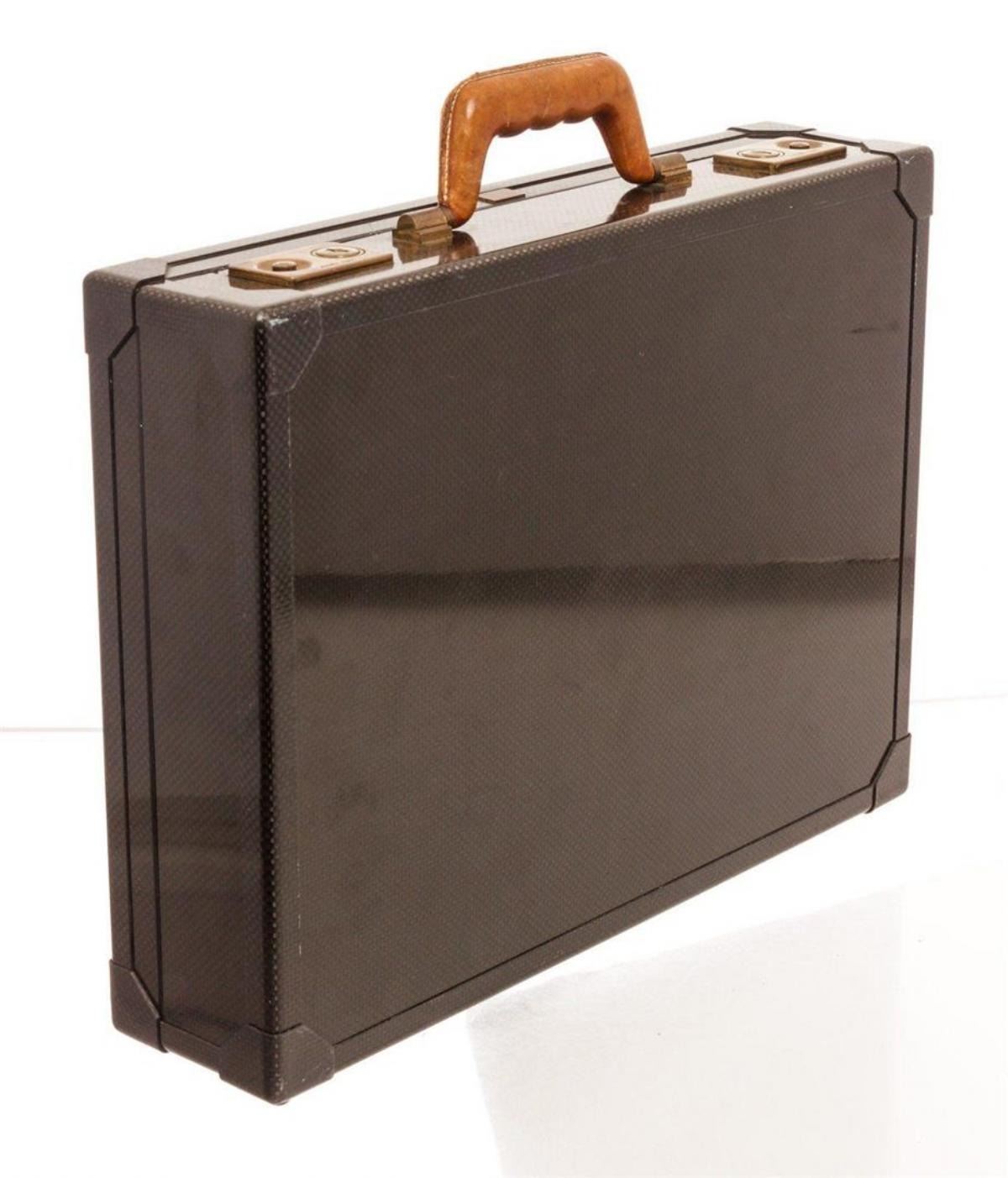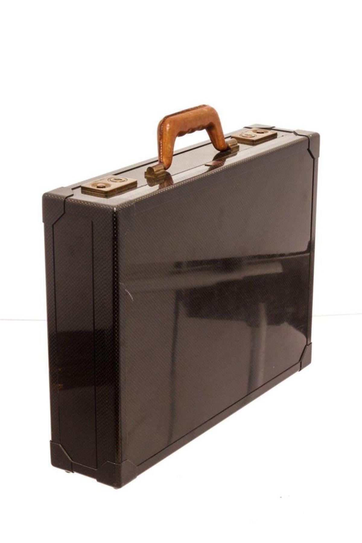 Hermes Black Vintage Carbon Fiber Briefcase with gold-tone hardware, trim leather, interior slip pocket, leather lining, top handle and push lock closure. MEASUREMENTS: Length 14 in / 36 cm Width 18.5 in / 47 cm Height 6 in / 15 cm Condition: Pre-Owned Good overall, please see photographs for detail.