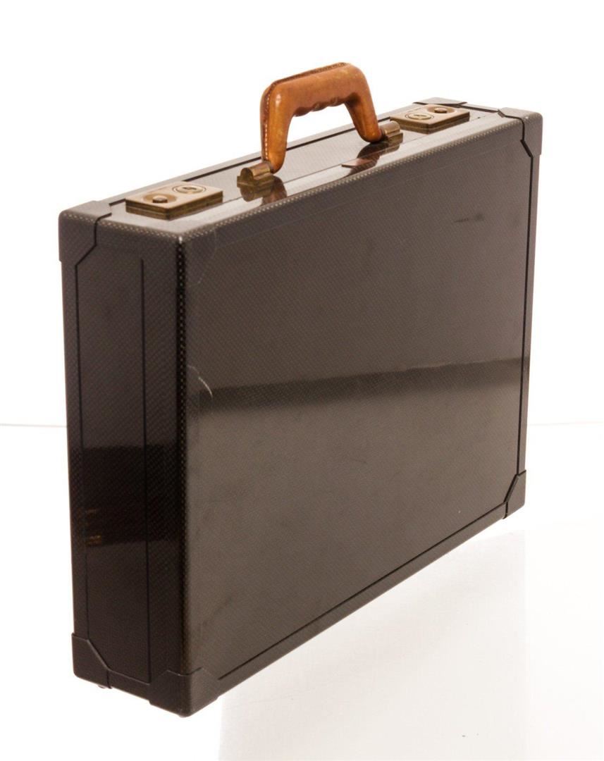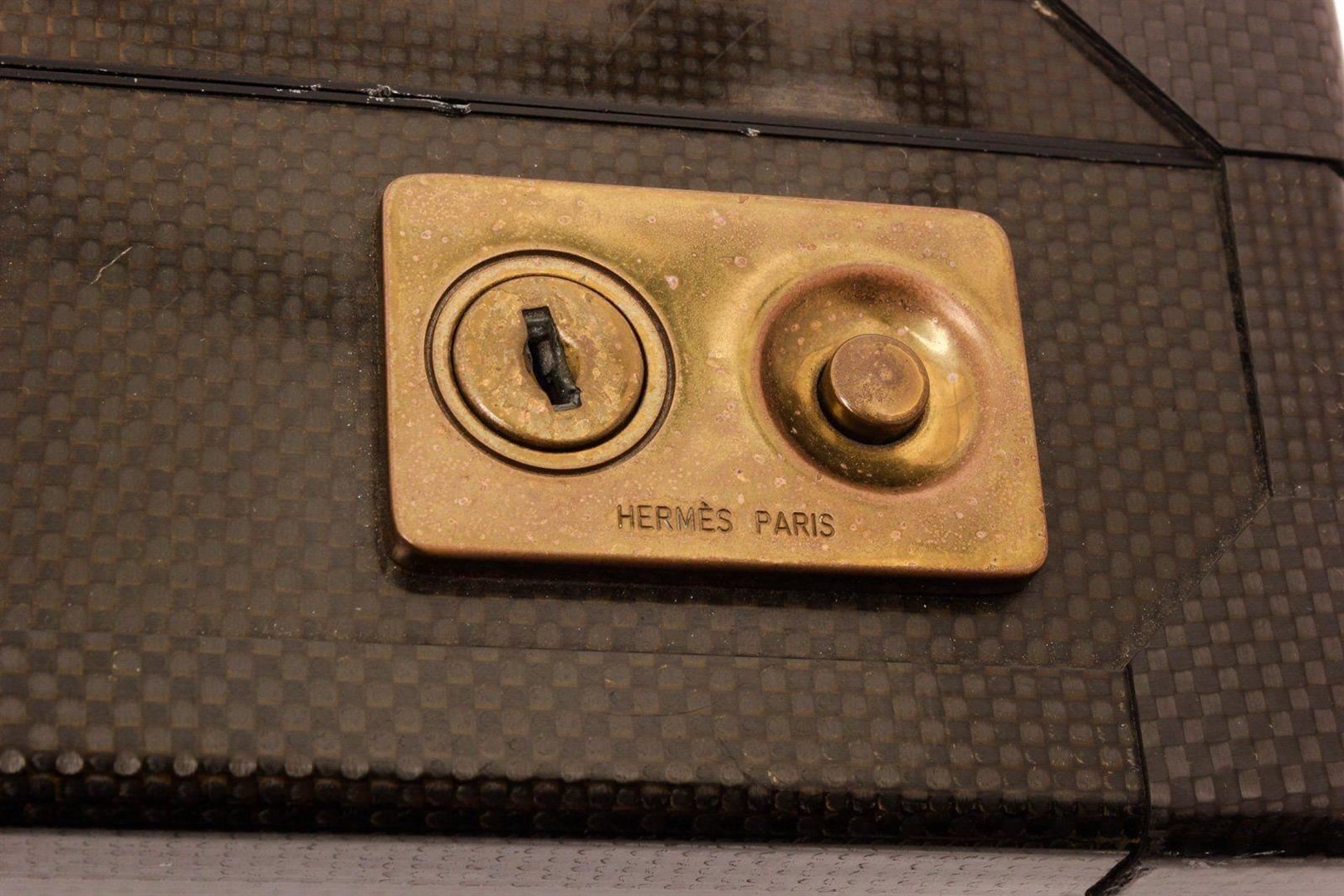 Hermes Black Vintage Carbon Fiber Briefcase with gold-tone hardware, trim leather, interior slip pocket, leather lining, top handle and push lock closure. MEASUREMENTS: Length 14 in / 36 cm Width 18.5 in / 47 cm Height 6 in / 15 cm Condition: Pre-Owned Good overall, please see photographs for detail.