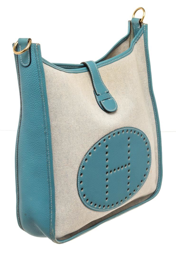 Hermes Blue Leather Evelyne 1 GM Crossbody Bag. All available information is listed in the description and shown in the photos. Hermes Blue Leather Evelyne 1 GM Crossbody Bag with leather, gold-tone hardware, suede lining, shoulder strap and snap closure.