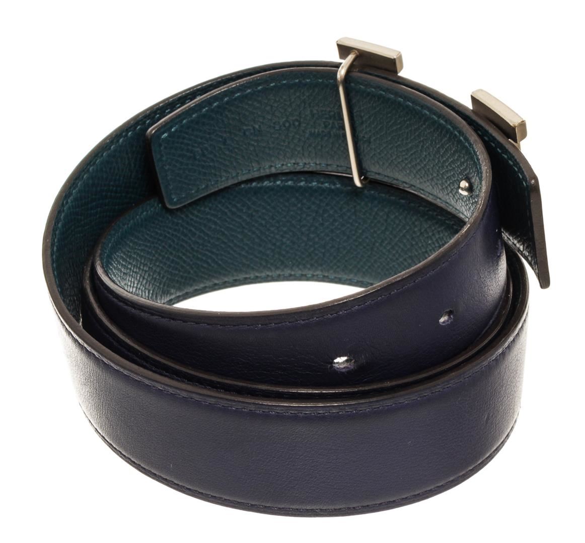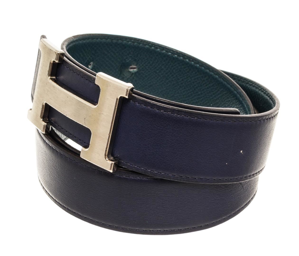 Hermes Blue Leather H Belt. All available information is listed in the description and shown in the photos. Hermes Blue Leather H Belt features tonal stitching sliver-plated Hermes 'H' buckle, blue lining with peg-in-hole closure. Extra punch hole in belt. Please note minor wear to hardware.