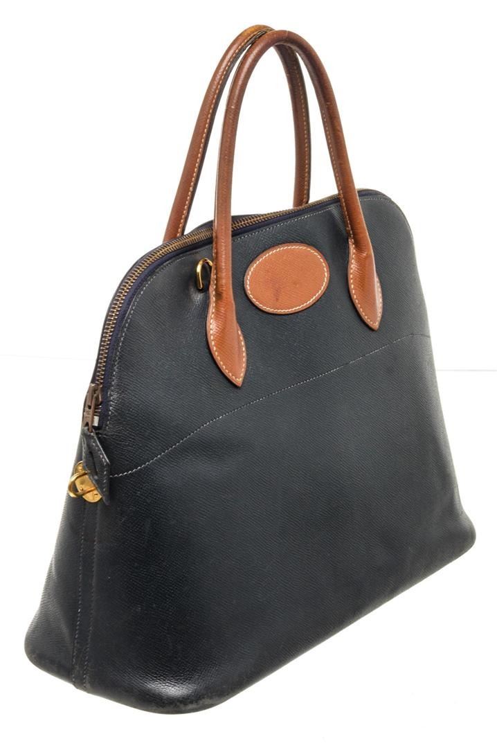 Hermes Bolide Bag handbag blue leather. Brand: Hermes, Style: Bolide Bag, Type: handbag, Exterior Color: blue, Exterior Material: leather, Exterior Pockets: None, Interior Color: brown, Interior Material: fabric, Interior Pockets: one, Closure: zipper, Handle/Strap Type: dual Top Handle, Length: 14 1/2, Width: 5 3/4, Height: 1N/A 1/2, Handle Drop: 4 1/2. Condition: wear on handles. Additional Information: brown handles, brown purse insert. Item is sold AS-IS and all information pertaining to this lot is available in the photos or this description.
