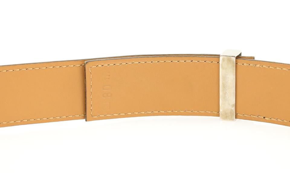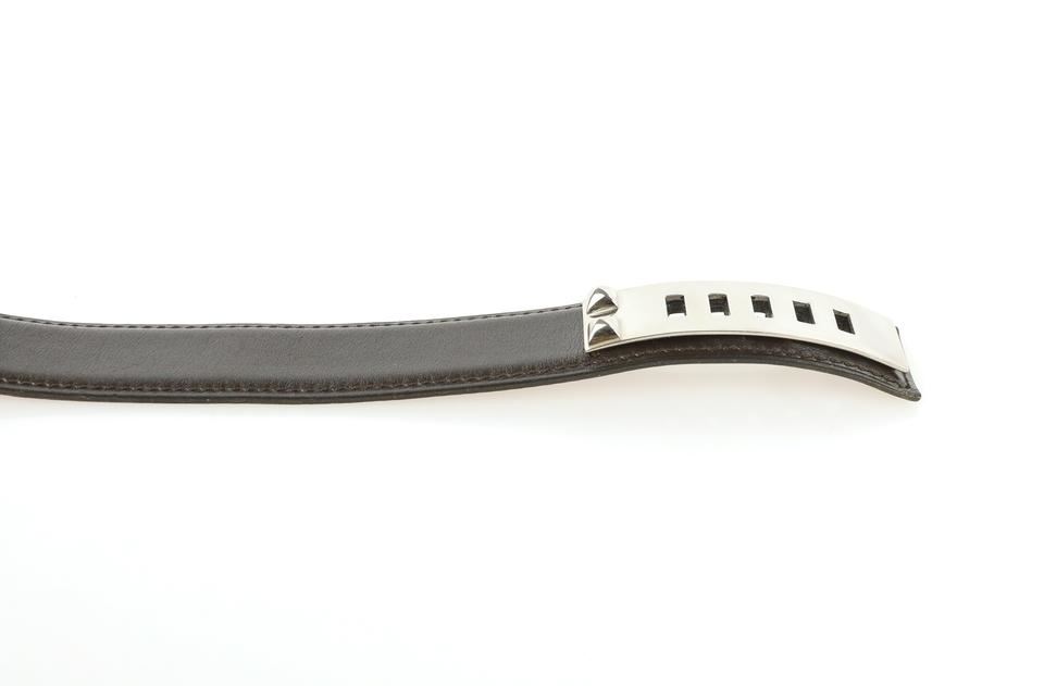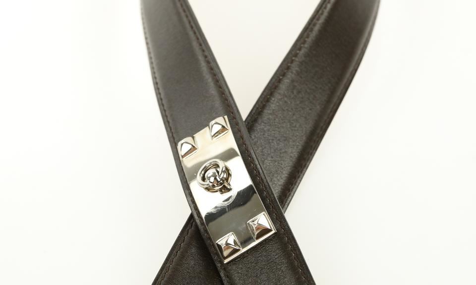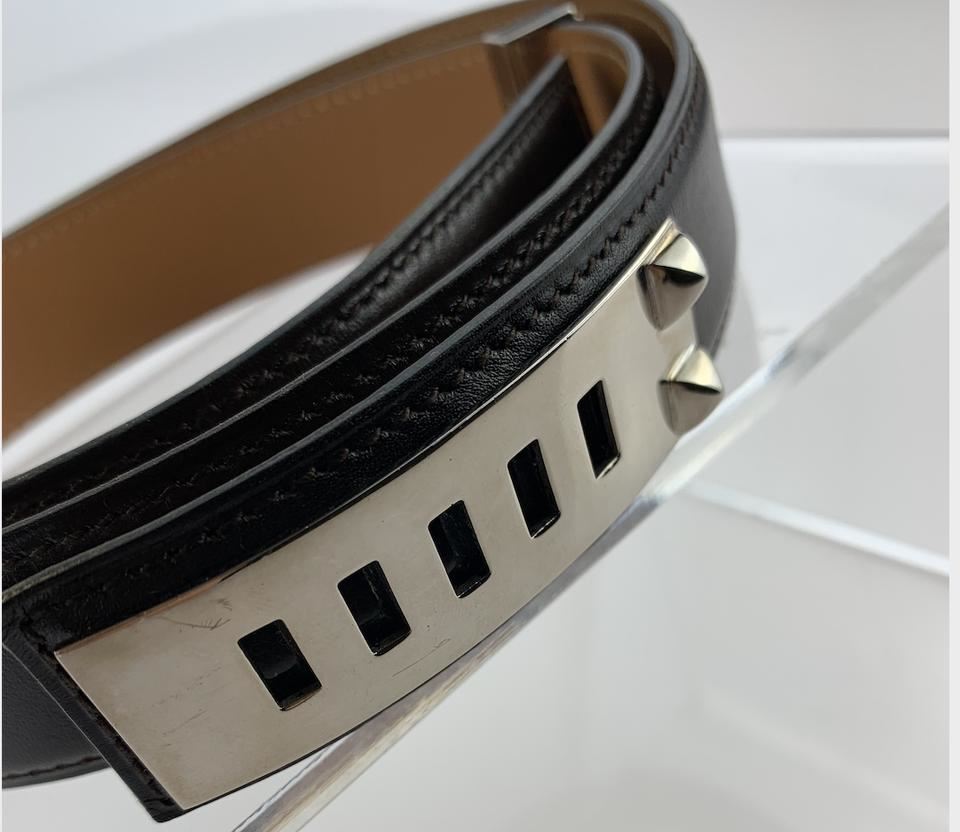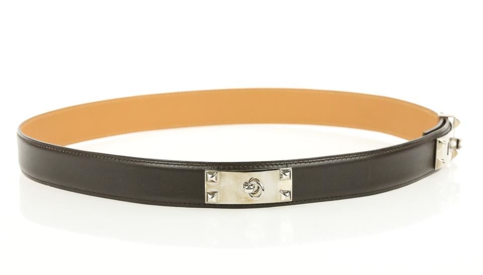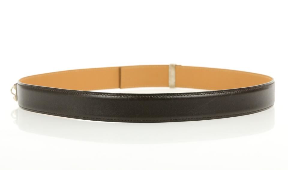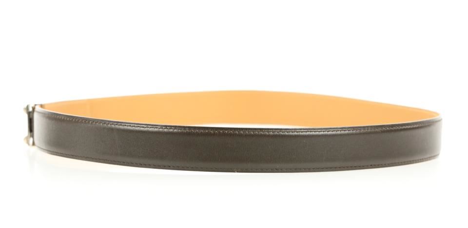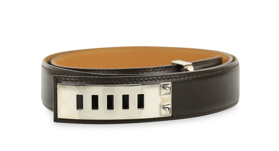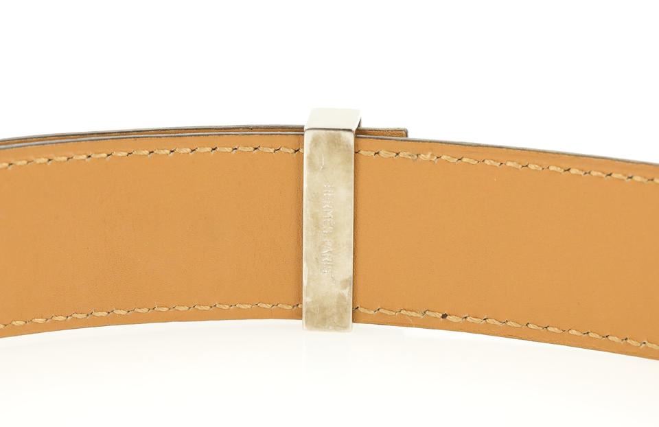 One Hermes Brown Collier De Chien Belt. Hermes Collier De Chien Belt Date stamp: G in a square Silver-tone palladium hardware Brown and gold (natural brown) box leather strap ." Full ." " "