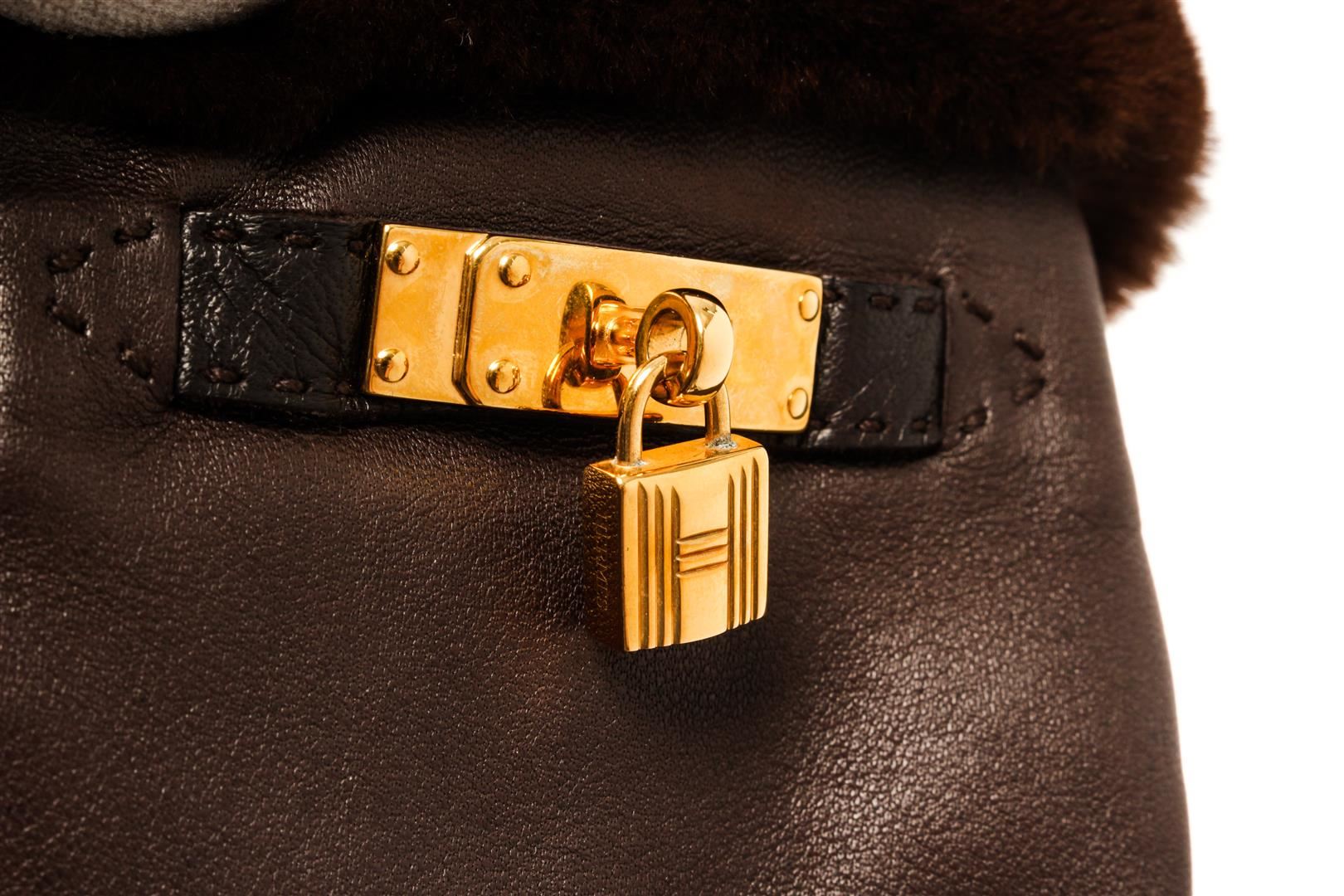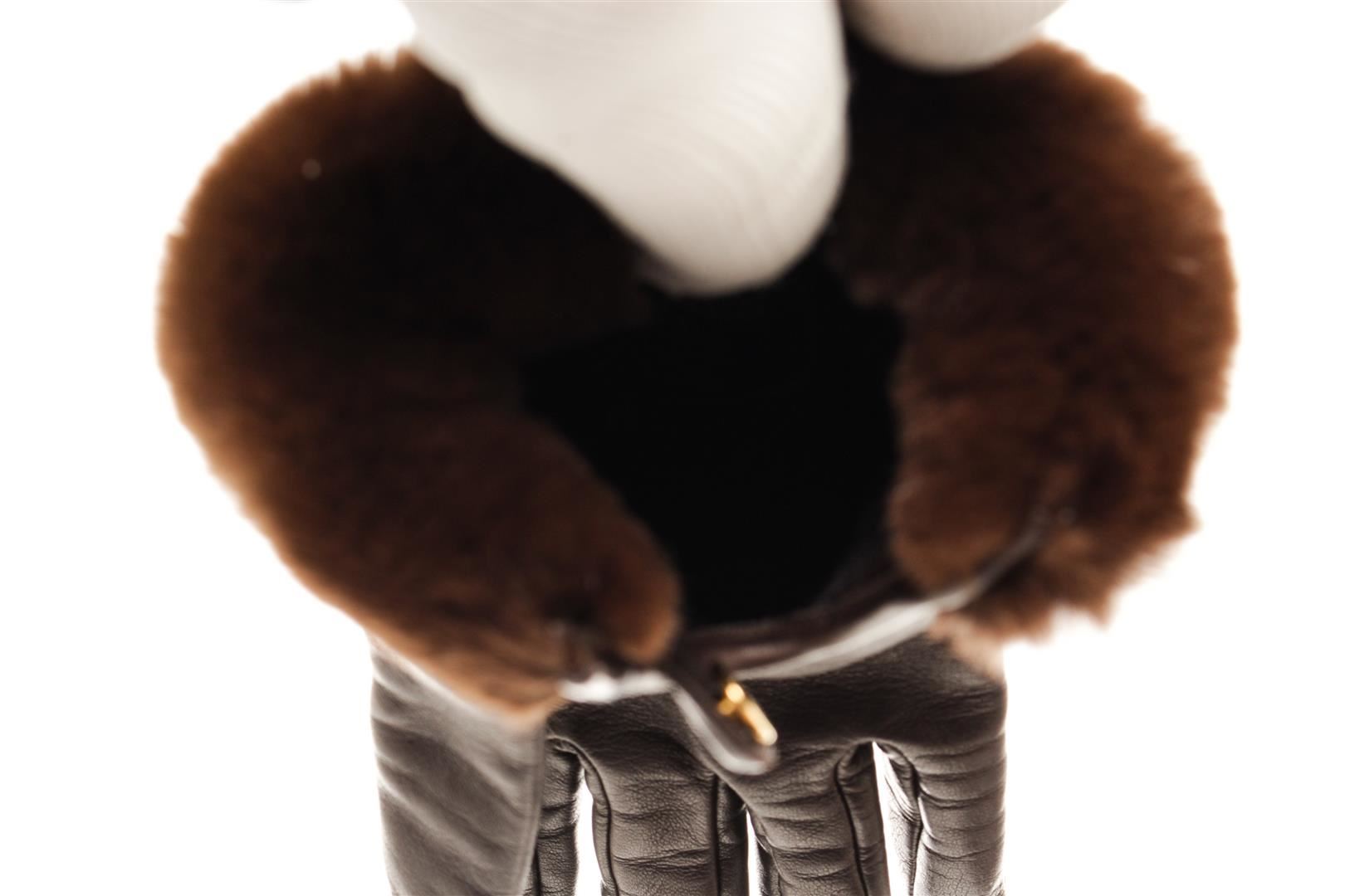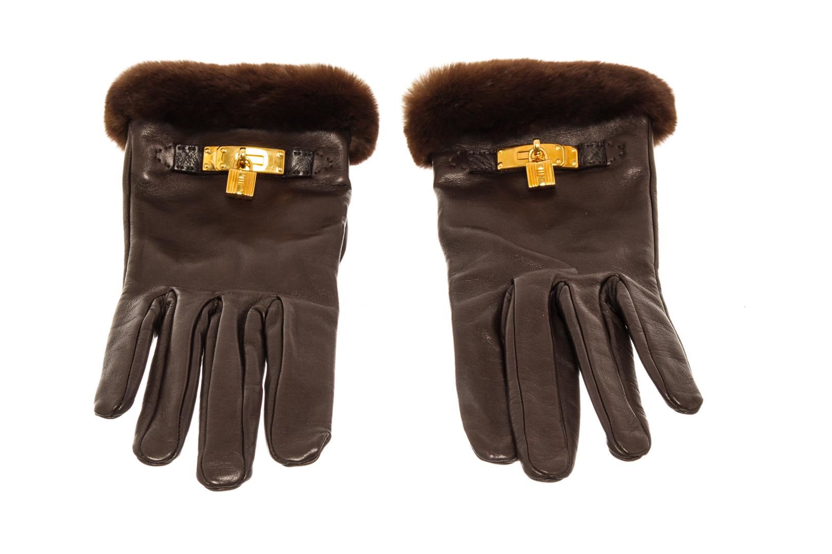 One Hermes Brown Leather Gloves. Item is sold AS-IS. All available information is listed in the description and shown in the photo. Hermes Brown Leather Gloves features Gold hardware, brown leather lining, brown mink fur along the wrists, and snap closure.