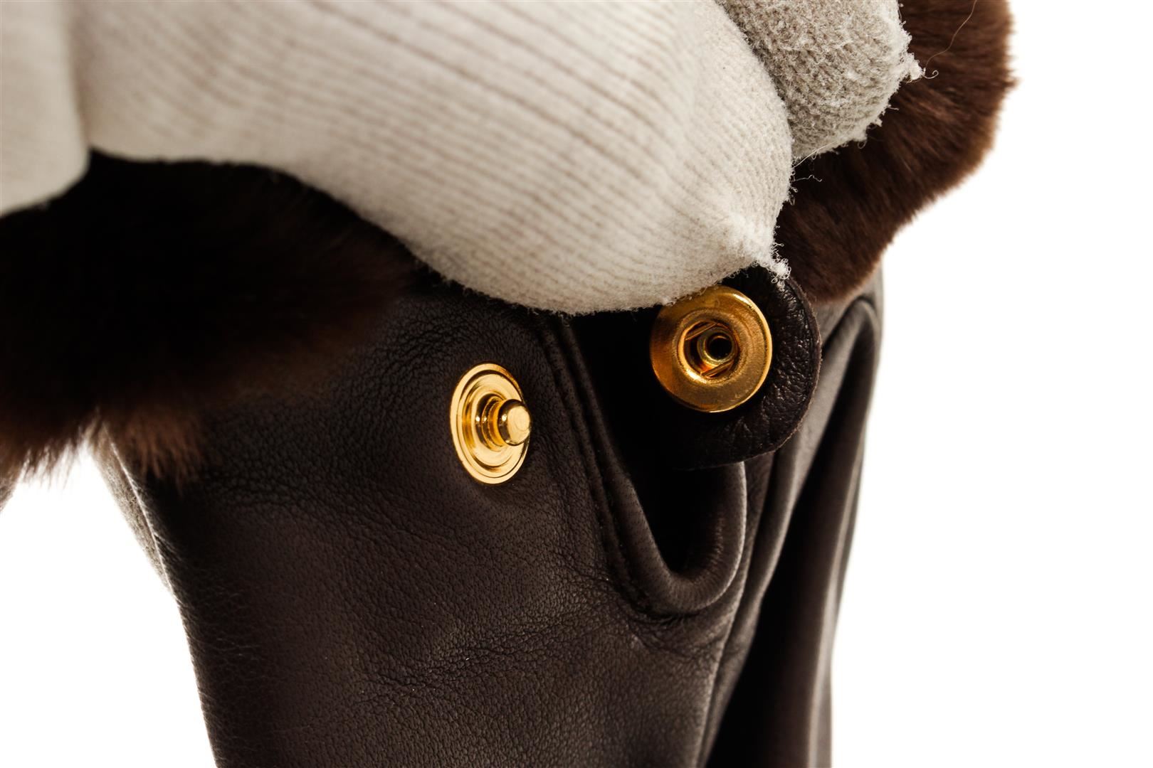 One Hermes Brown Leather Gloves. Item is sold AS-IS. All available information is listed in the description and shown in the photo. Hermes Brown Leather Gloves features Gold hardware, brown leather lining, brown mink fur along the wrists, and snap closure.