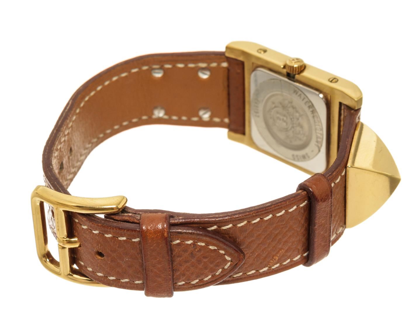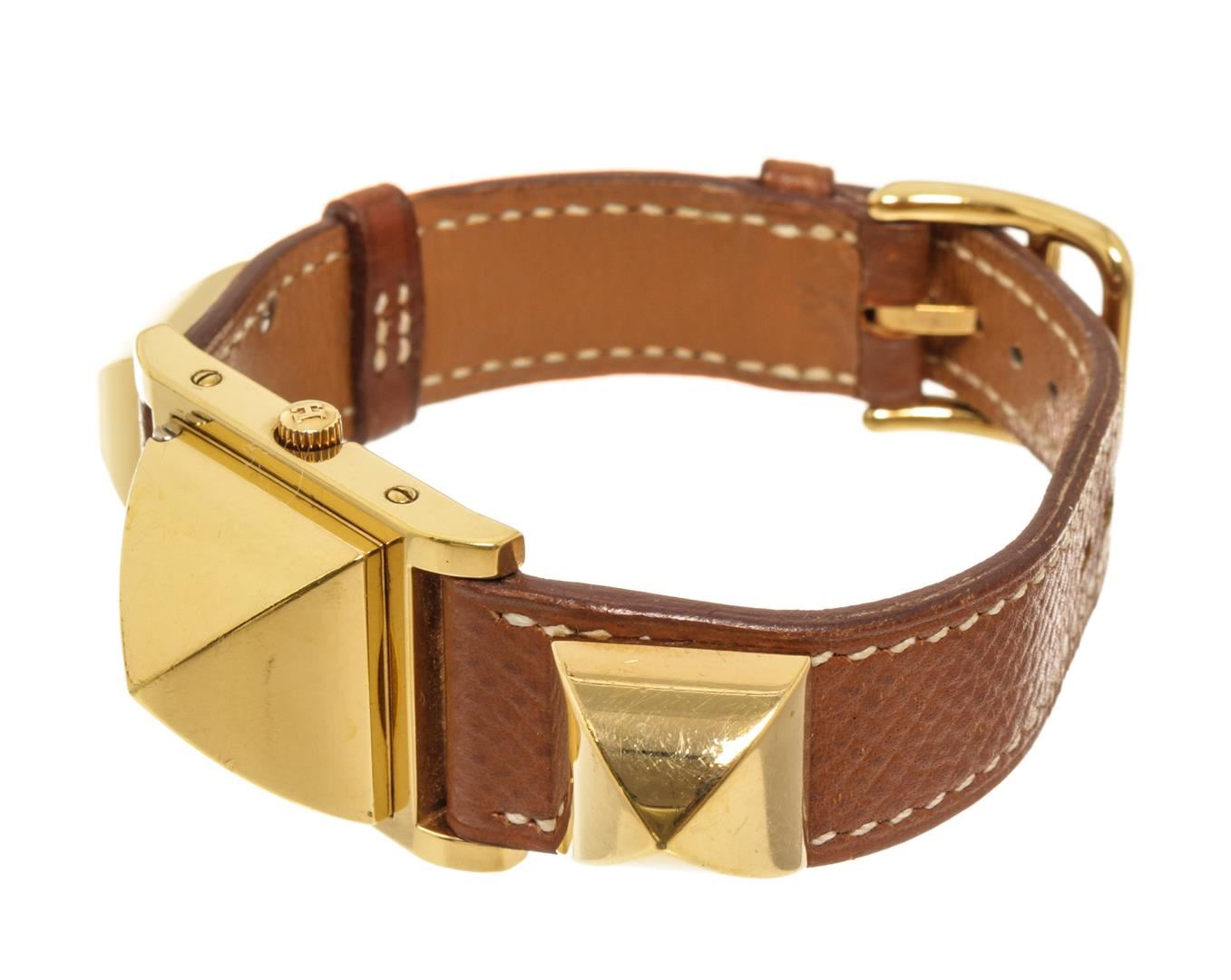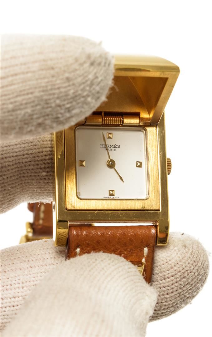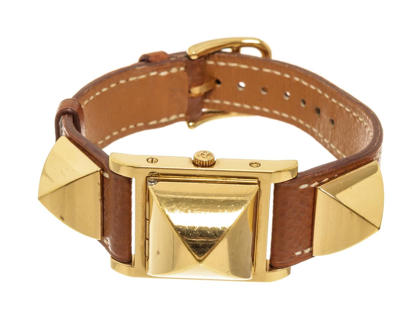 One Hermes Brown Metal and Leather Medor Plated 23 Quartz Watch. Item is sold AS-IS. All available information is listed in the description and shown in the photo. Hermes Brown Metal and Leather Medor Plated 23 Quartz Watch with dial color white, band color brown, band material leather, case material plated 18k yellow gold, movement quartz "Case Size/Width: 23mm Watch Height: 16mm Band Width: 18mm Wrist circumference: 6.0""" Height: 0.62" x Width: 0.70" Inches