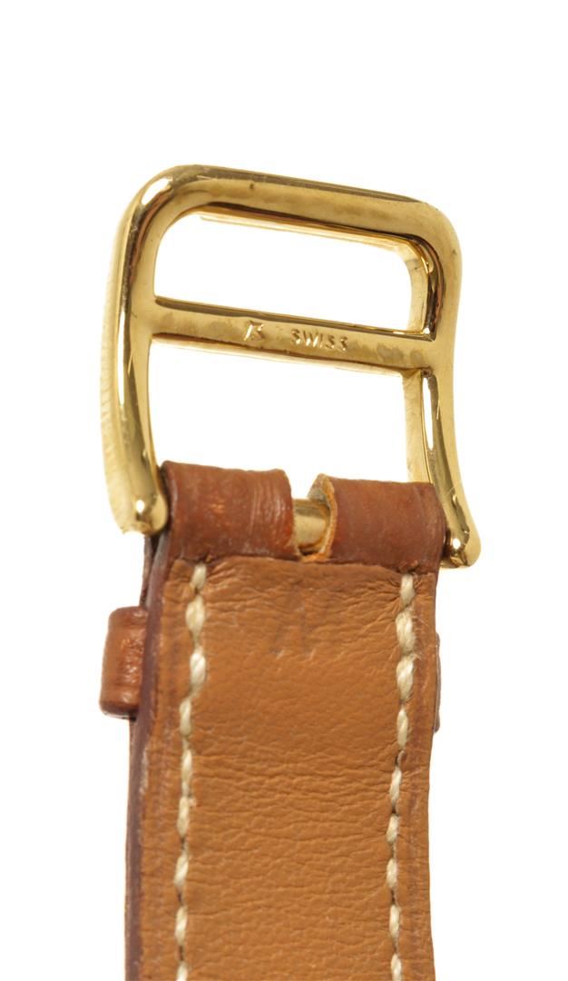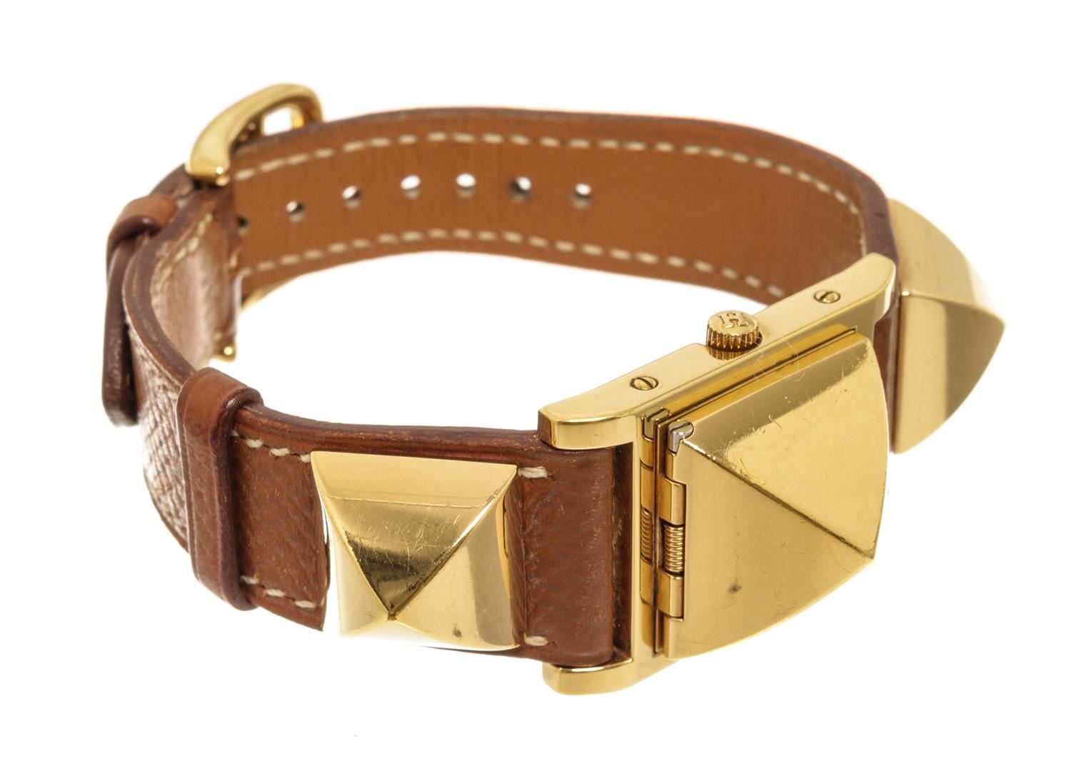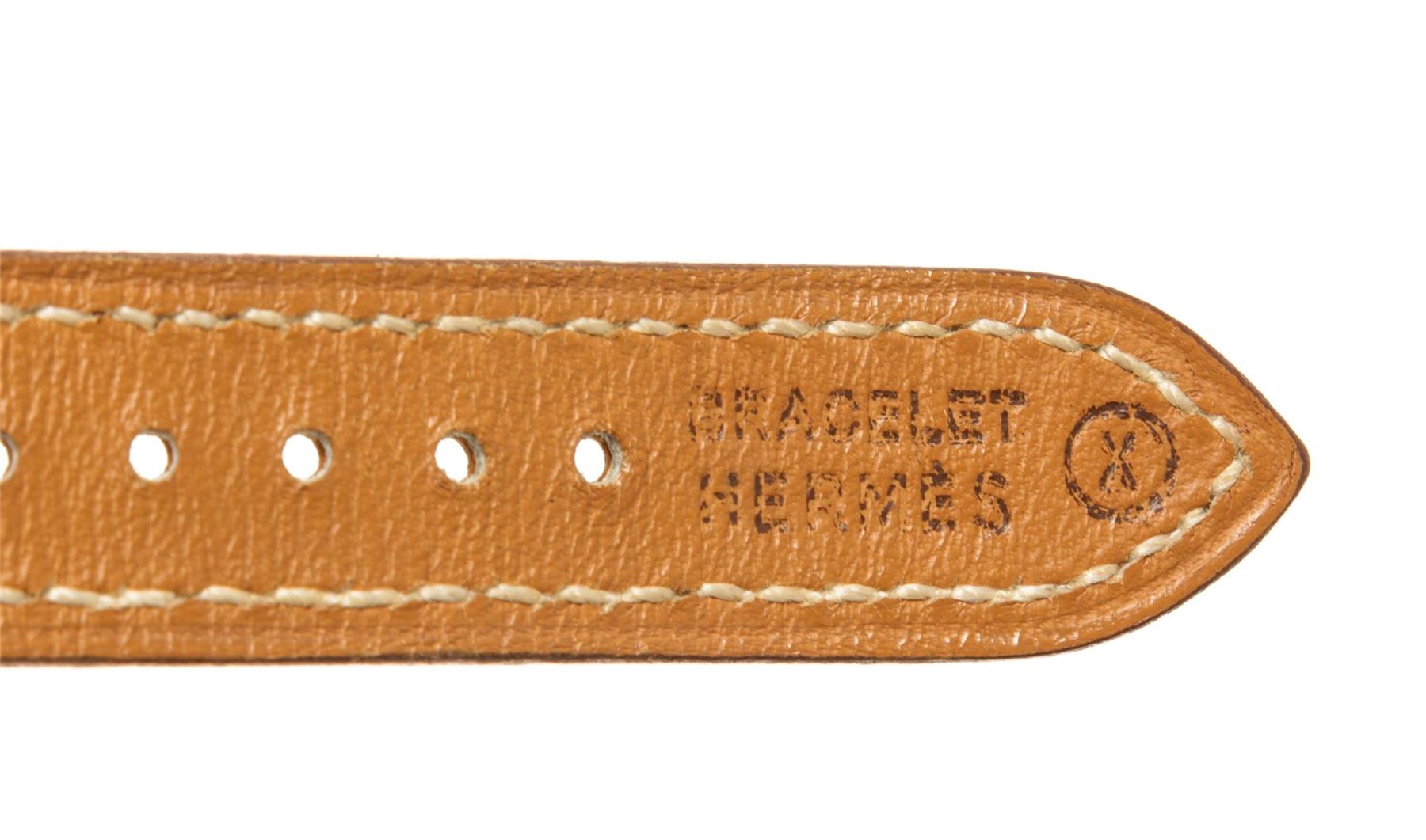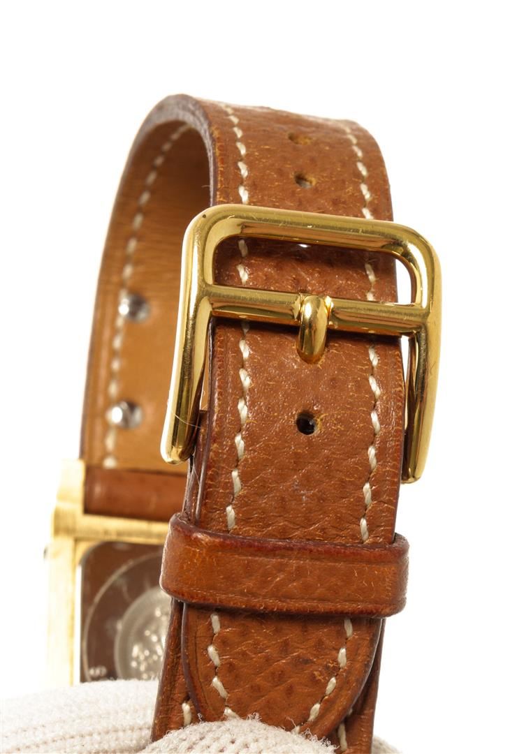 One Hermes Brown Metal and Leather Medor Plated 23 Quartz Watch. Item is sold AS-IS. All available information is listed in the description and shown in the photo. Hermes Brown Metal and Leather Medor Plated 23 Quartz Watch with dial color white, band color brown, band material leather, case material plated 18k yellow gold, movement quartz "Case Size/Width: 23mm Watch Height: 16mm Band Width: 18mm Wrist circumference: 6.0""" Height: 0.62" x Width: 0.70" Inches
