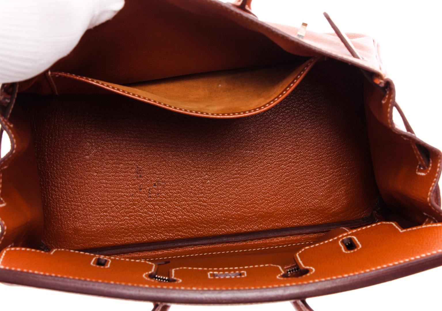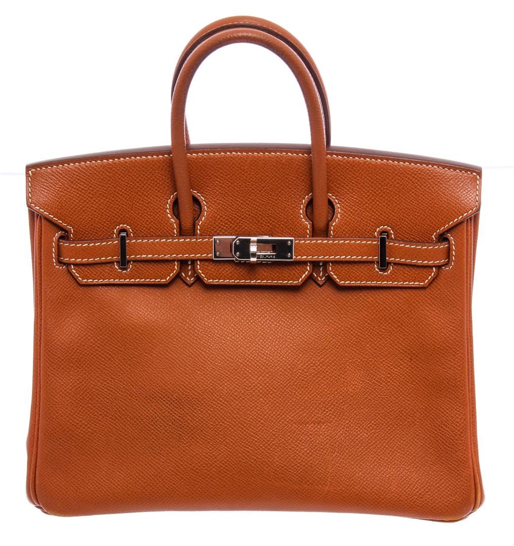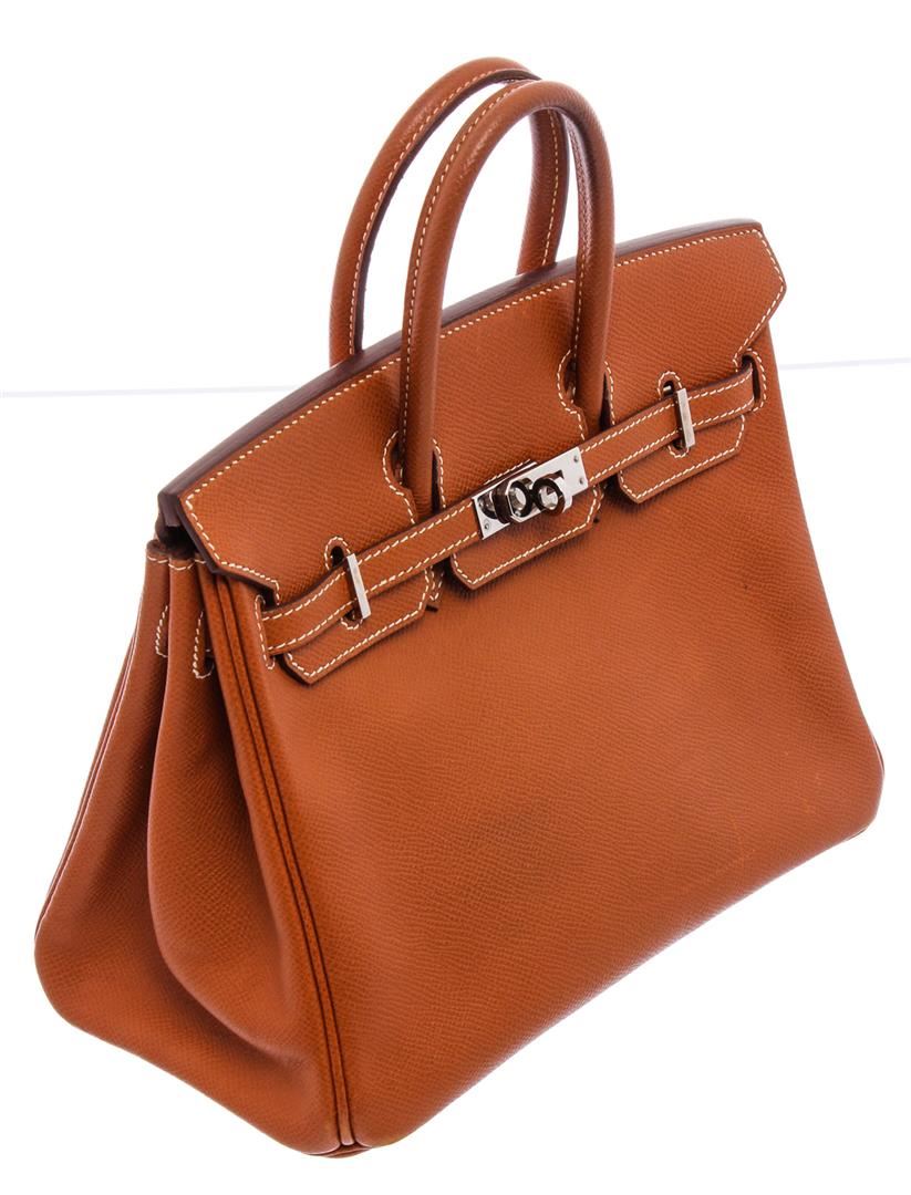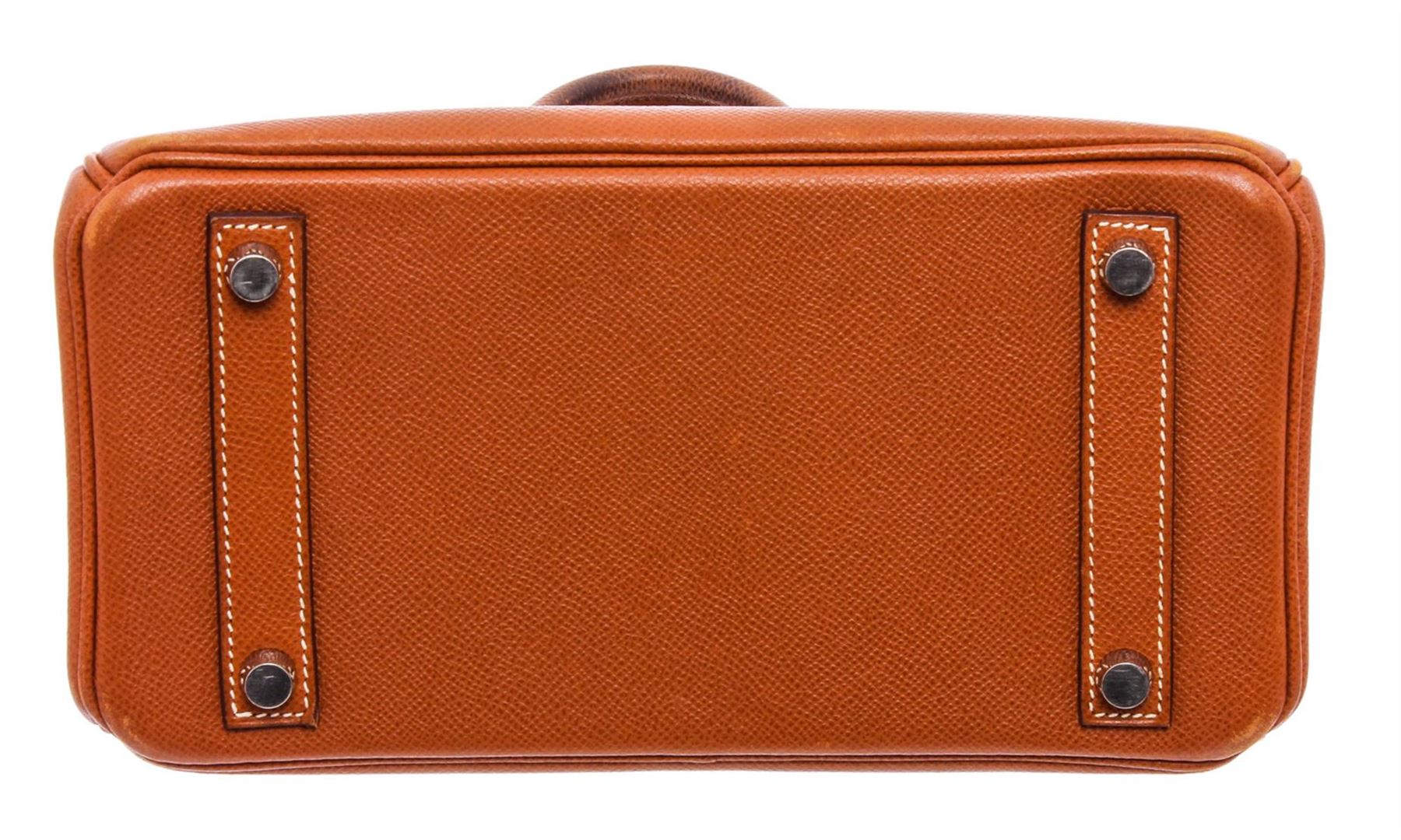 Brown Togo leather Hermes Birkin 25 with palladium-plated hardware, dual rolled top handles, sangle expansions at sides, foil stamped logo at flap underside, tonal leather lining, dual pockets at interior wall; one with zip closure and turn-lock closure at front flap.